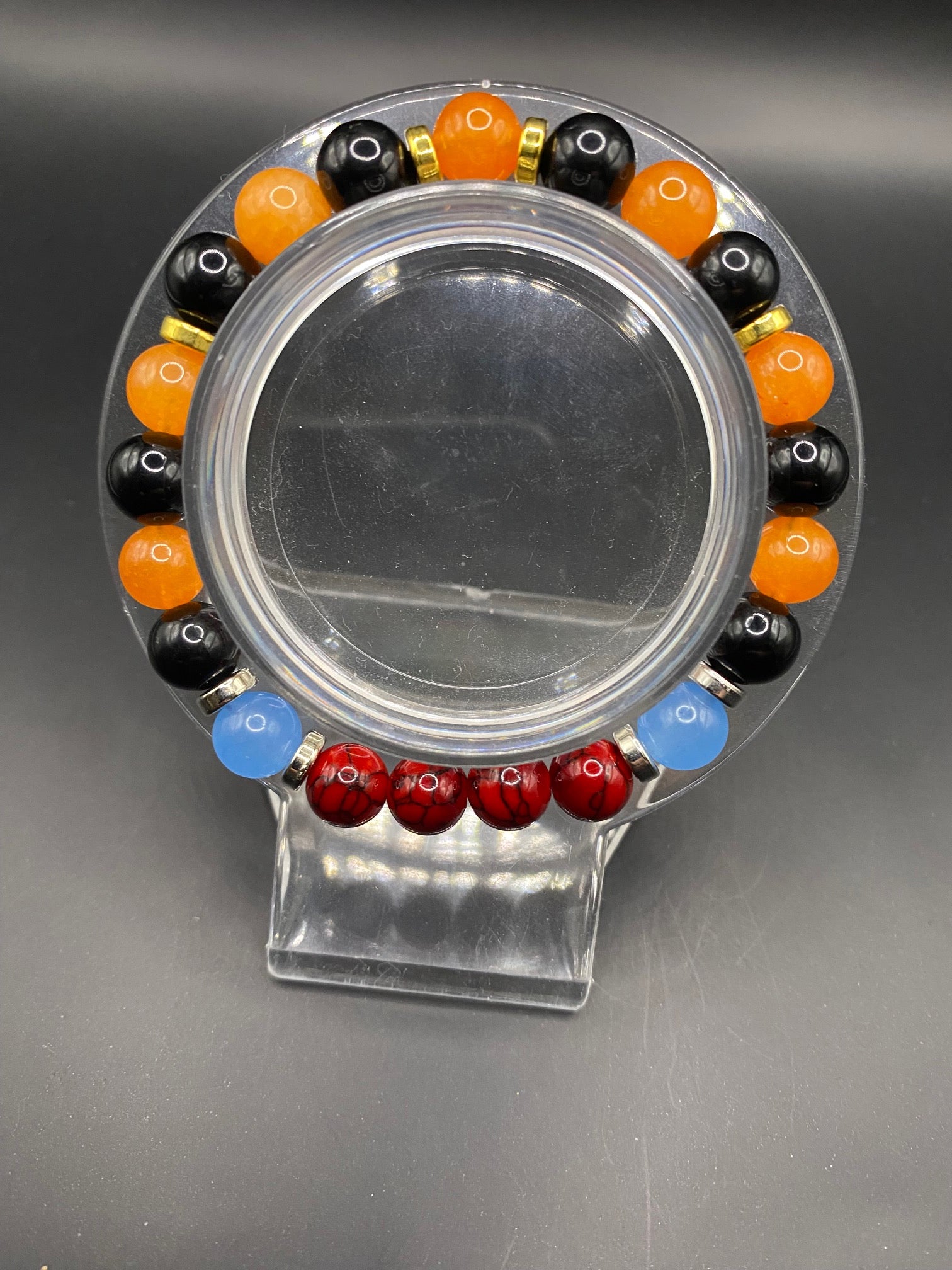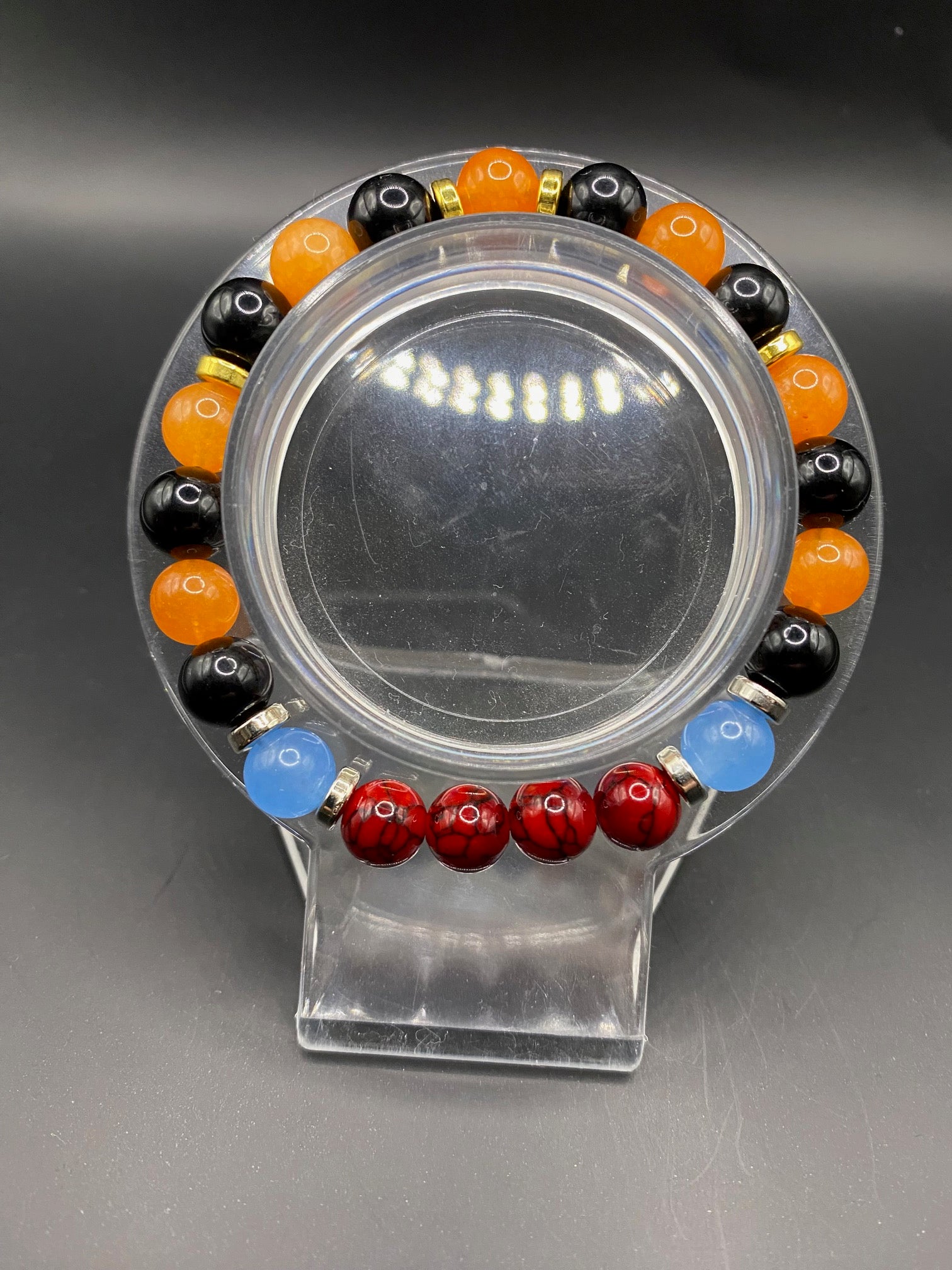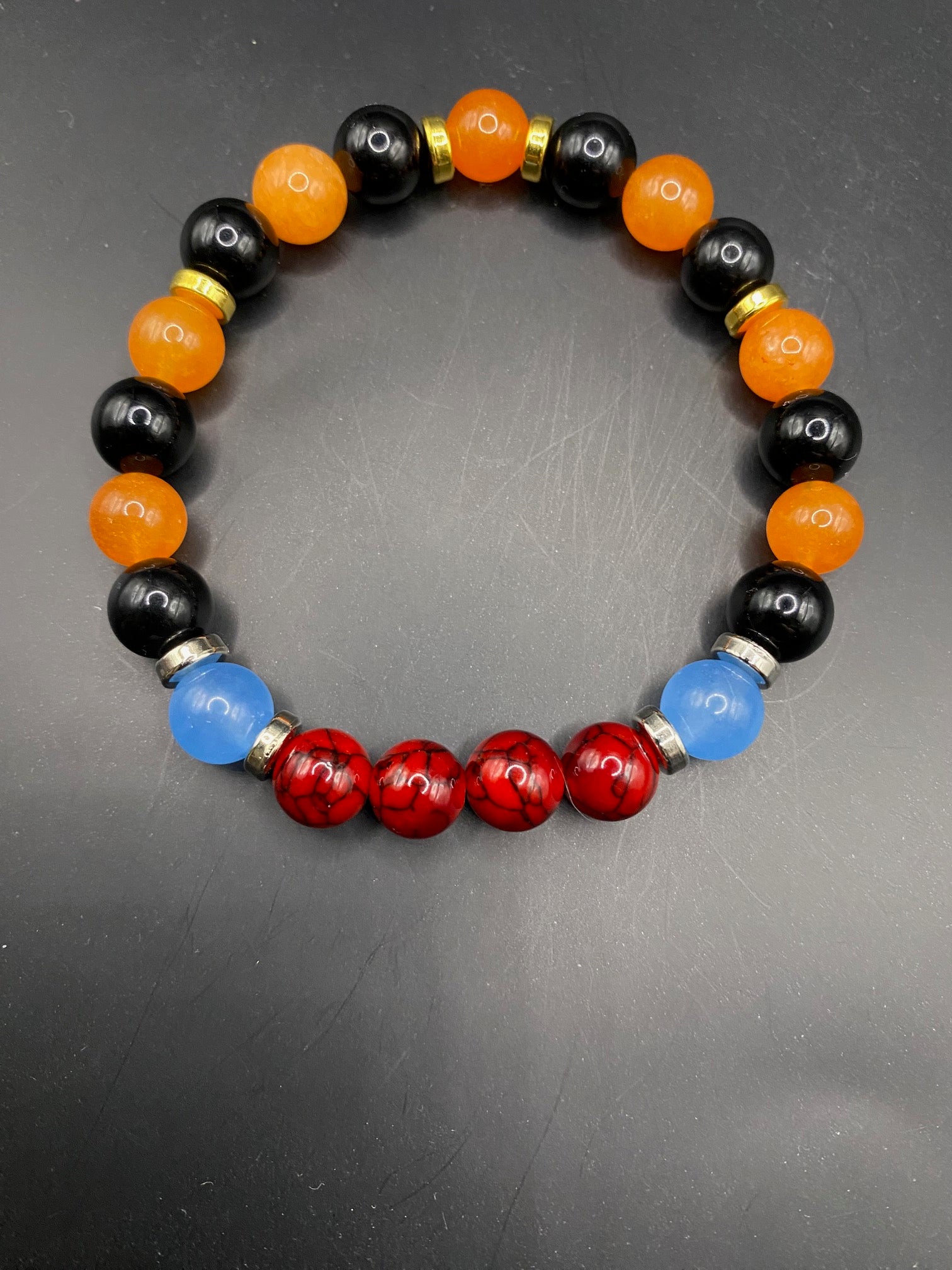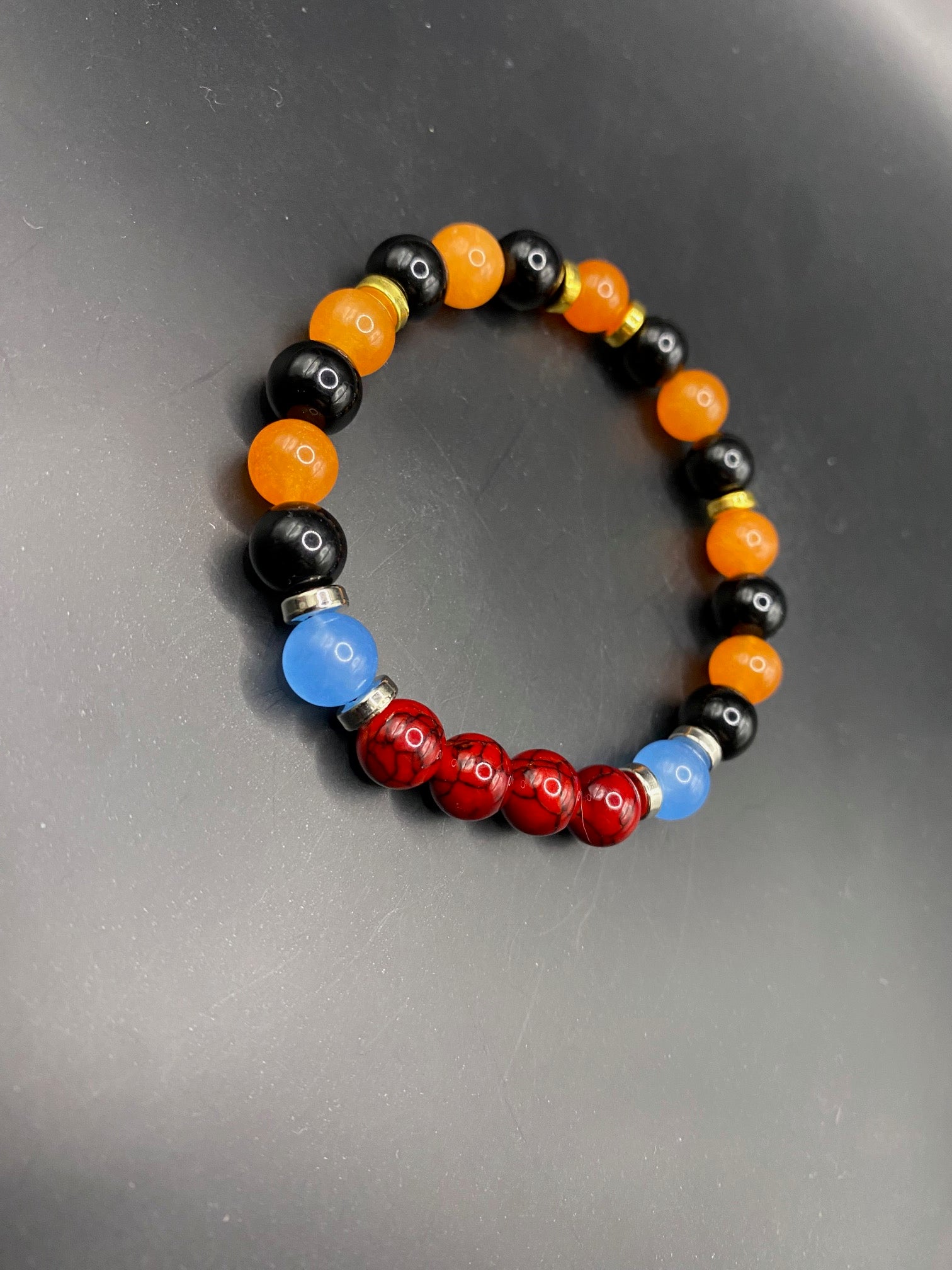 It's made with orange chalcedony, dyed red quartz, obsidian and blue chalcedony beads with silver colored spacers <3