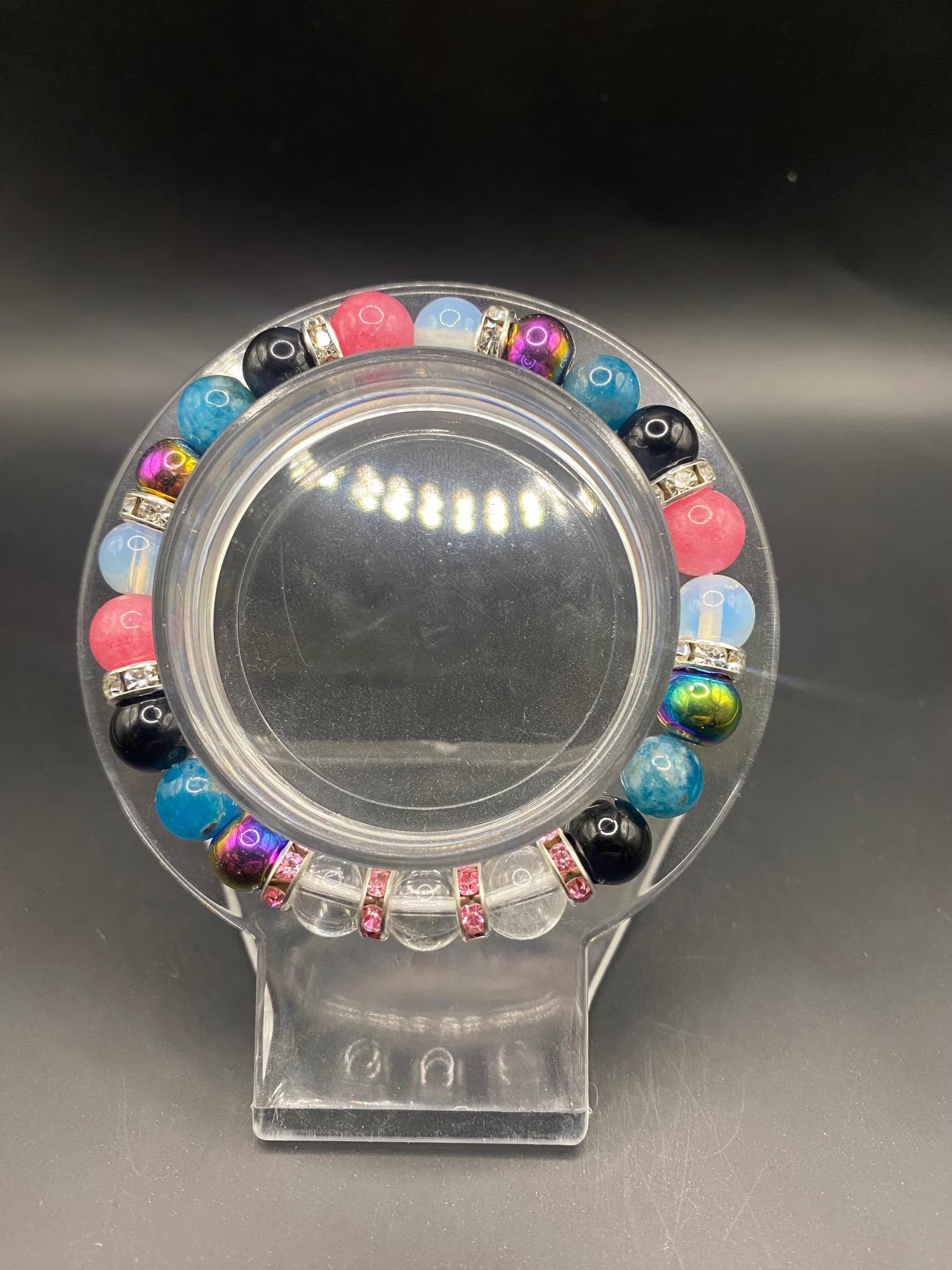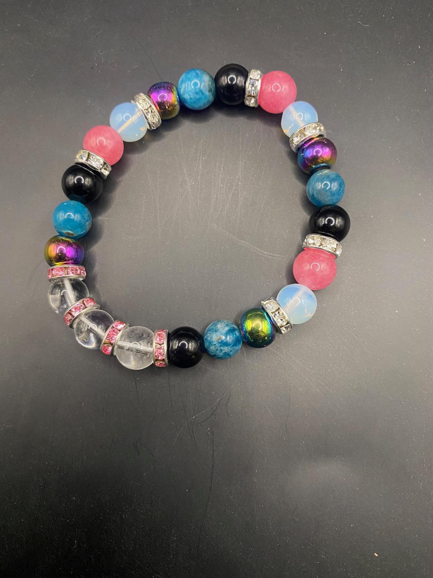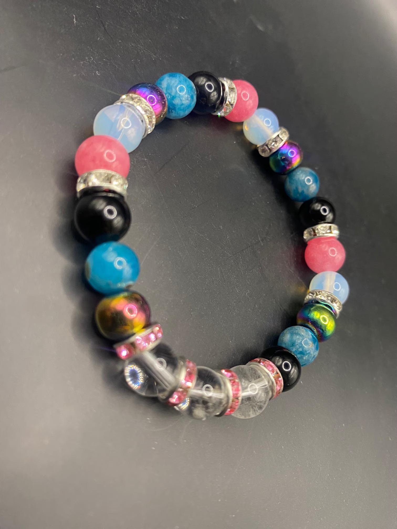 It's made with aura hematite, opalite, pink chalcedony, blue apatite obsidian and clear quartz beads with silver spacers <3