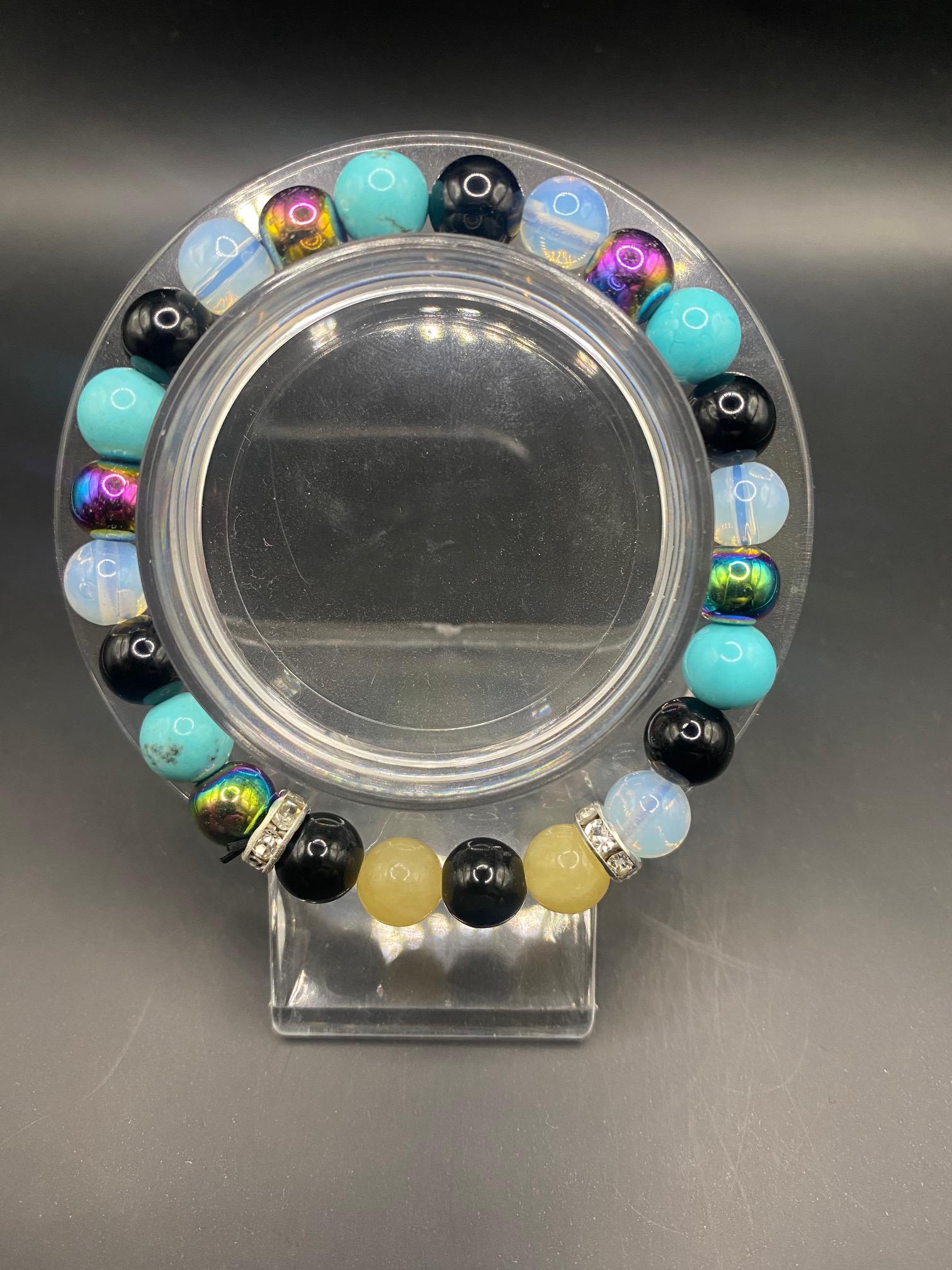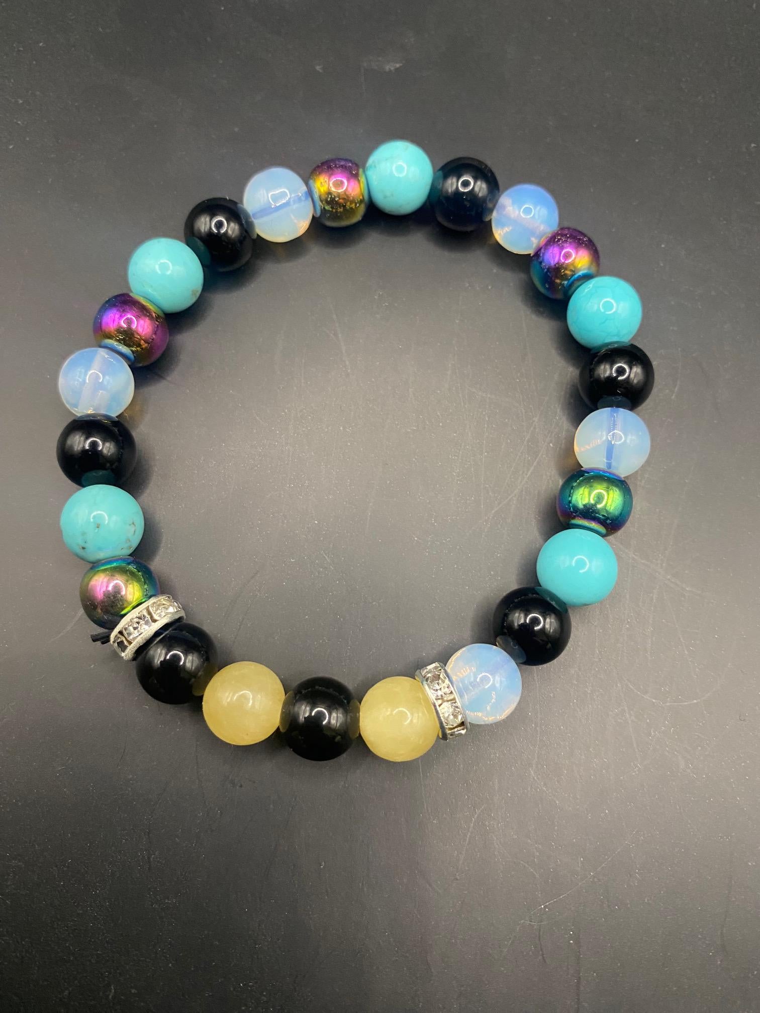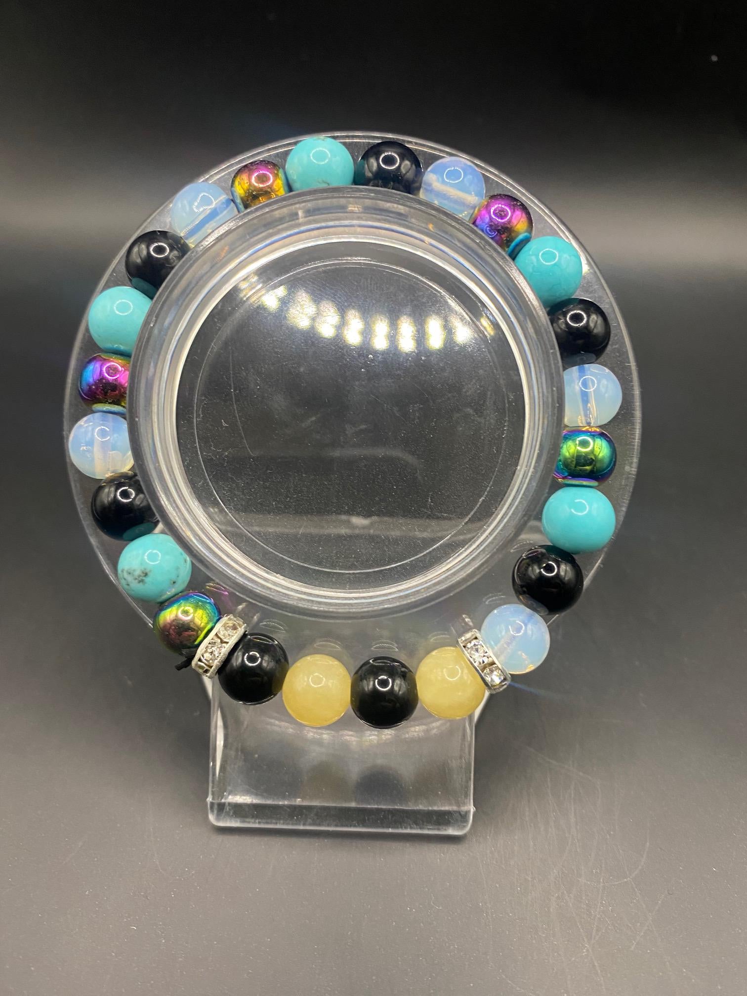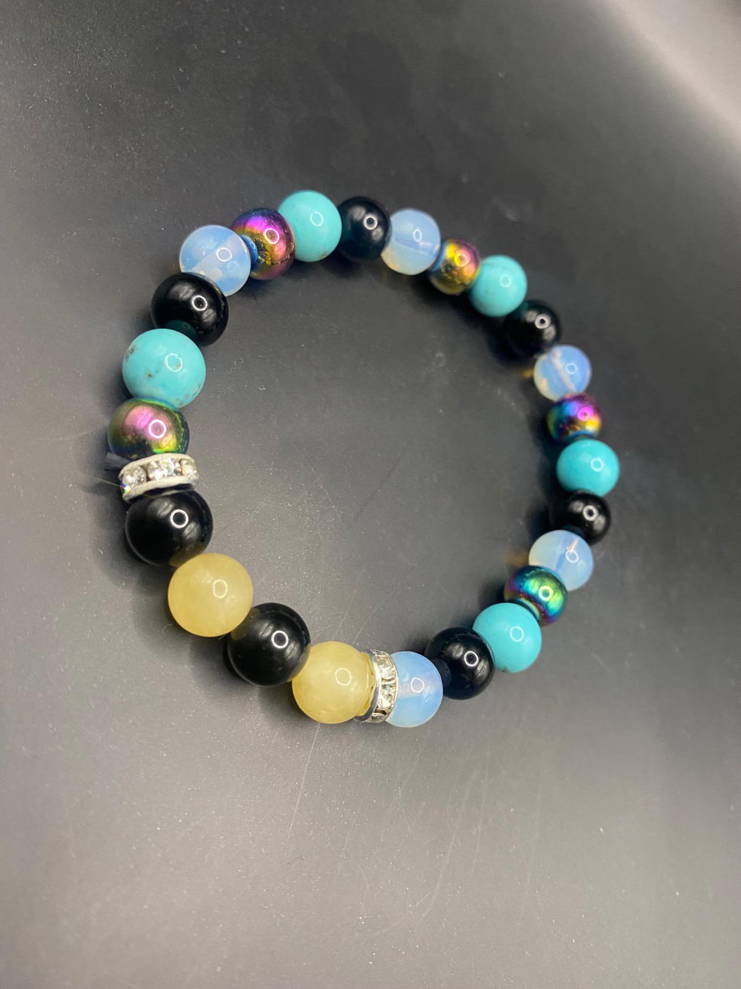 It's made with aura hematite, opalite, obsidian, honey calcite and dyed turquoise beads with silver spacers <3