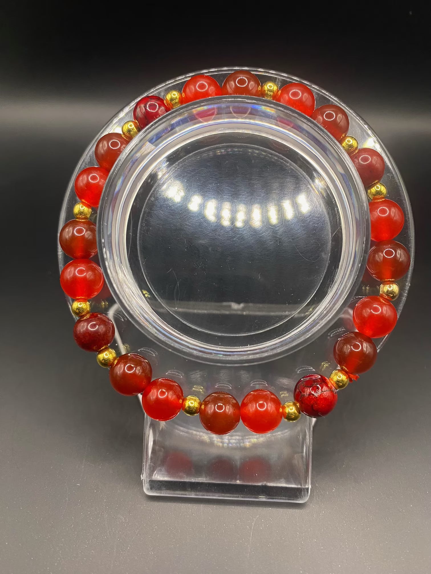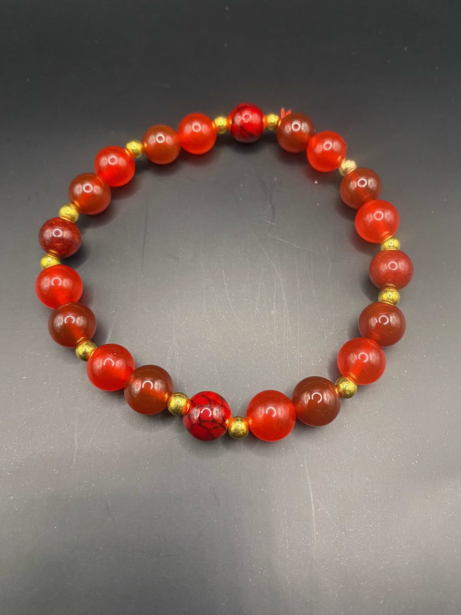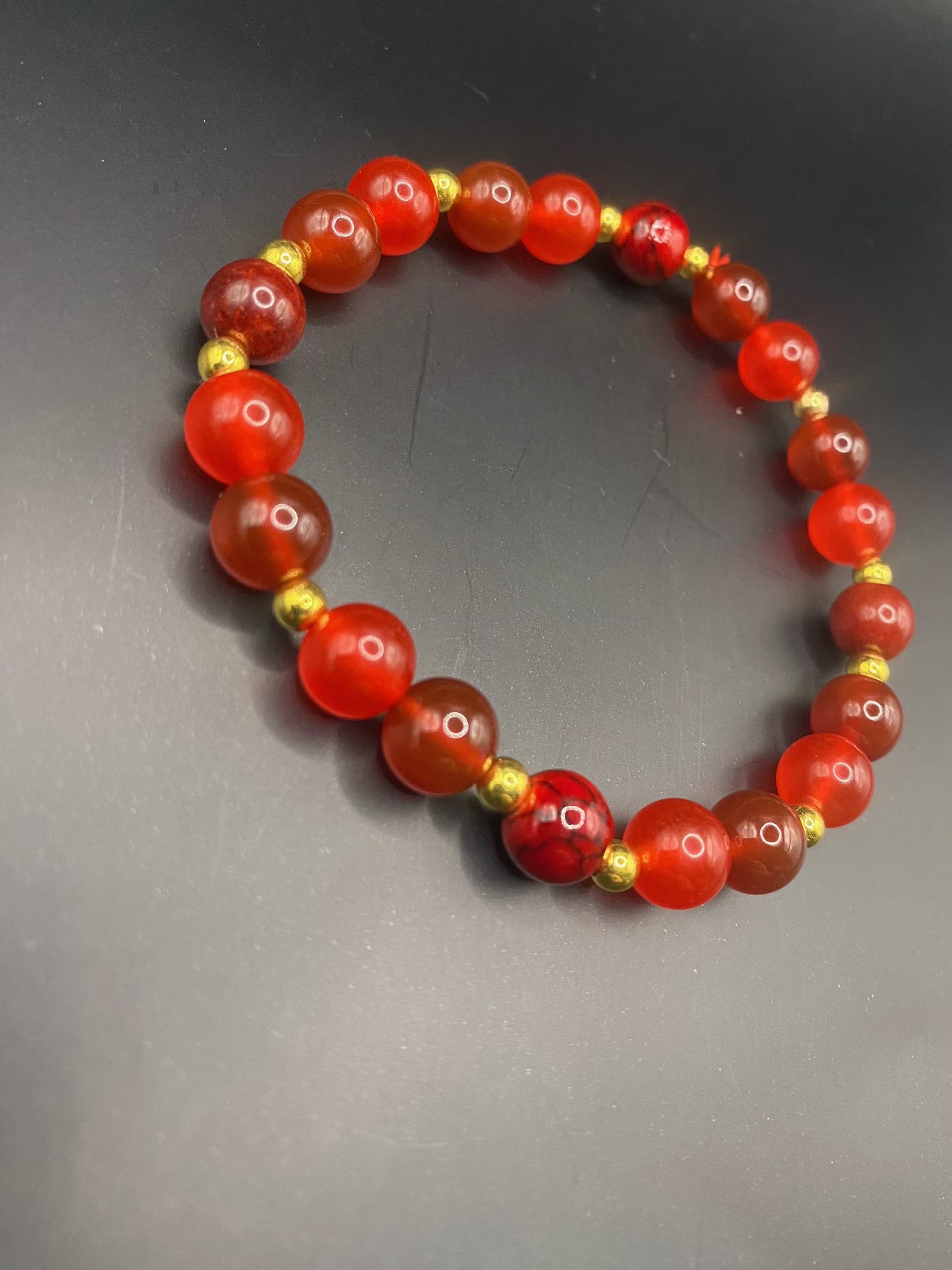 It's made with red coral, dyed quartz and carnelian with gold spacers <3