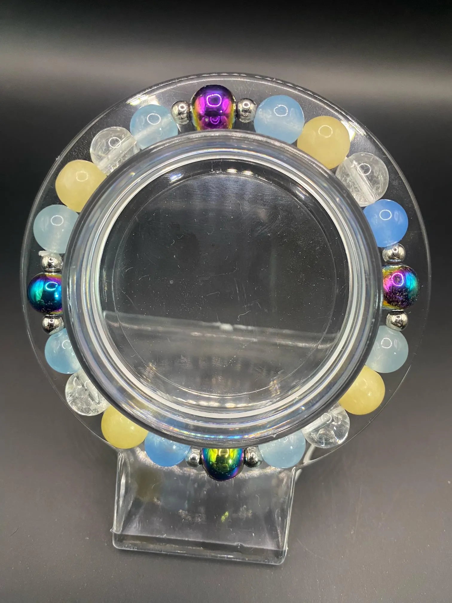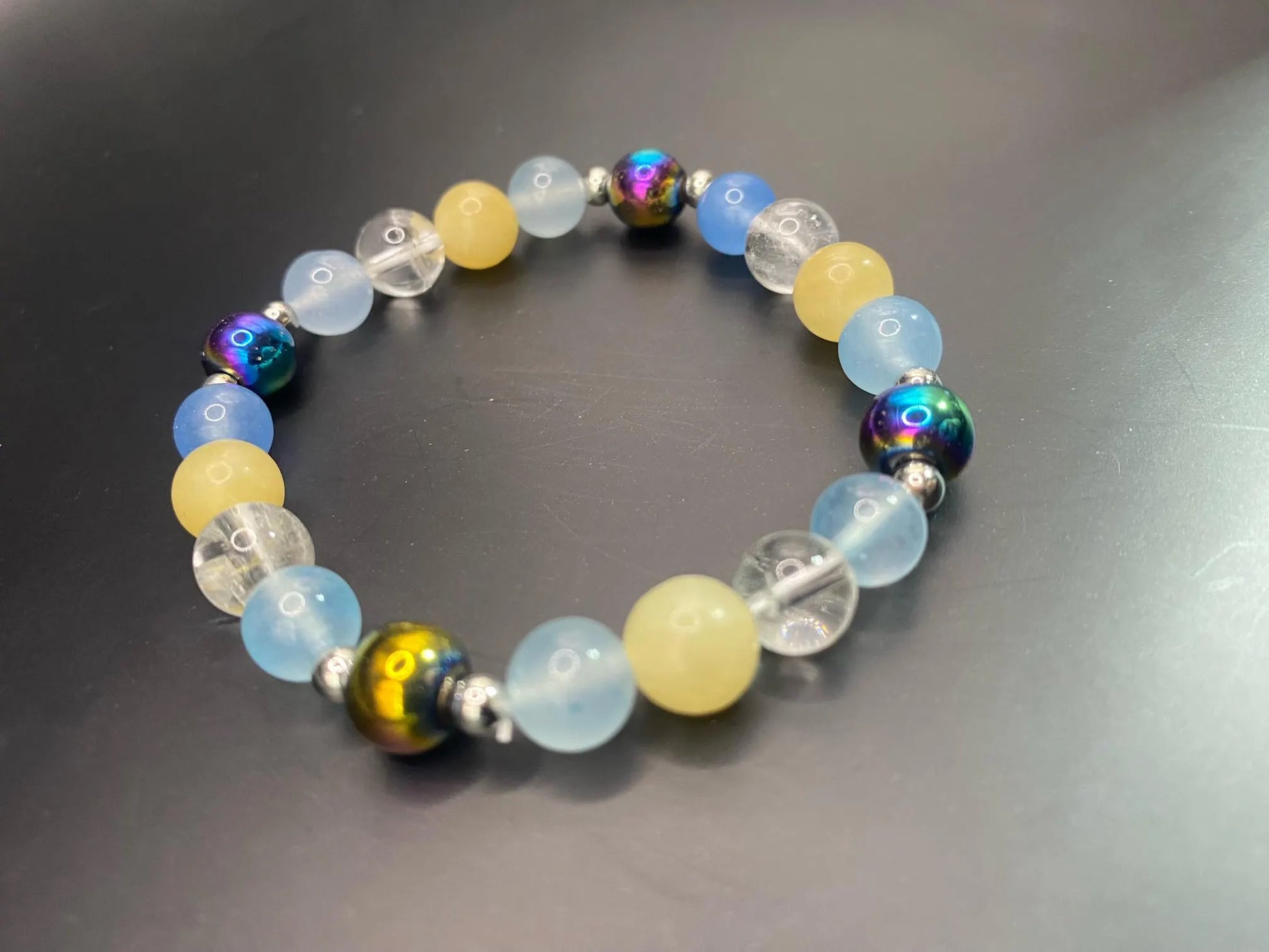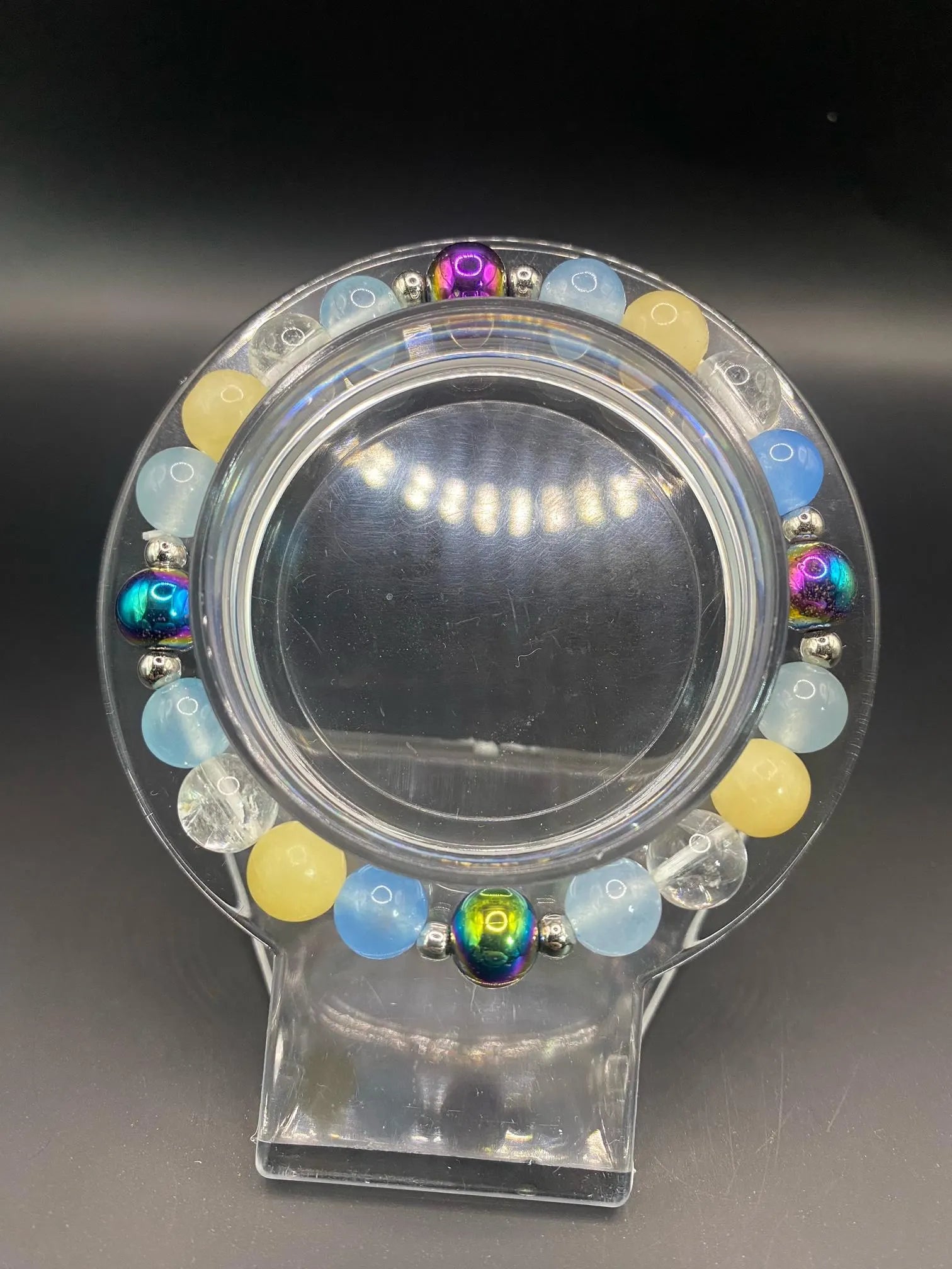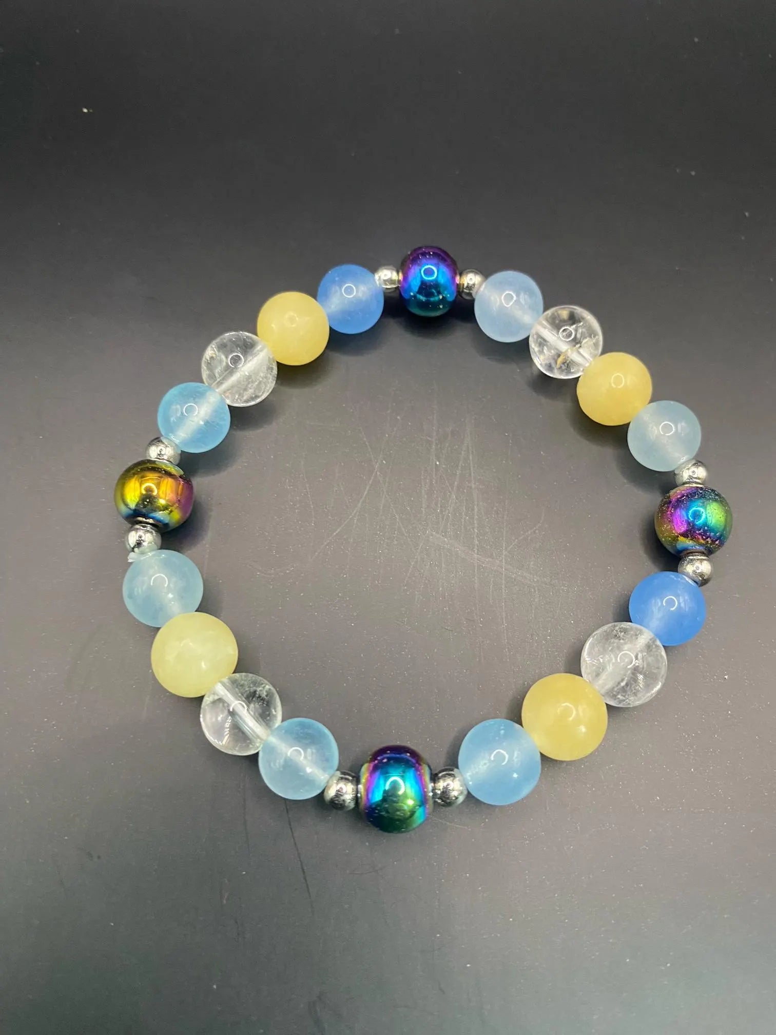 It's made with blue aventurine, clear quartz, honey calcite and aura hematite with plain and star shaped  silver colored spacers <3