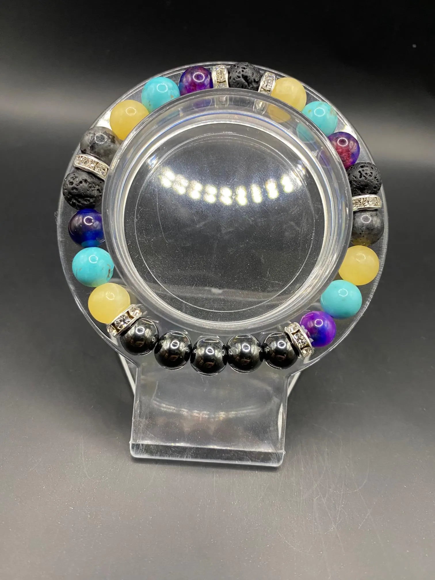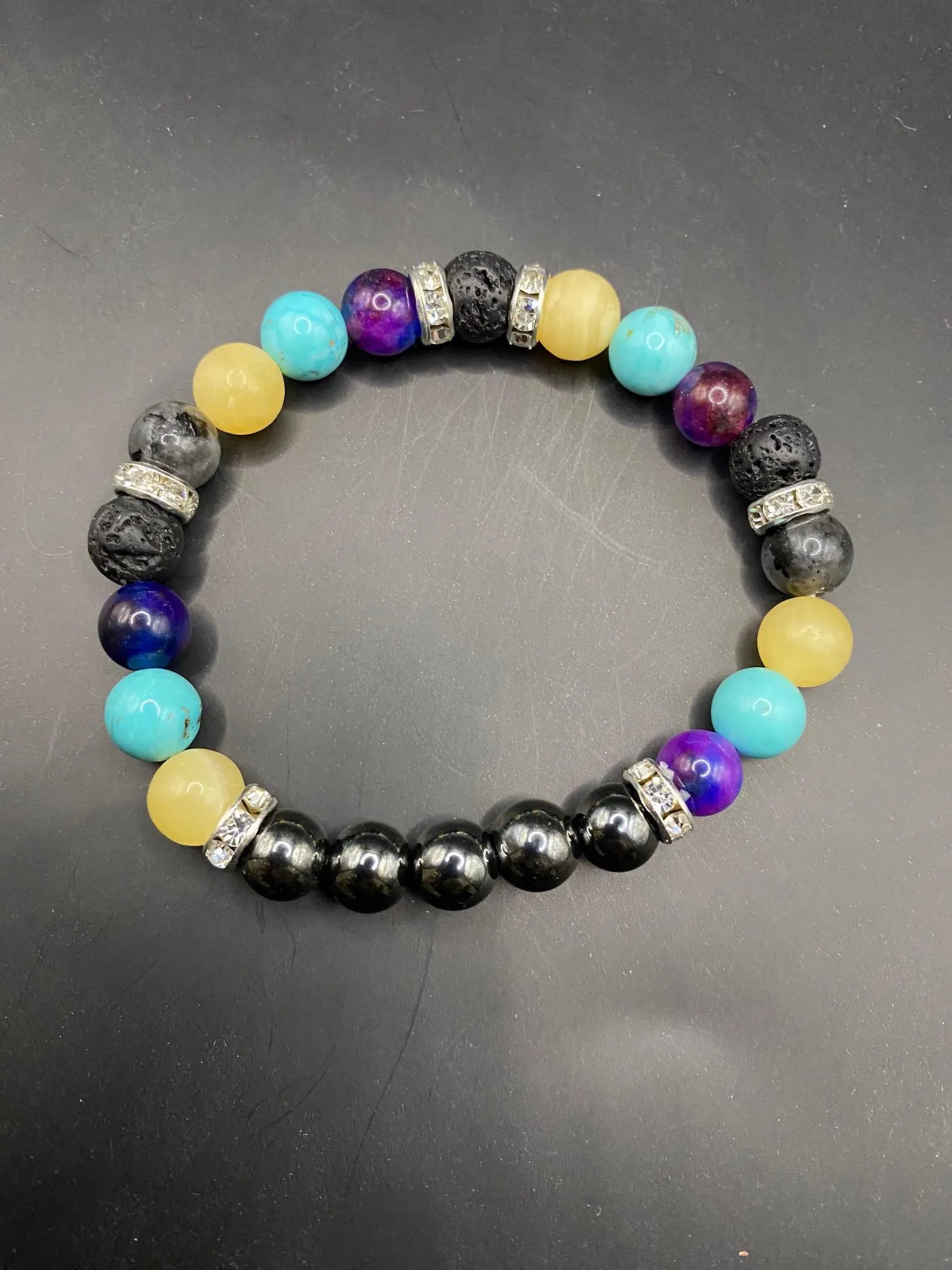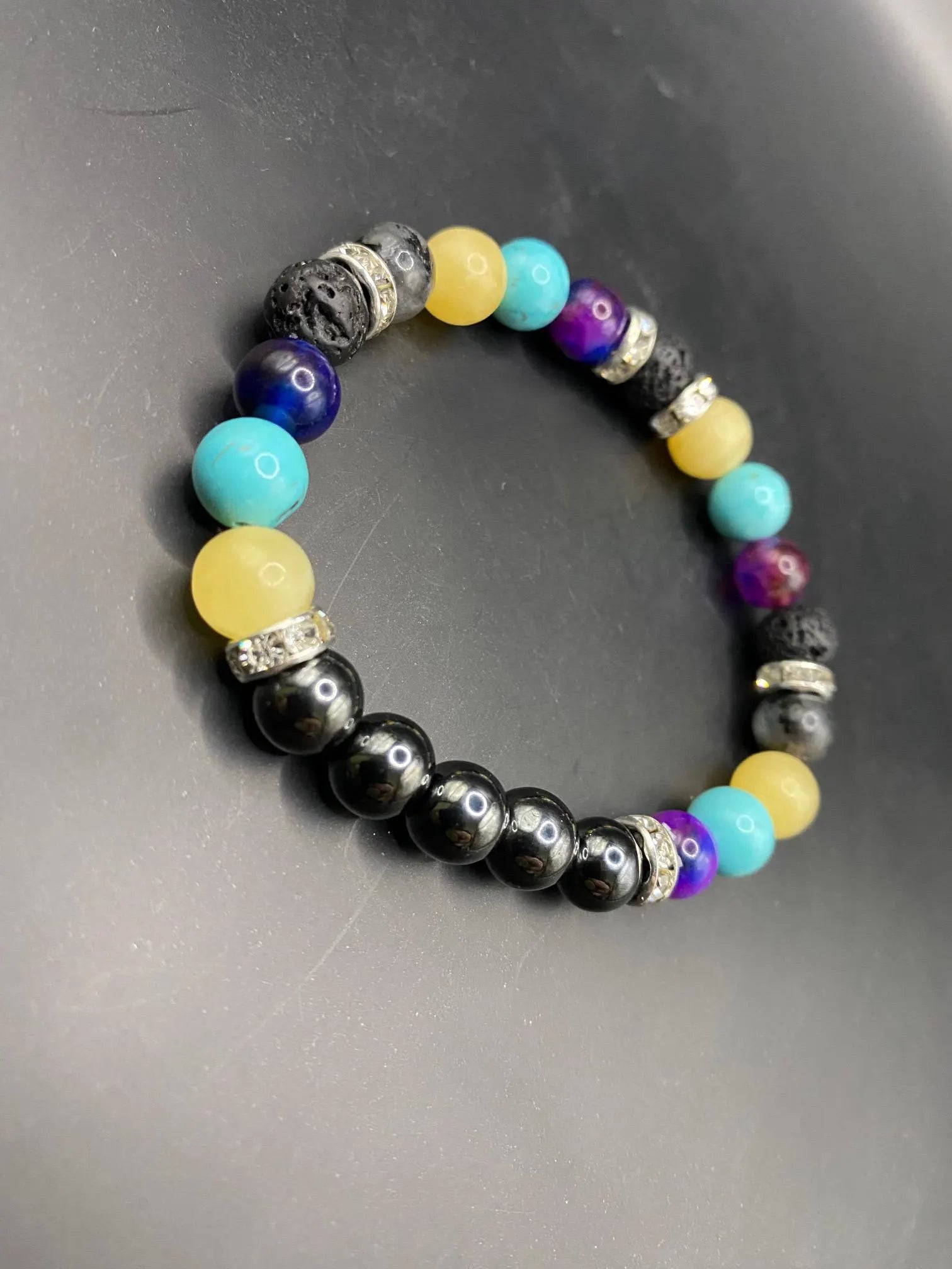 It's made with hematite, dyed turquoise, dyed chalcedony, larvikite. lava rock and honey calcite beads with silver spacers <3