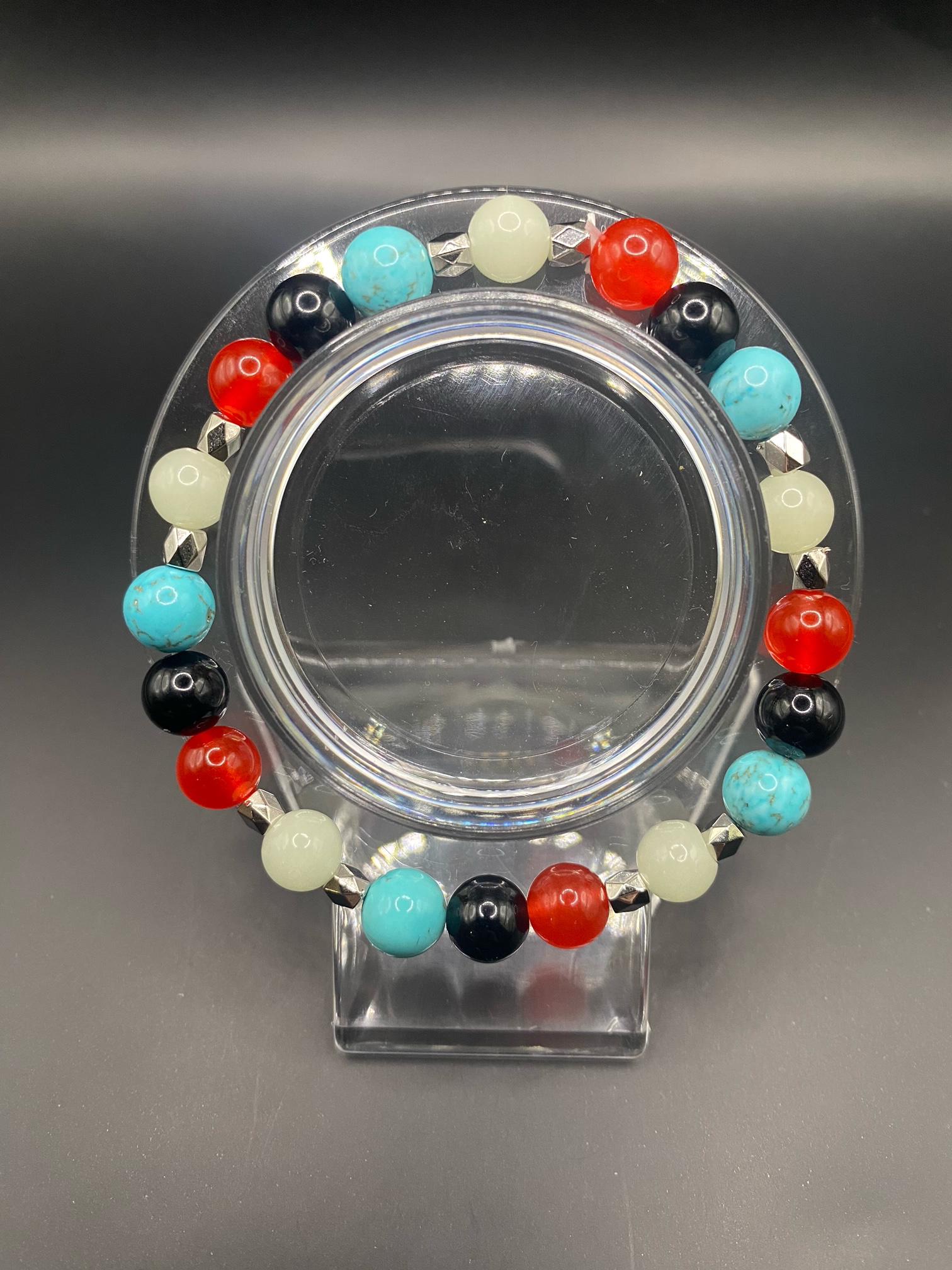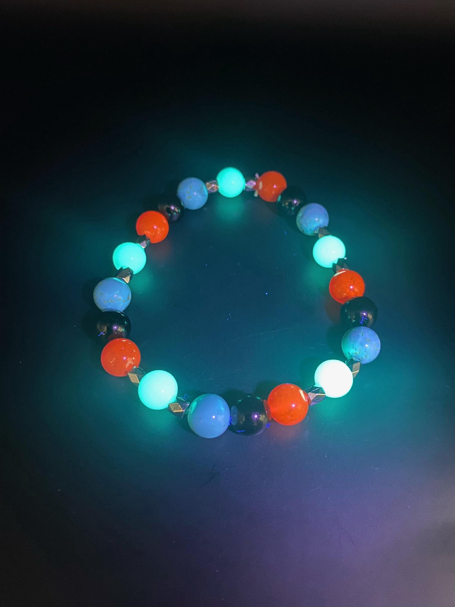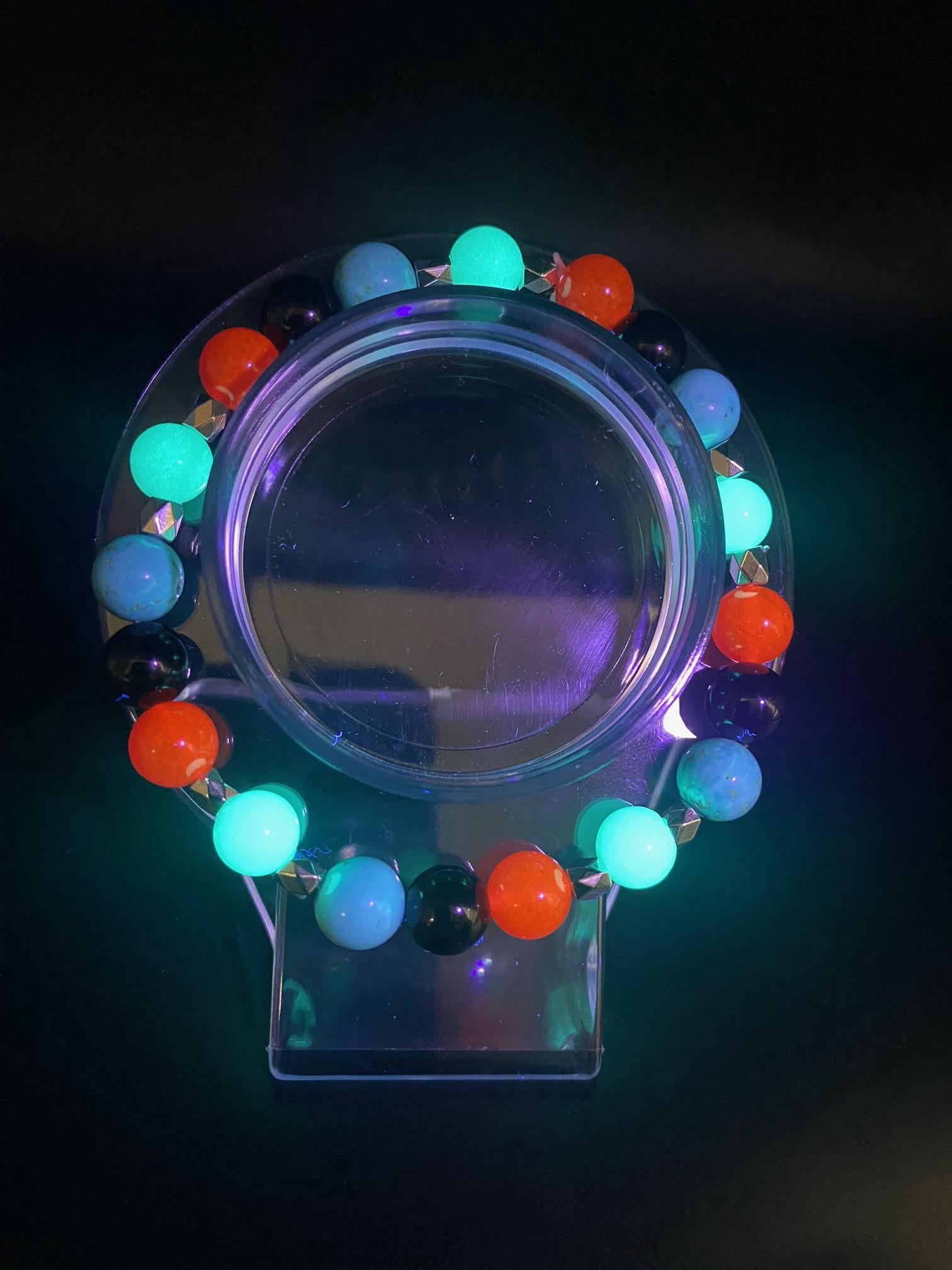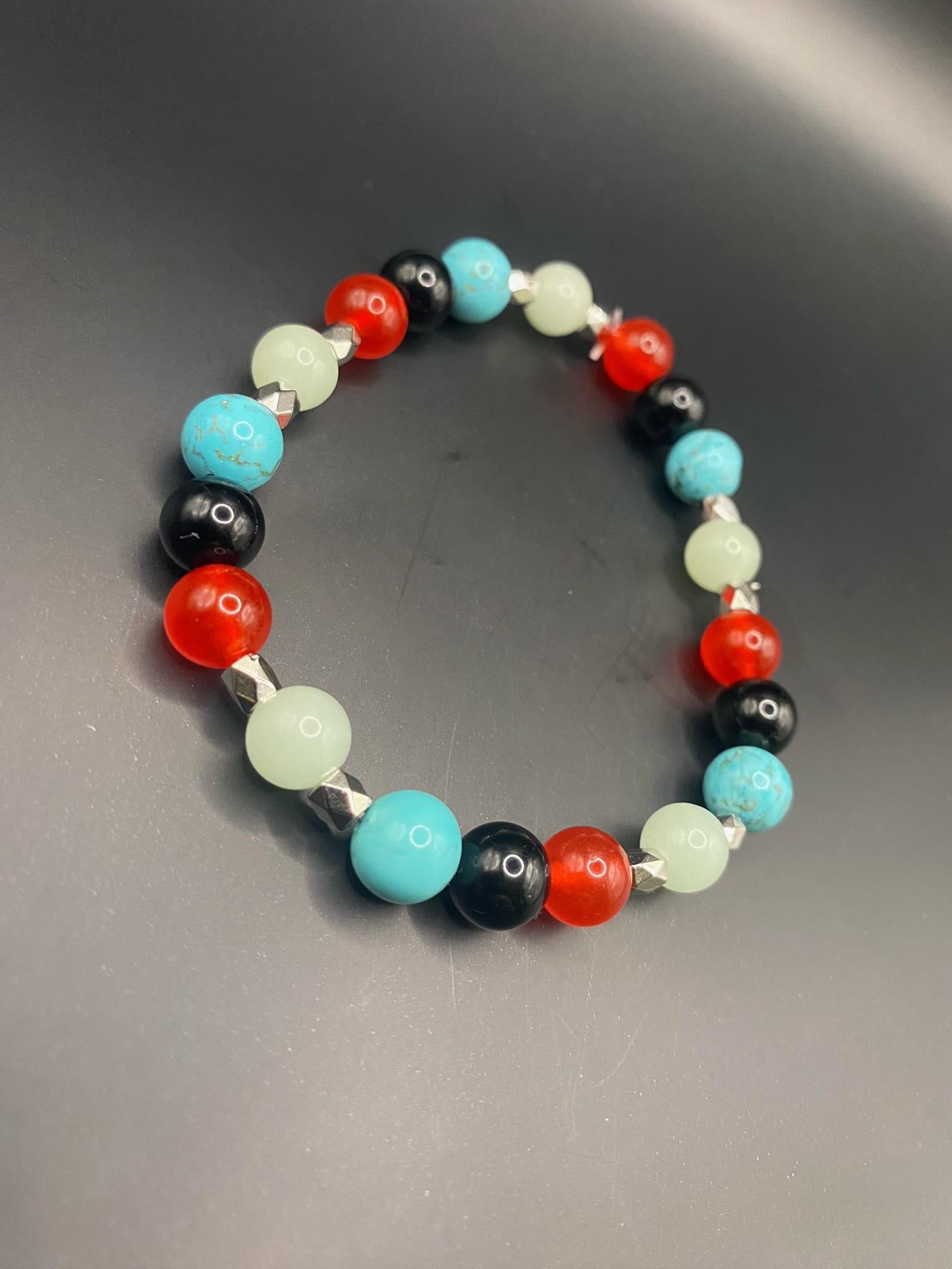 It's made with red coral jade, blue turquoise, obsidian and luminous stone (glows under UV!) with silver spacers <3