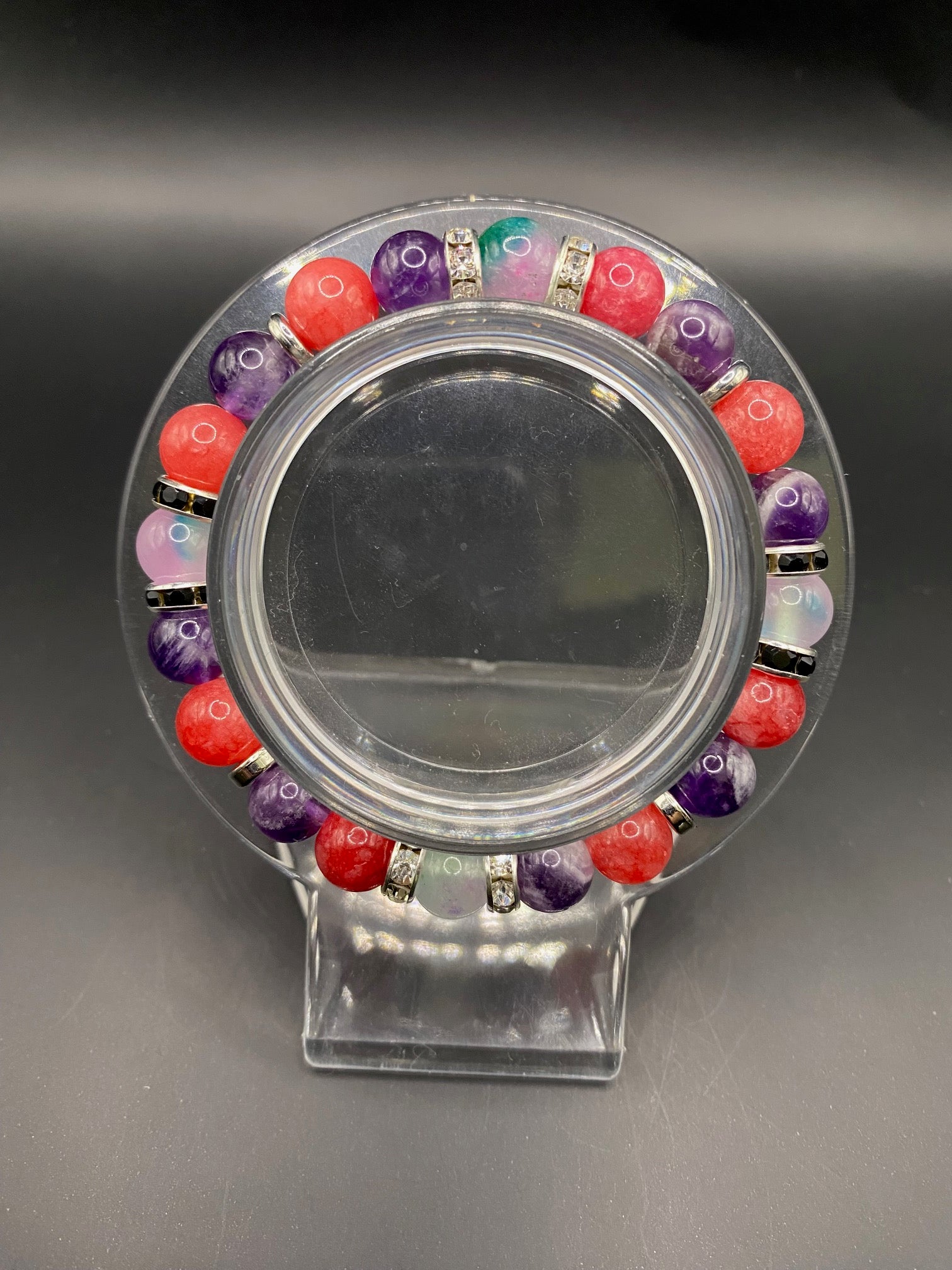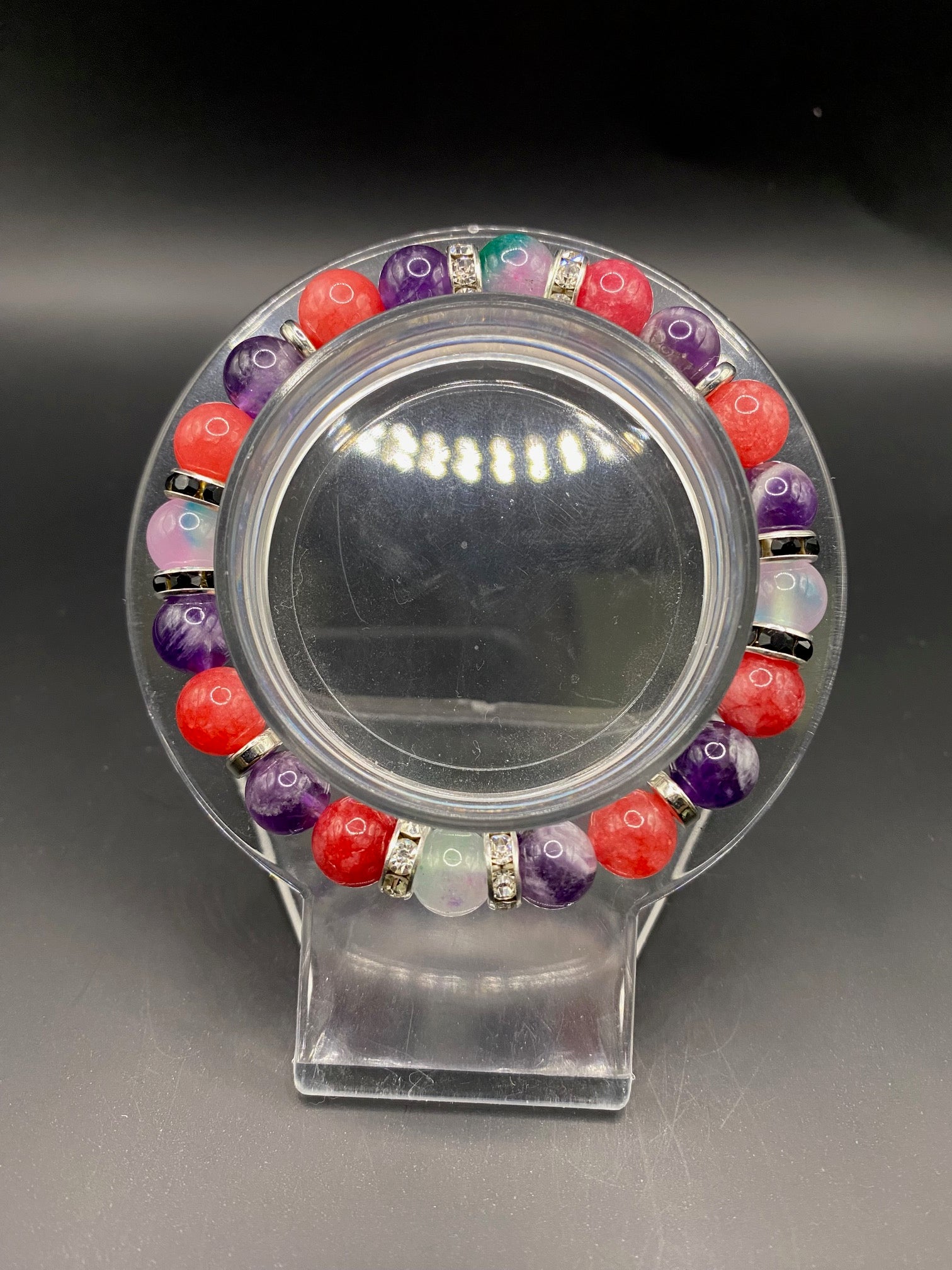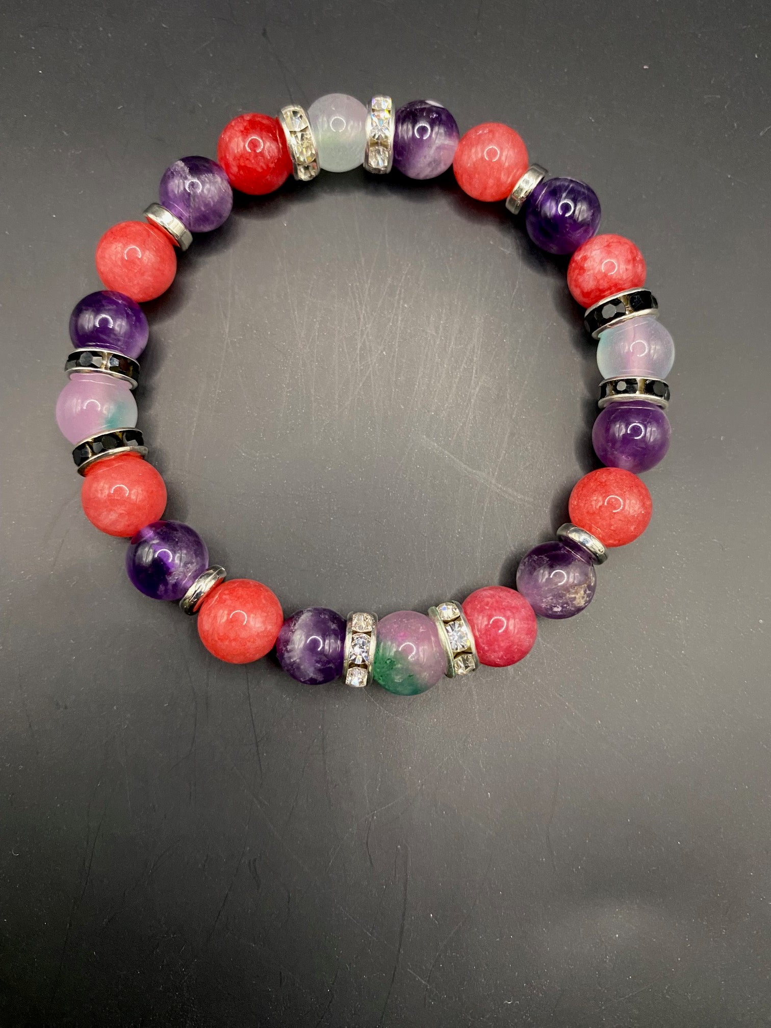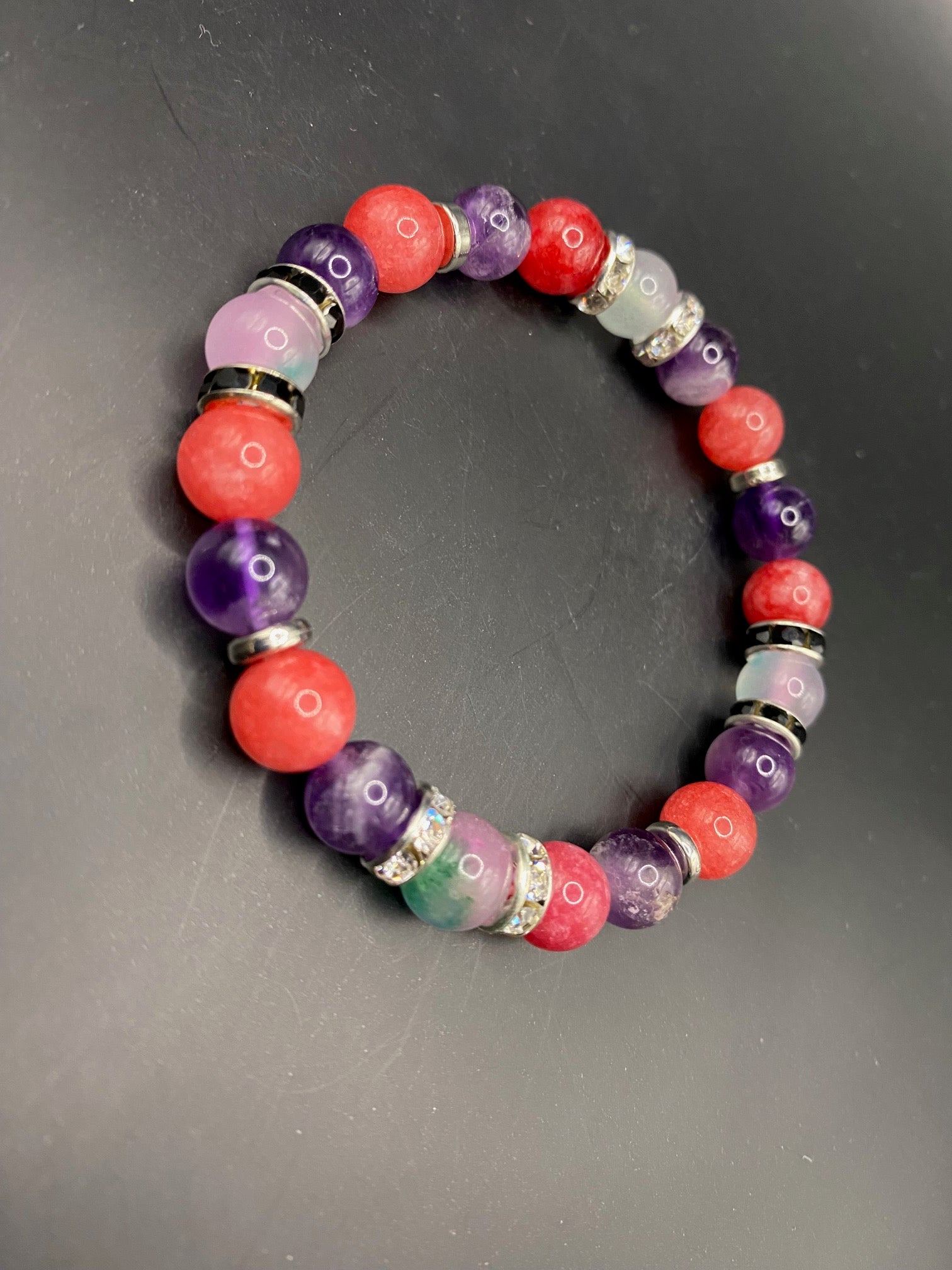 It's made with pink chalcedony, amethyst and dyed chalcedony beads with silver colored spacers <3