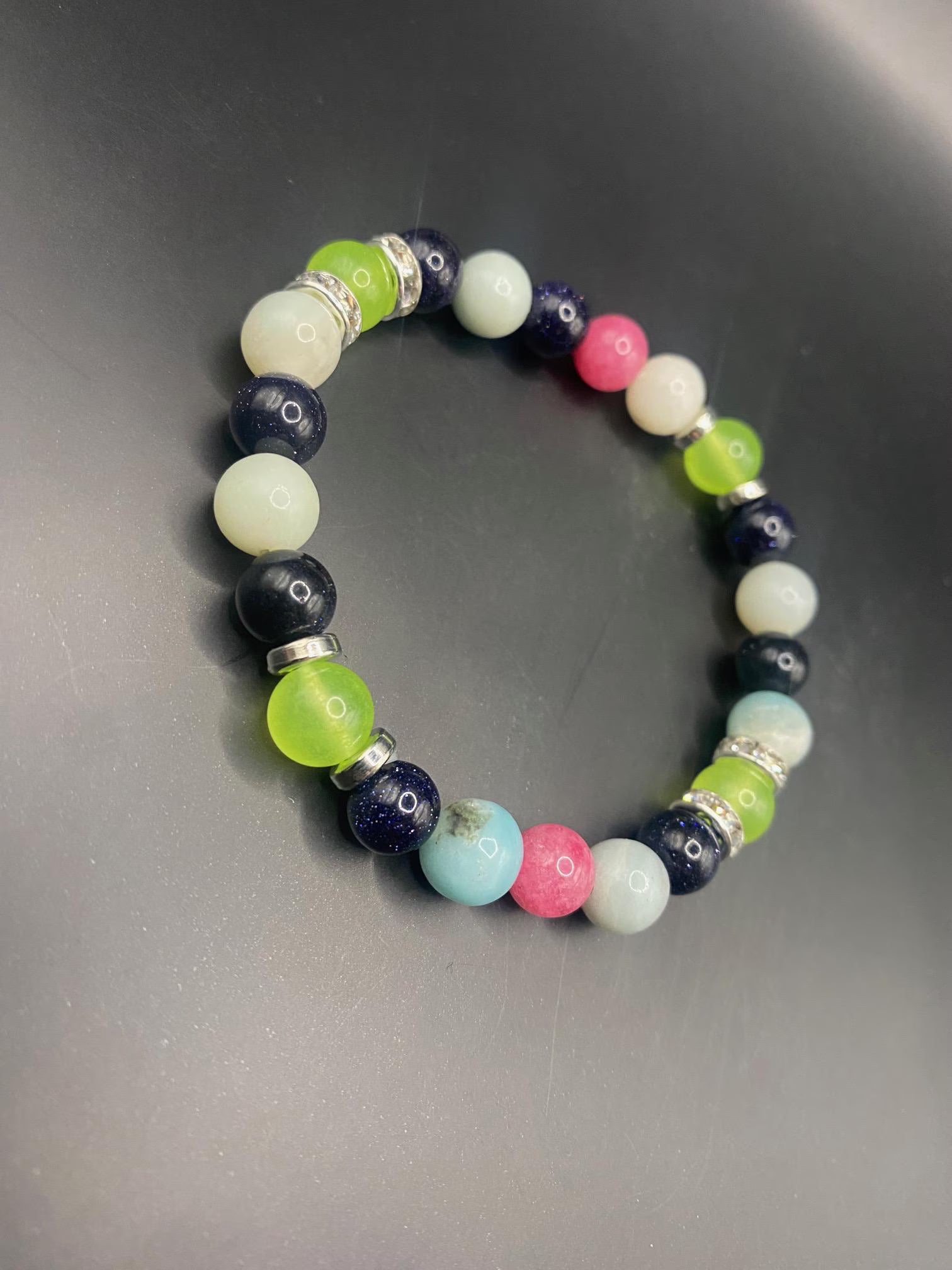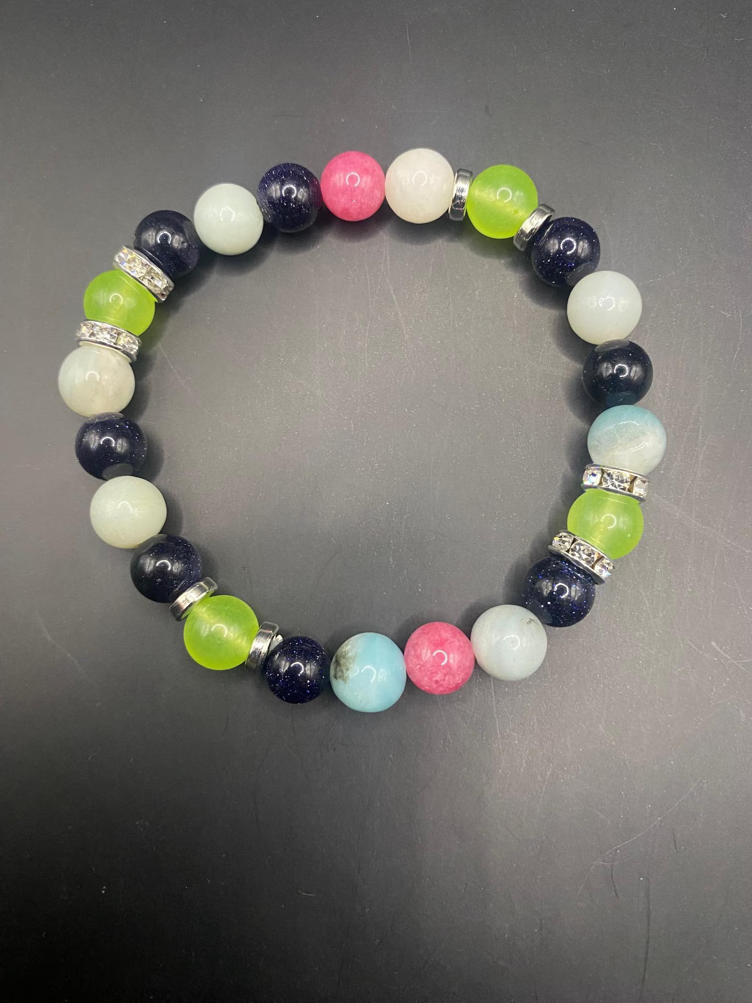 It's made with amazonite, blue sandstone, apple chalcedony and pink chalcedony stone beads with silver spacers <3