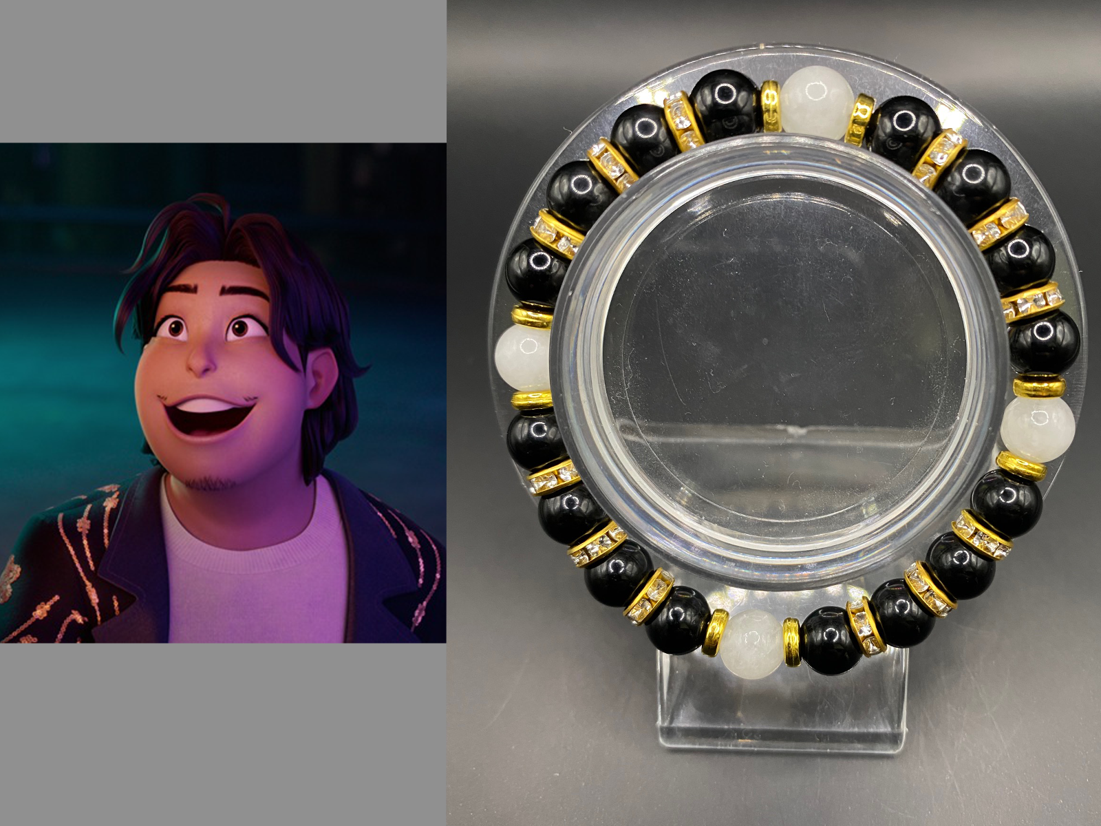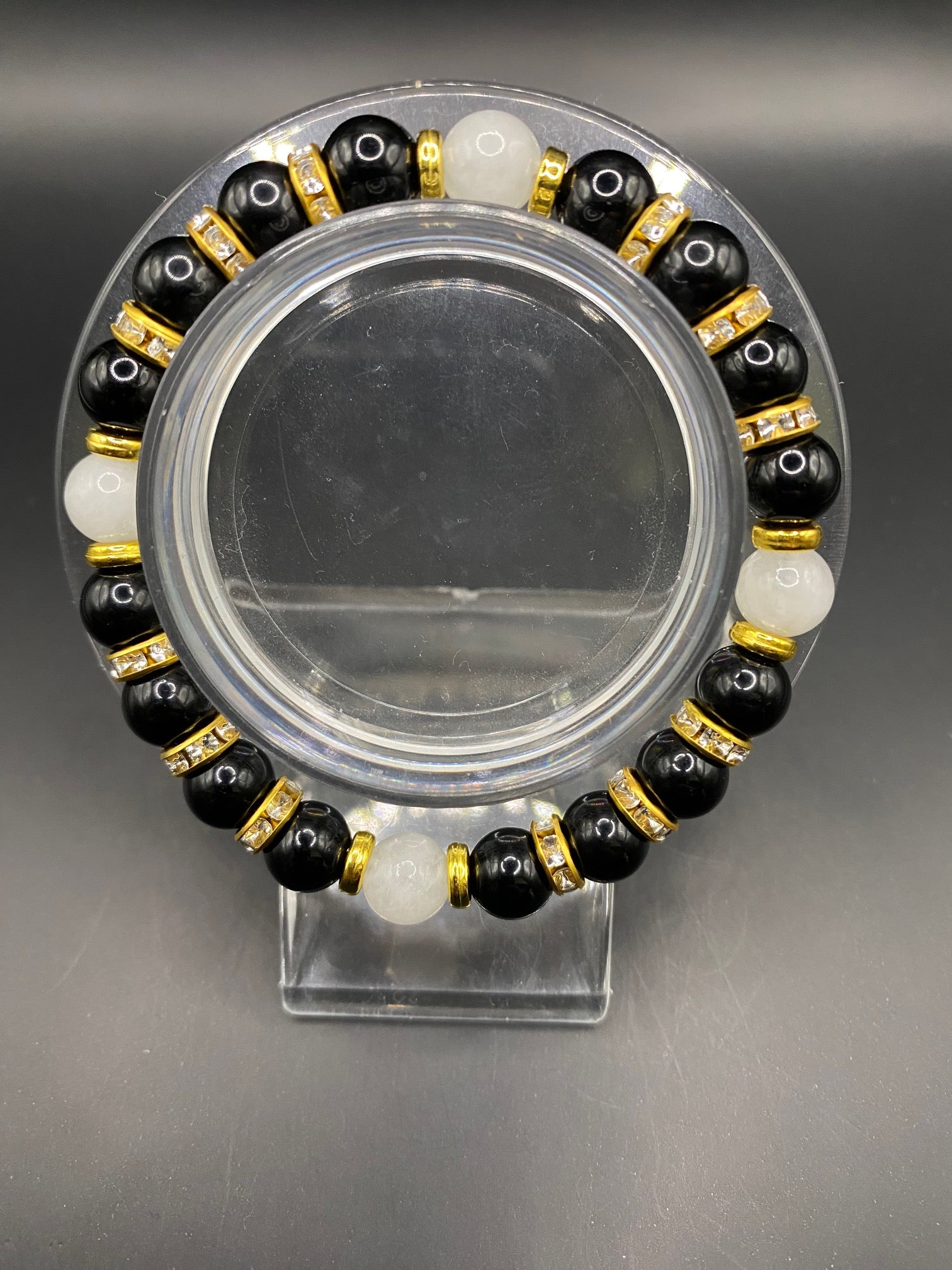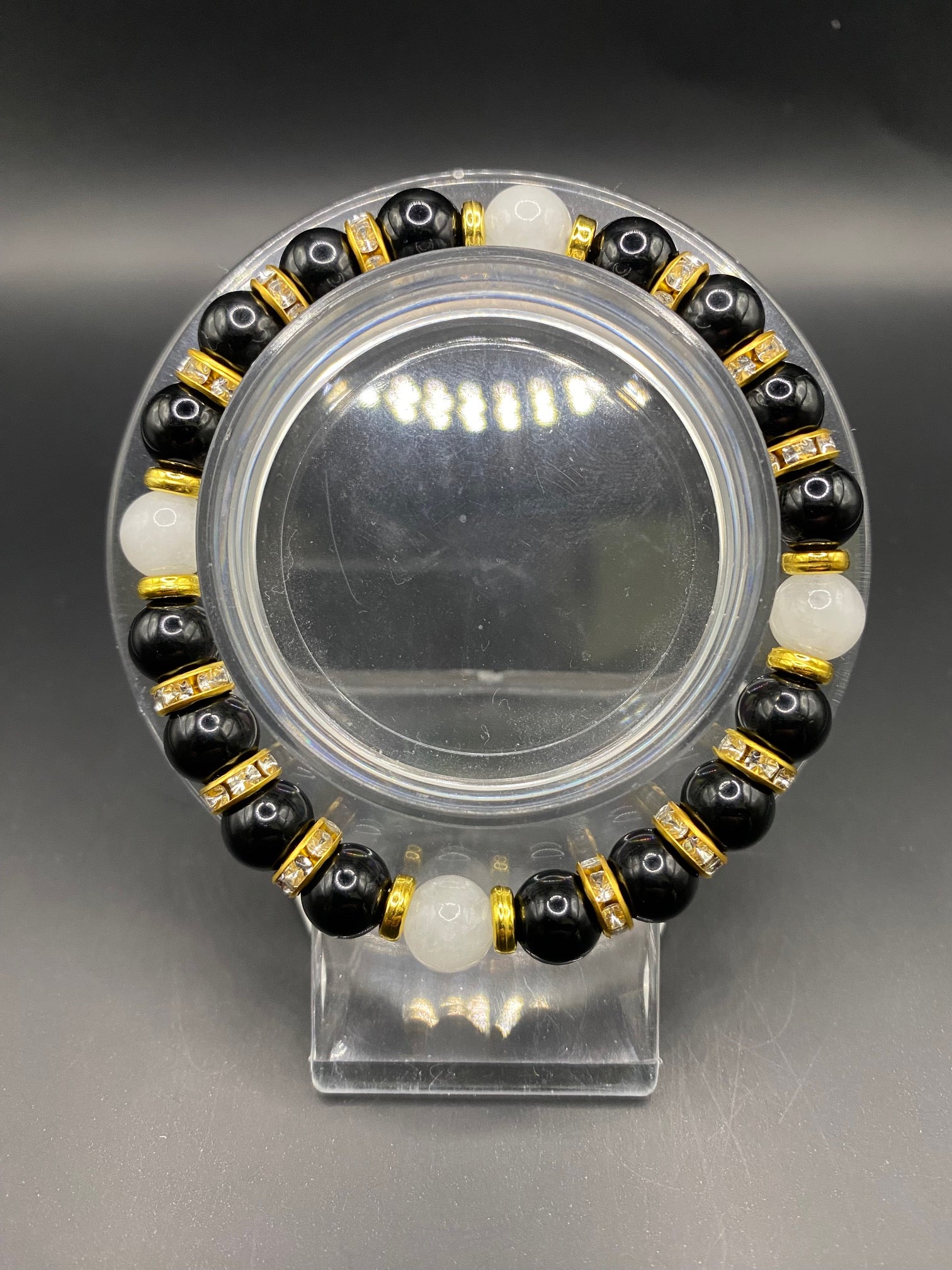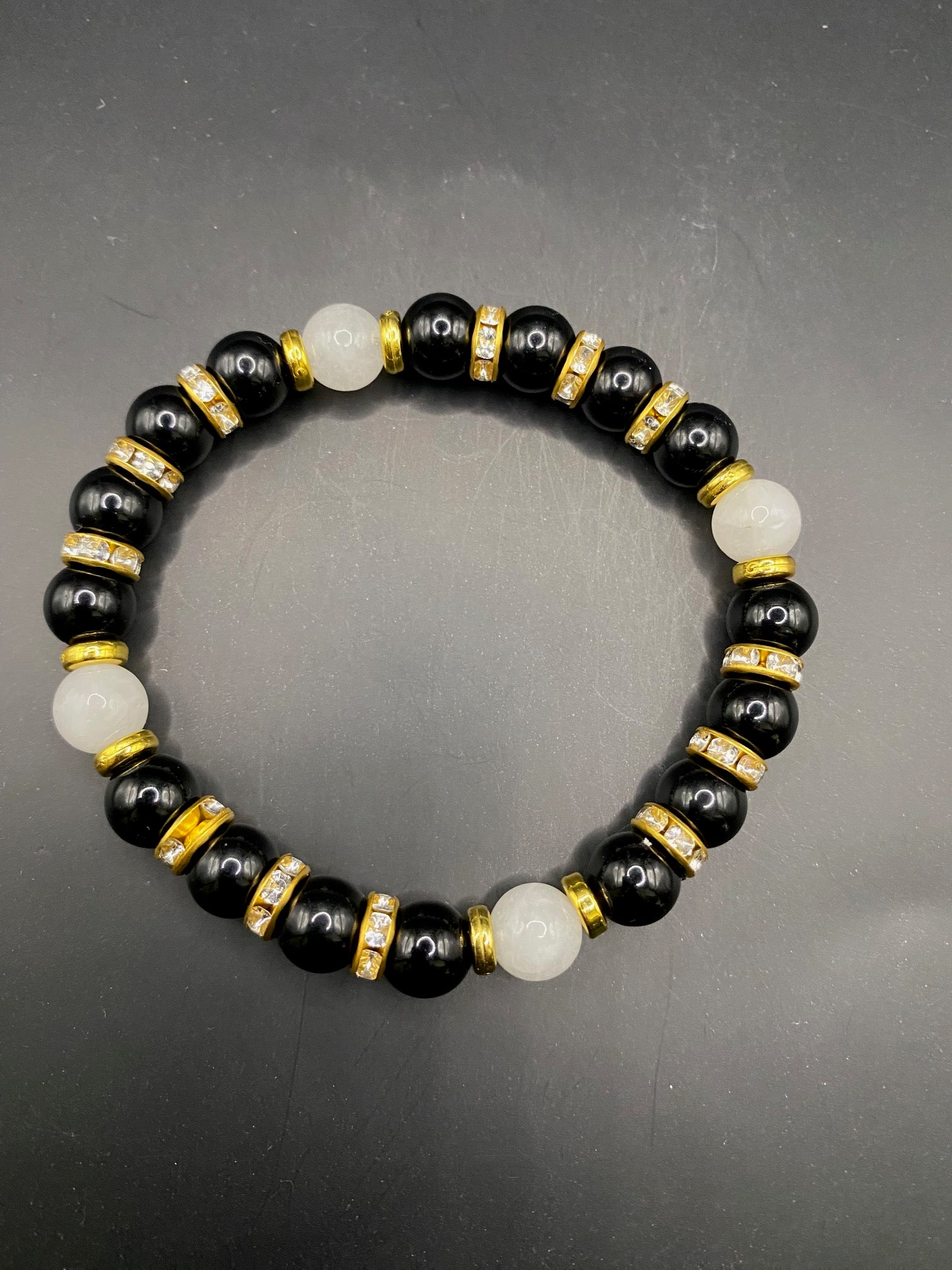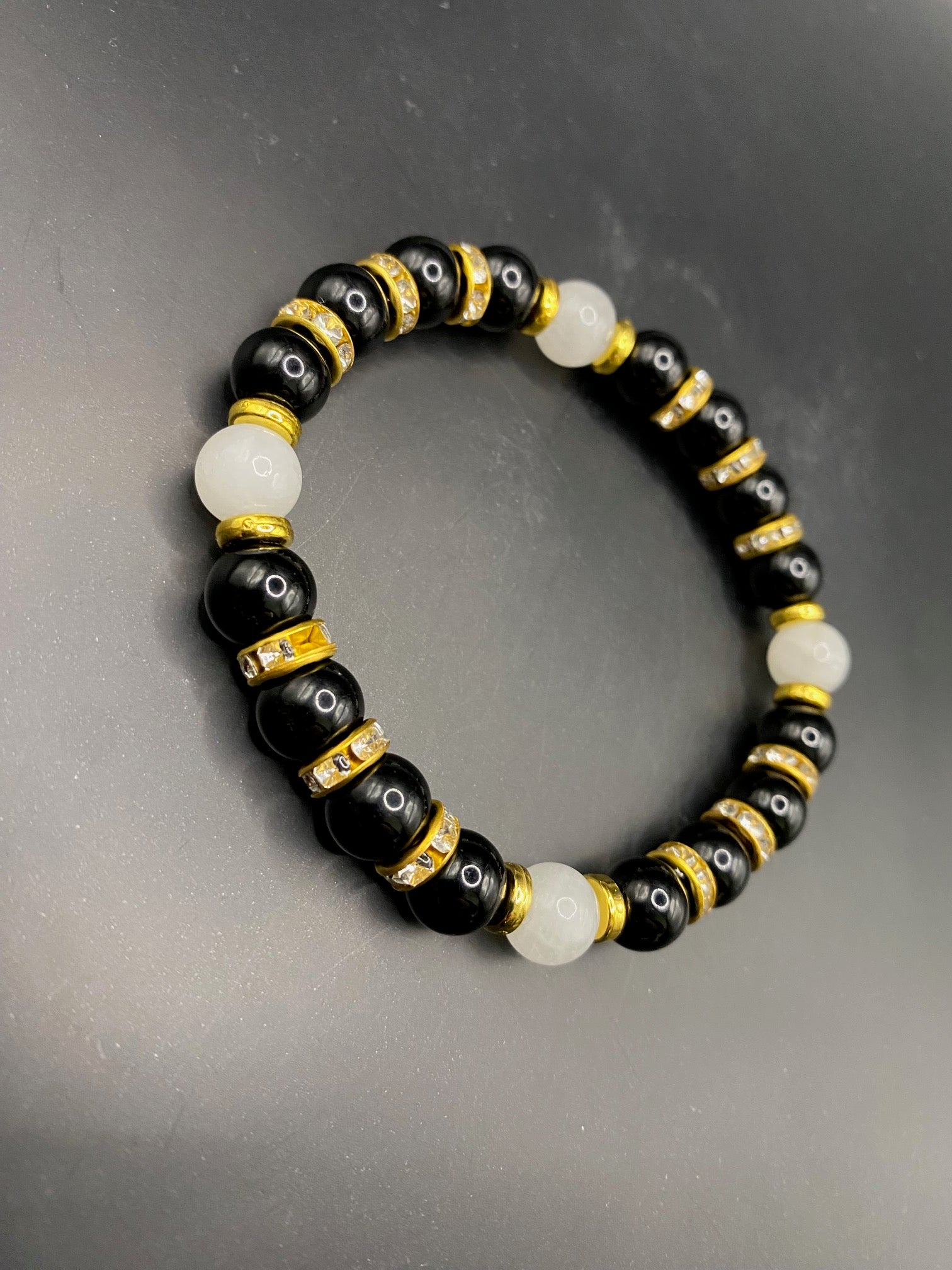 It's made with white jade and obsidian beads with gold colored spacers <3