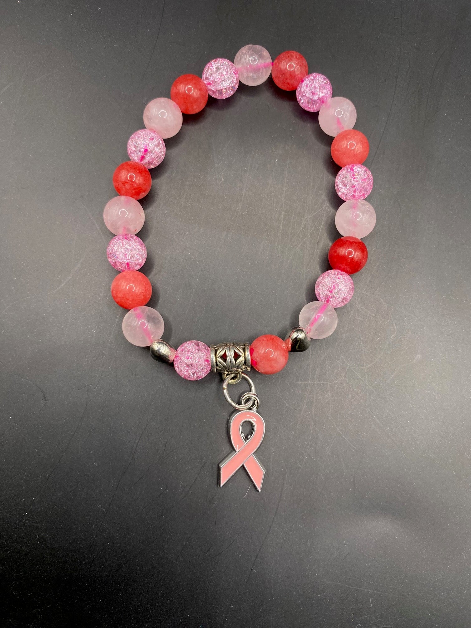 This piece is made using pink chalcedony, rose quartz and crackle quartz bead with minimal silver spacers and a single charm <3