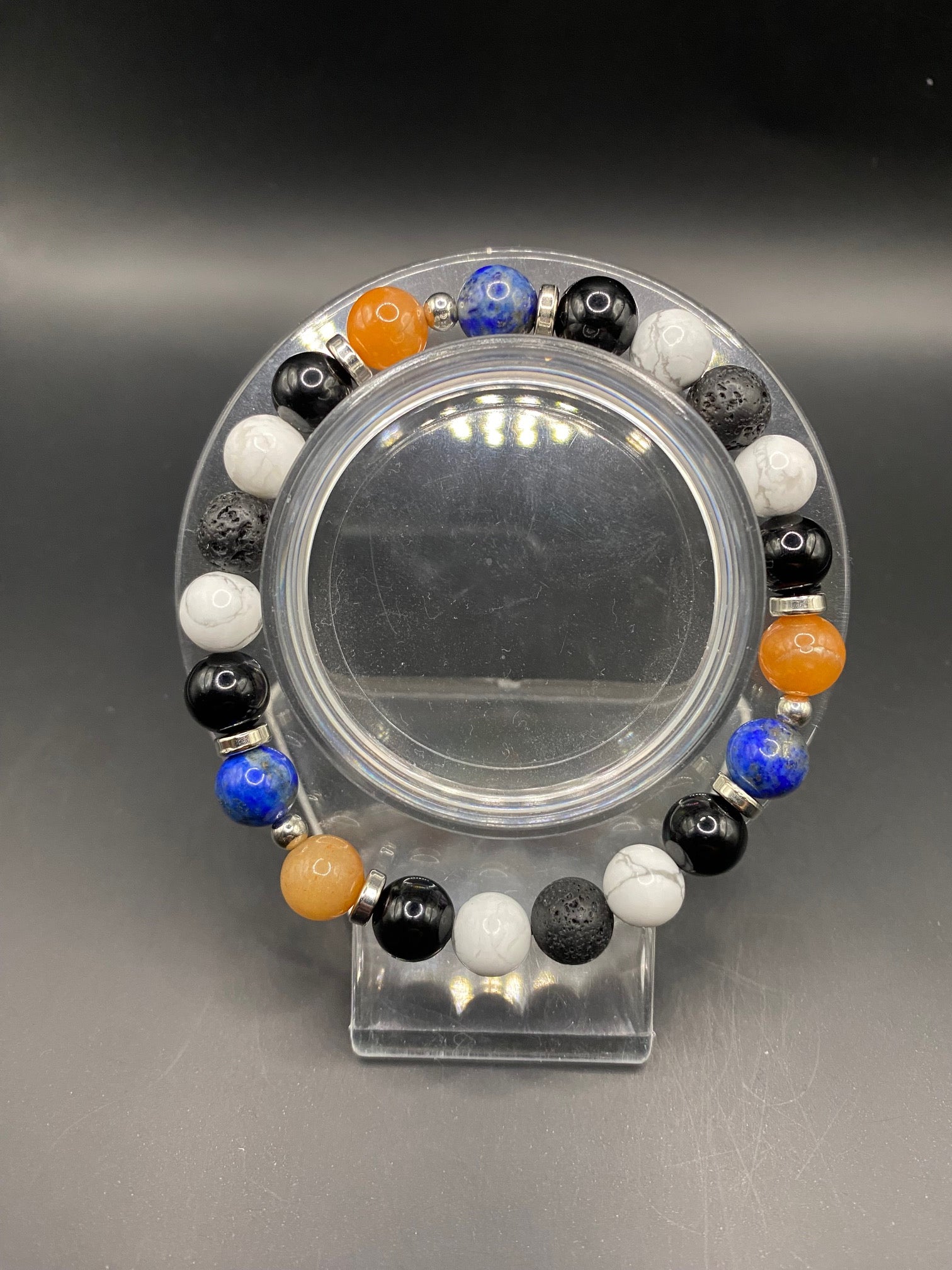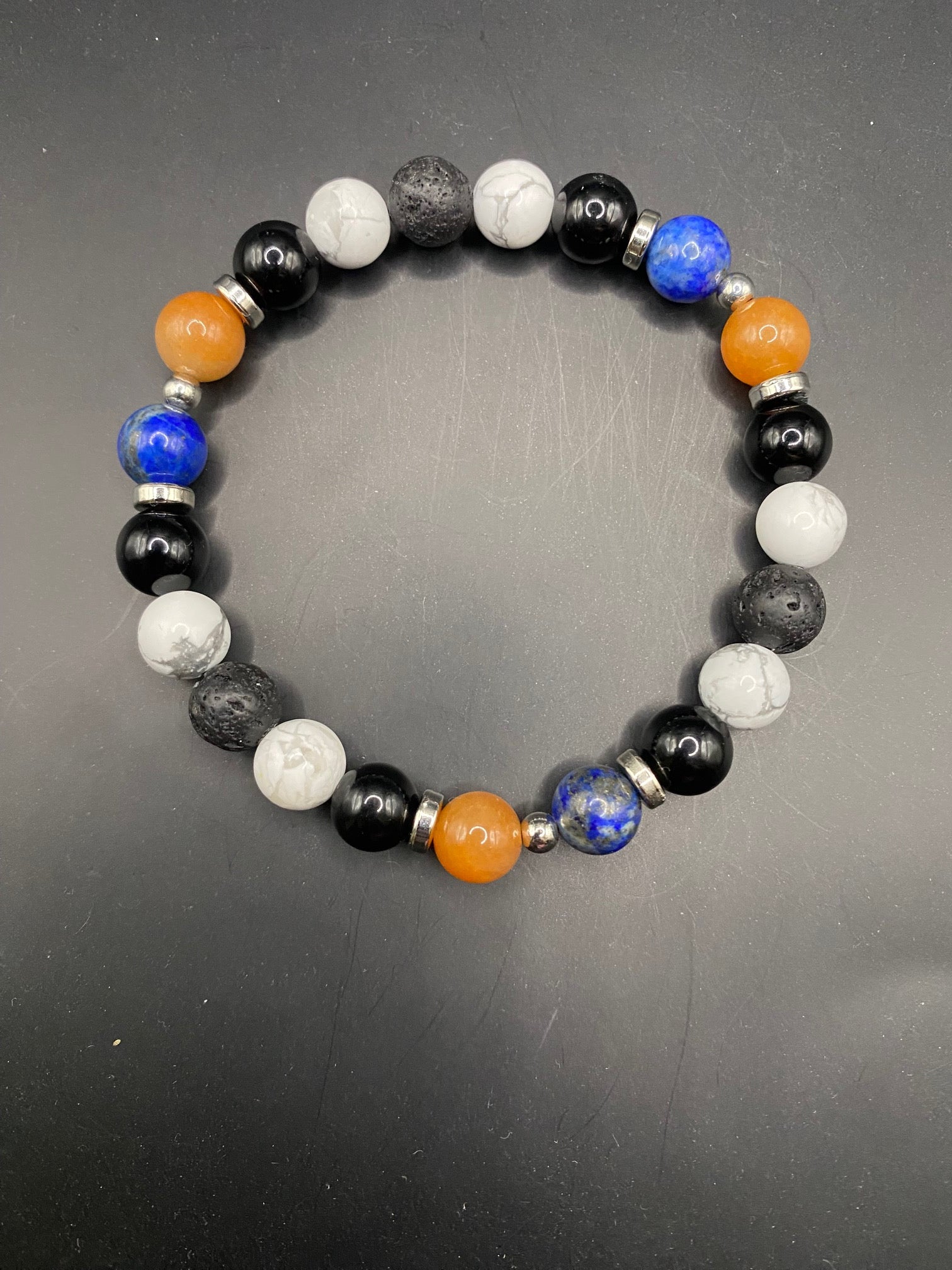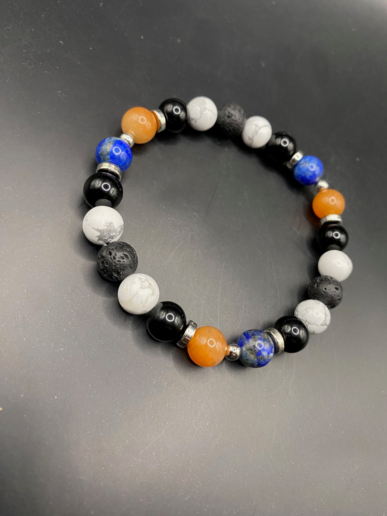 It's made with obsidian, red aventurine, lapis lazuli, howlite and lava rock beads with silver colored spacers <3