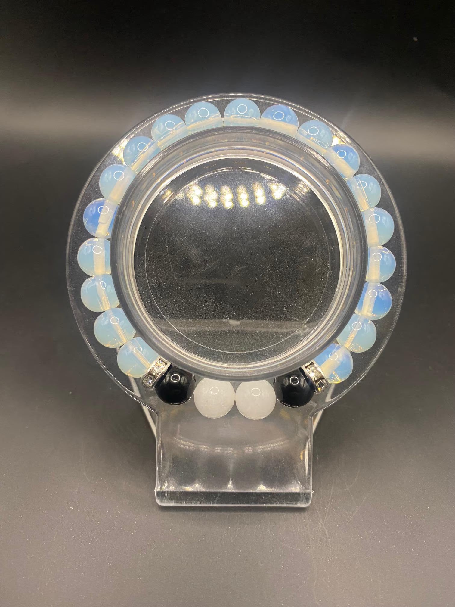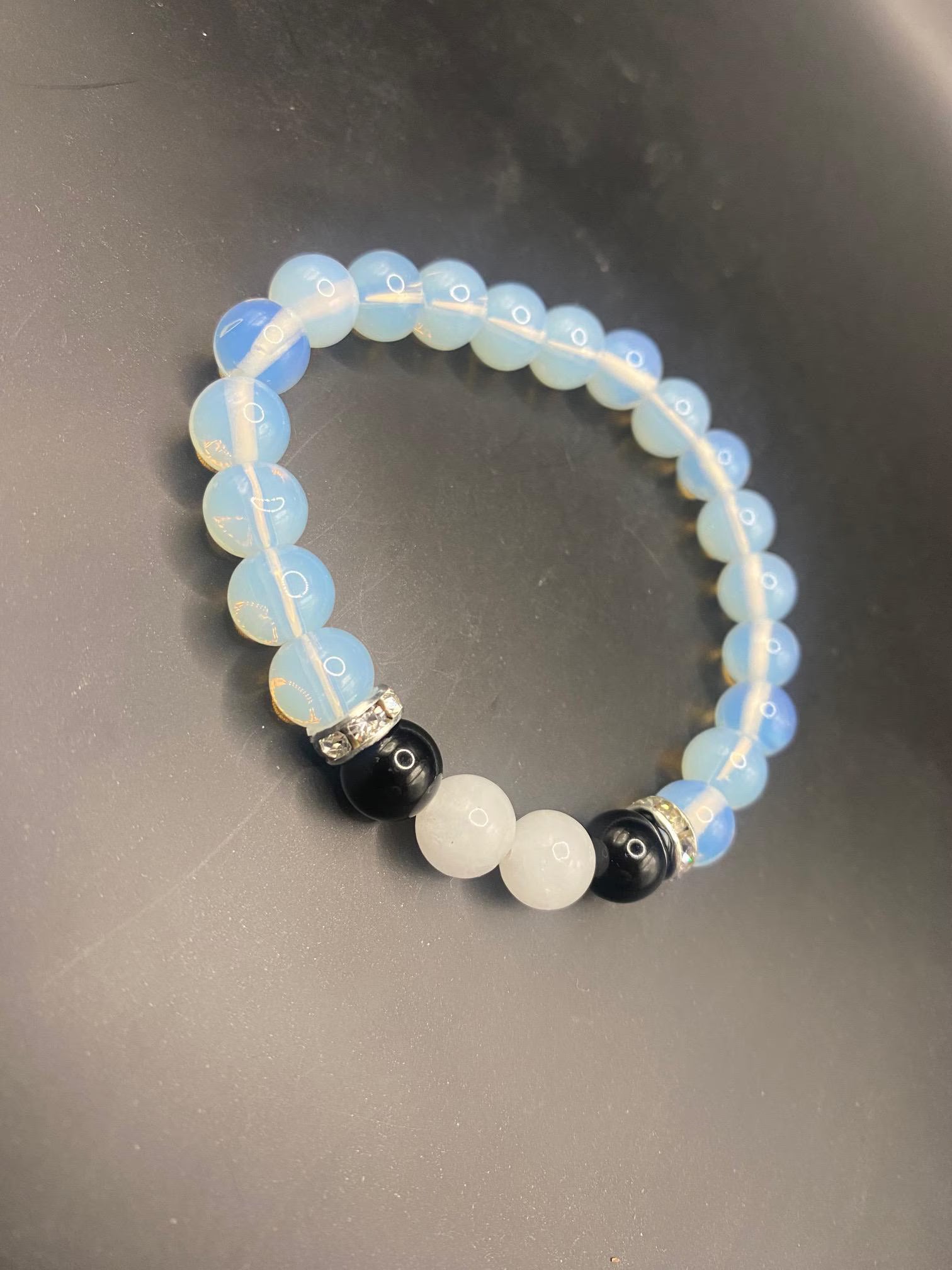 It's made with opalite, obsidian and white jade beads with silver spacers <3