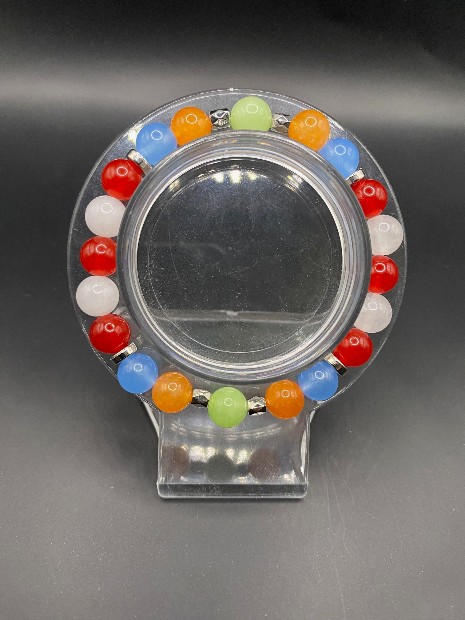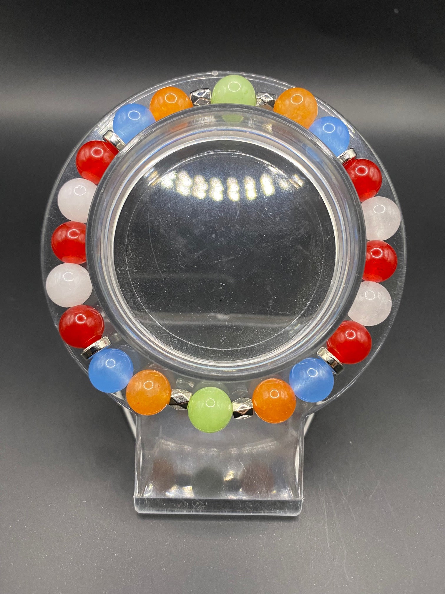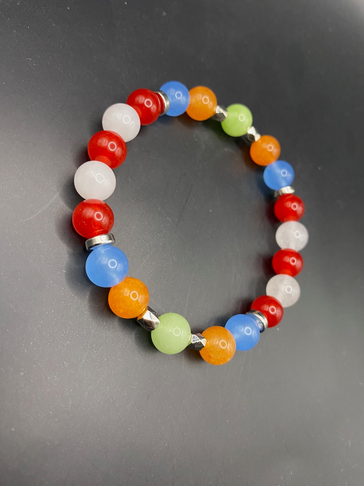 It's made with white jade, red coral jade, blue chalcedony, orange chalcedony and mint chalcedony beads with silver colored spacers <3