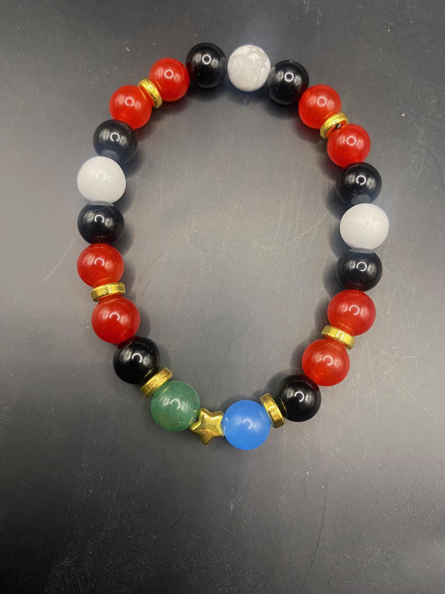It's made with howlite, red coral jade, obsidian, howlite, green aventurine and blue chalcedony beads with gold spacers <3