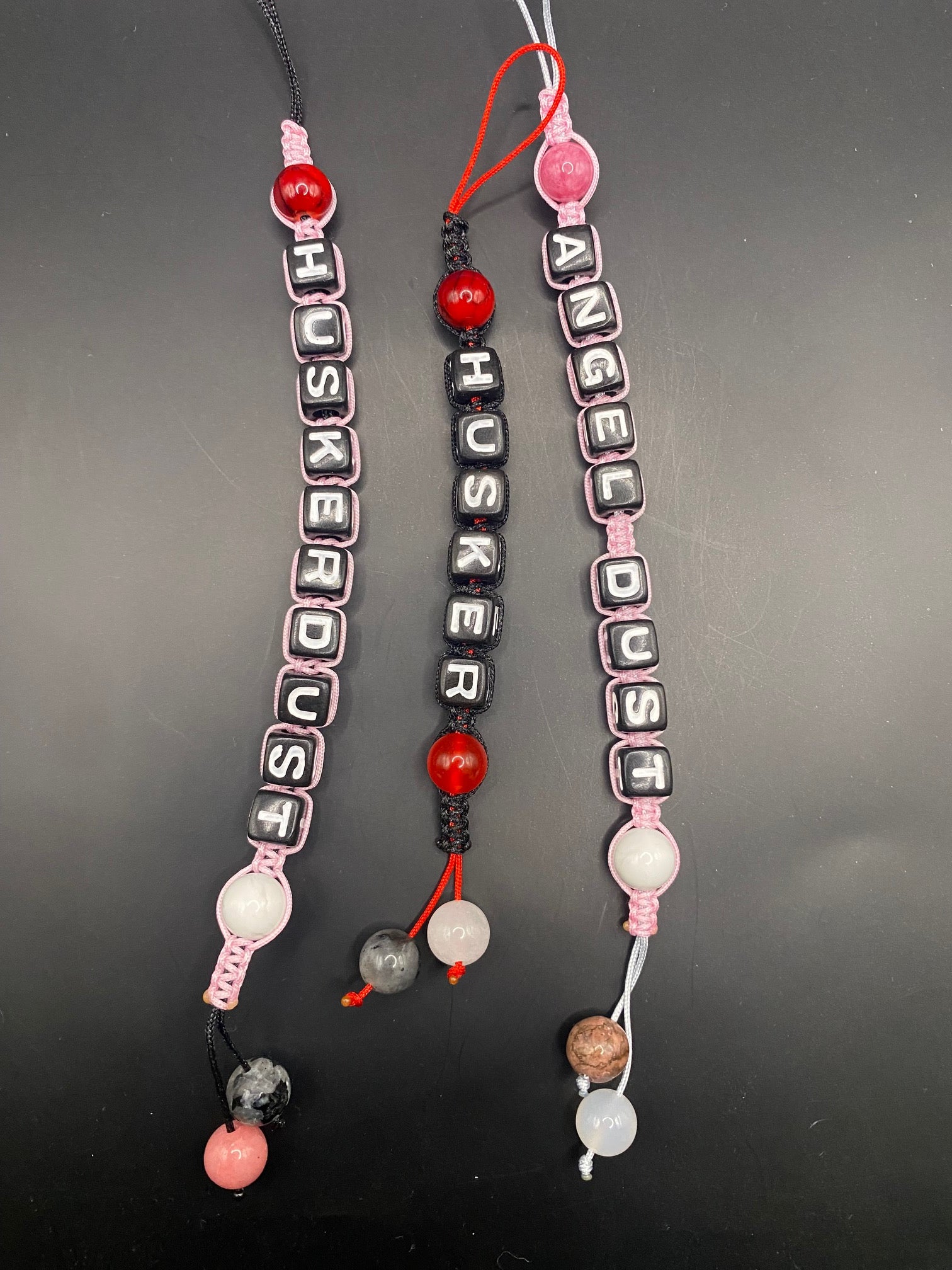 HuskerDust (LIMITED INVENTORY) features dyed red quartz, howlite, larvikite and pink chalcedony beads
