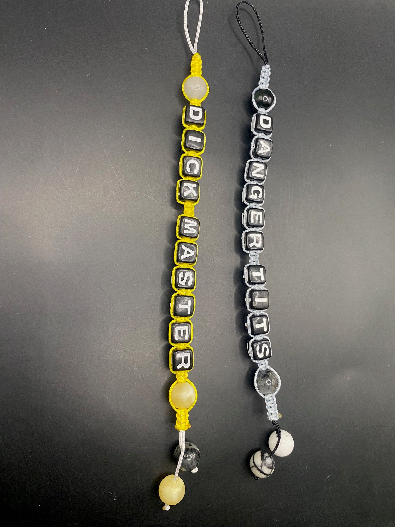 Dick Master (Adam) features white jade, honey calcite and larvikite beads