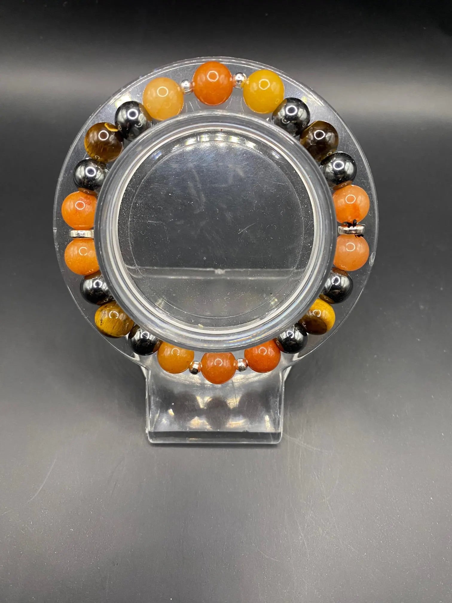 It's made with red aventurine, tigers eye and hematite stone beads with silver spacers <3