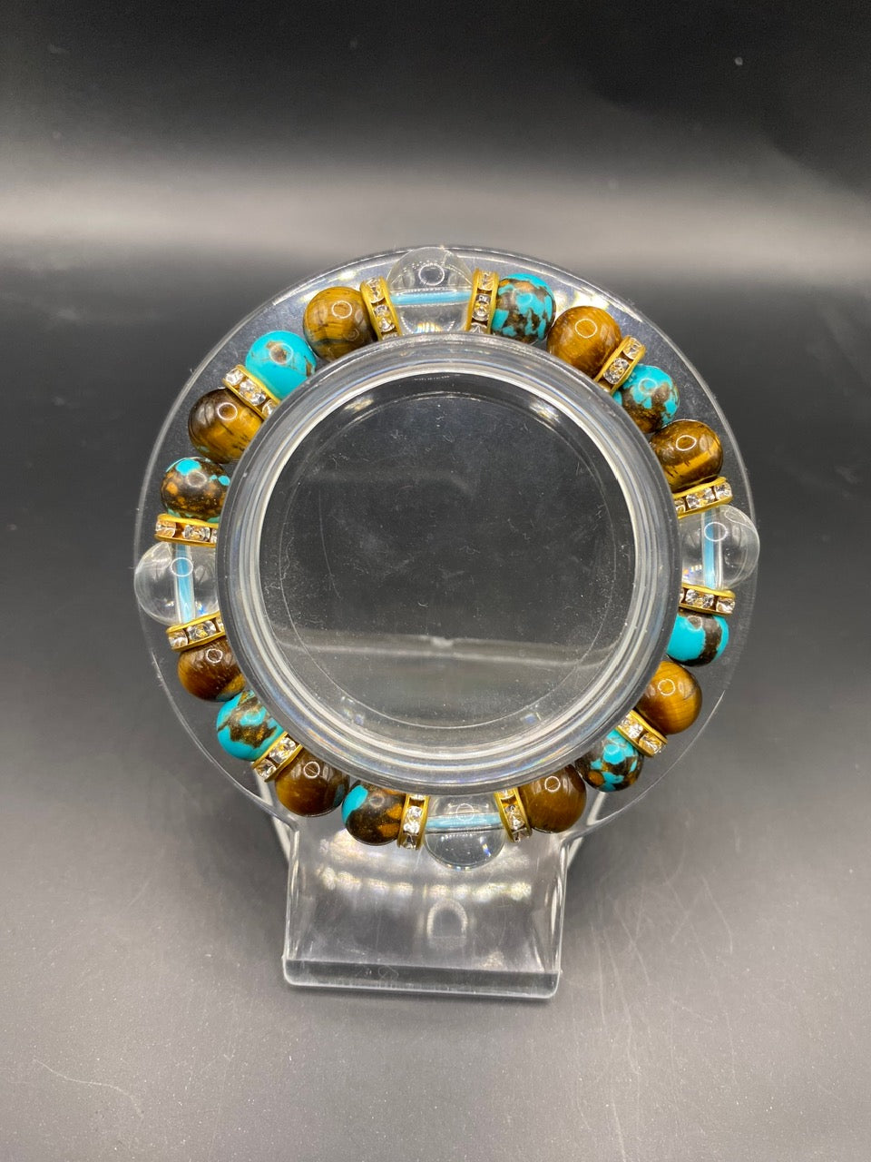 This piece is made using sediment turquoise, yellow tigers eye and glass beads with gold spacers <3