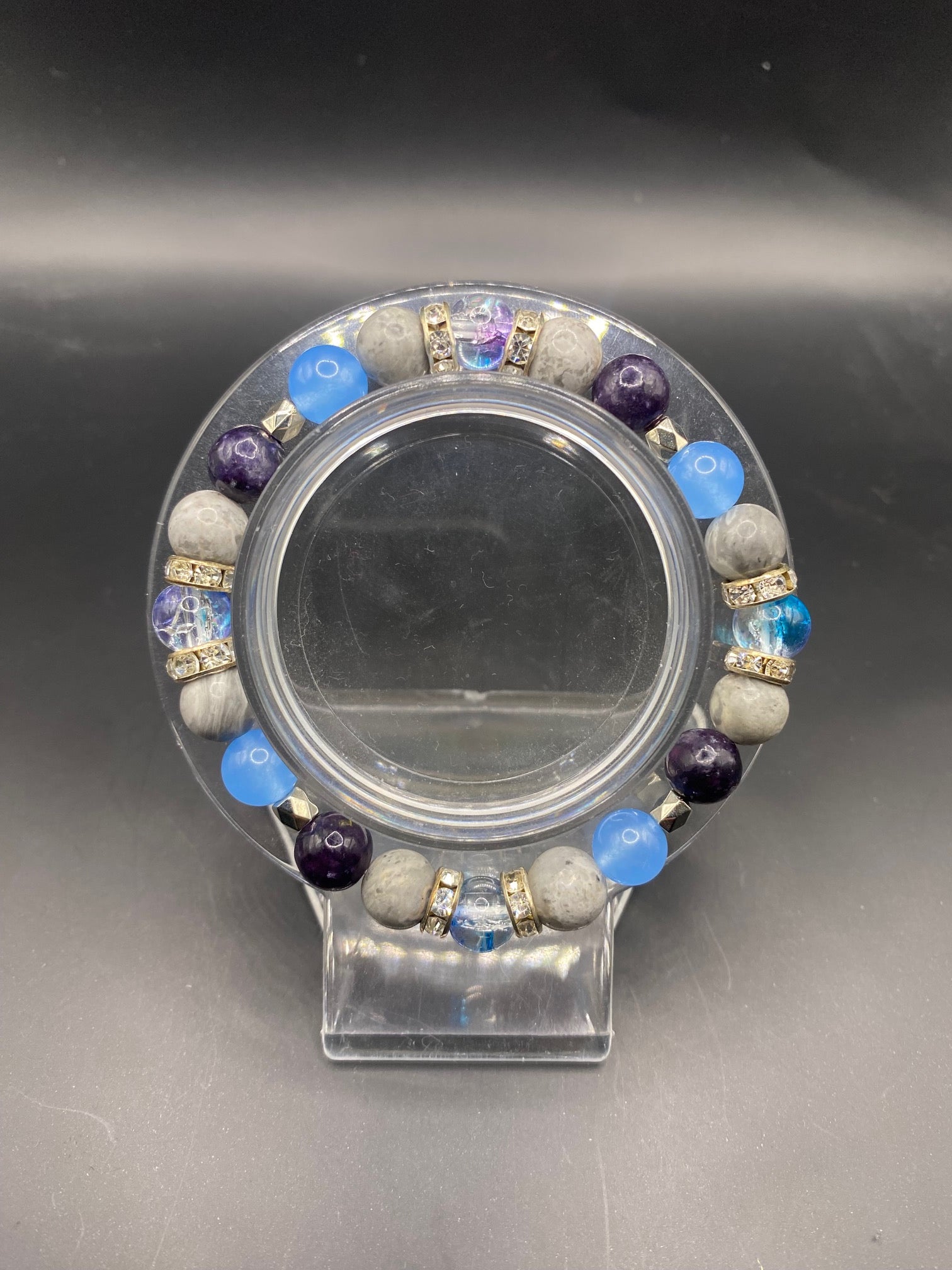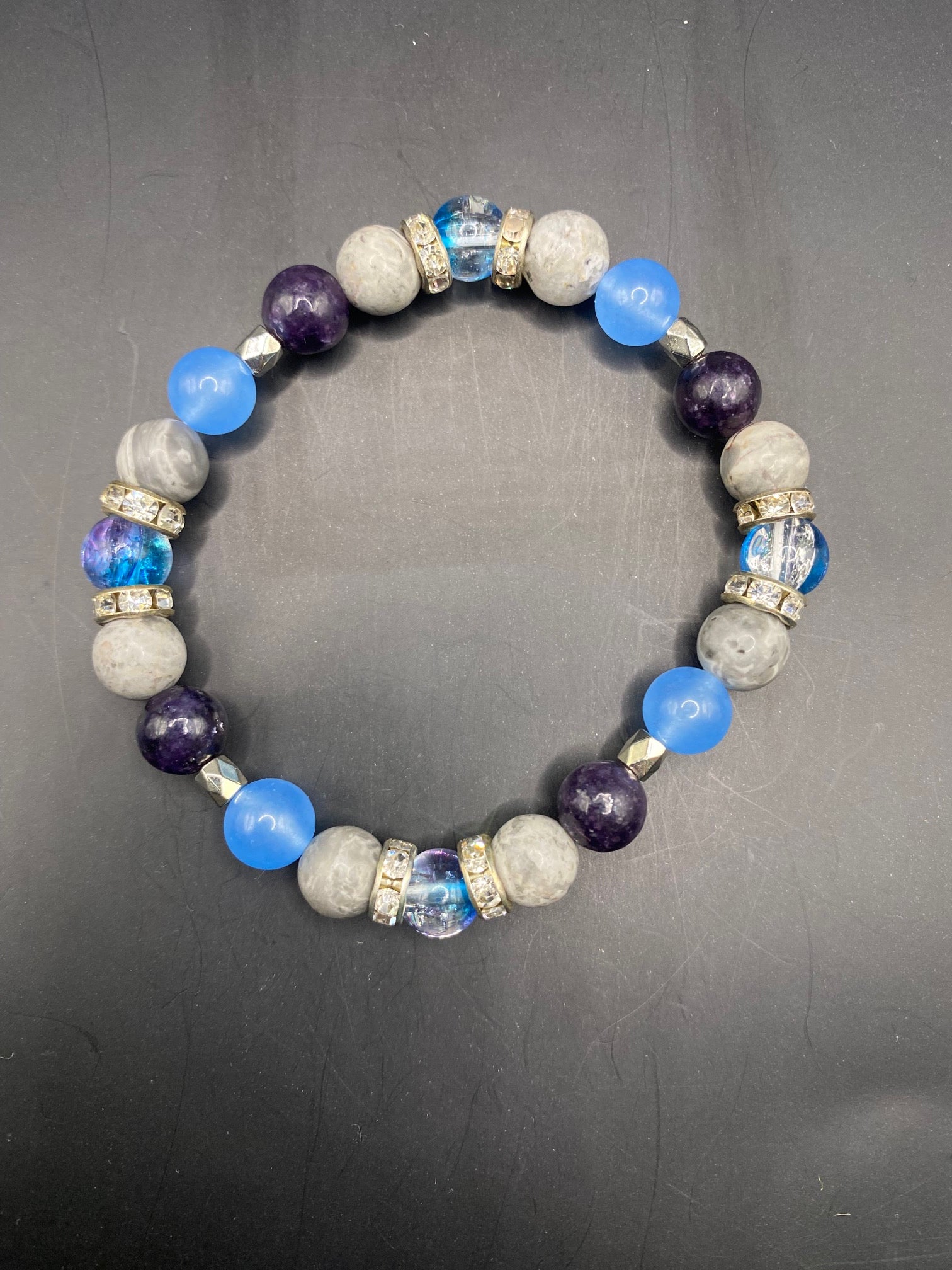This piece is made using dyed glass, blue chalcedony, lepidolite (high grade) and Picasso stone with silver spacers <3