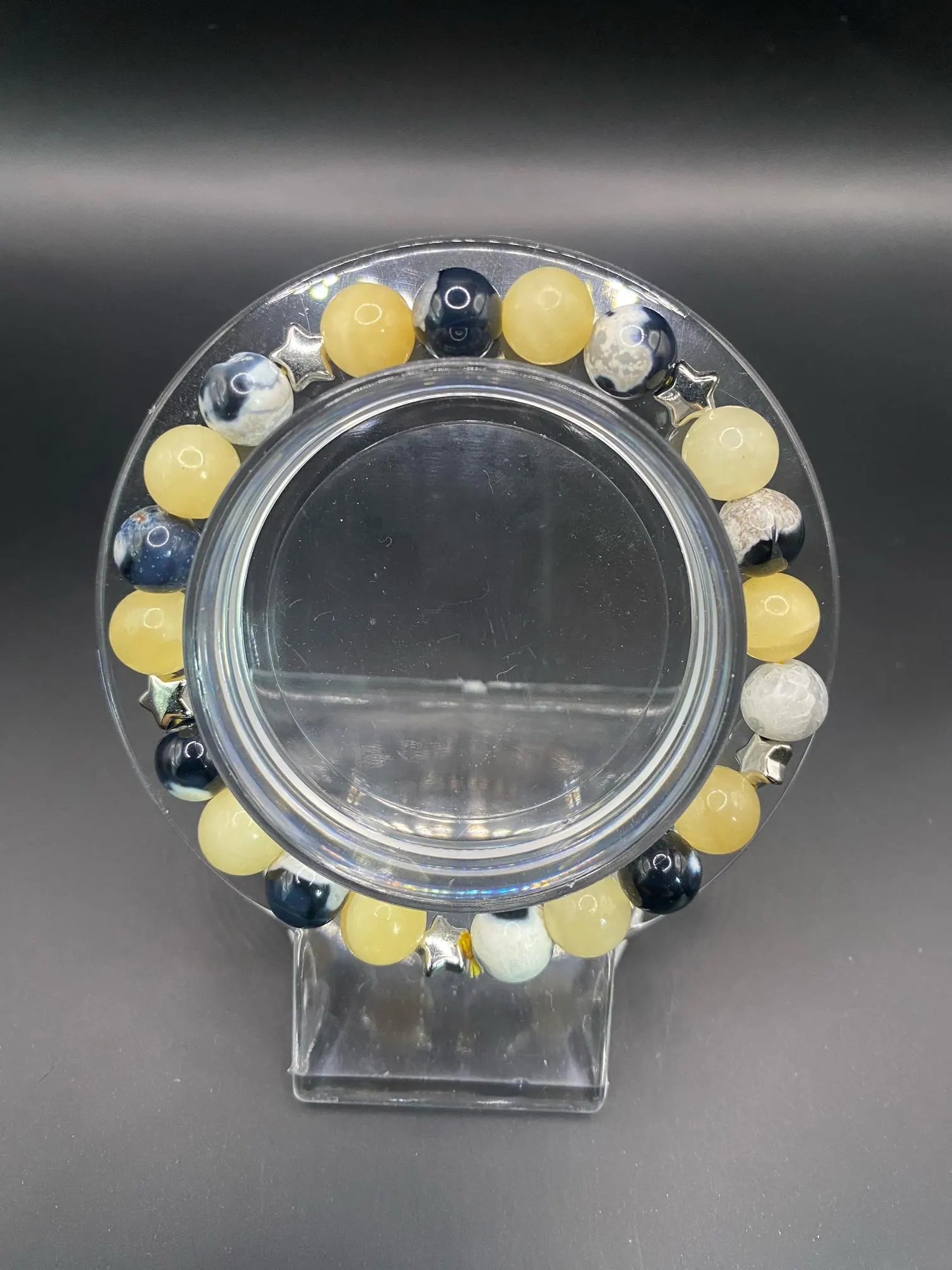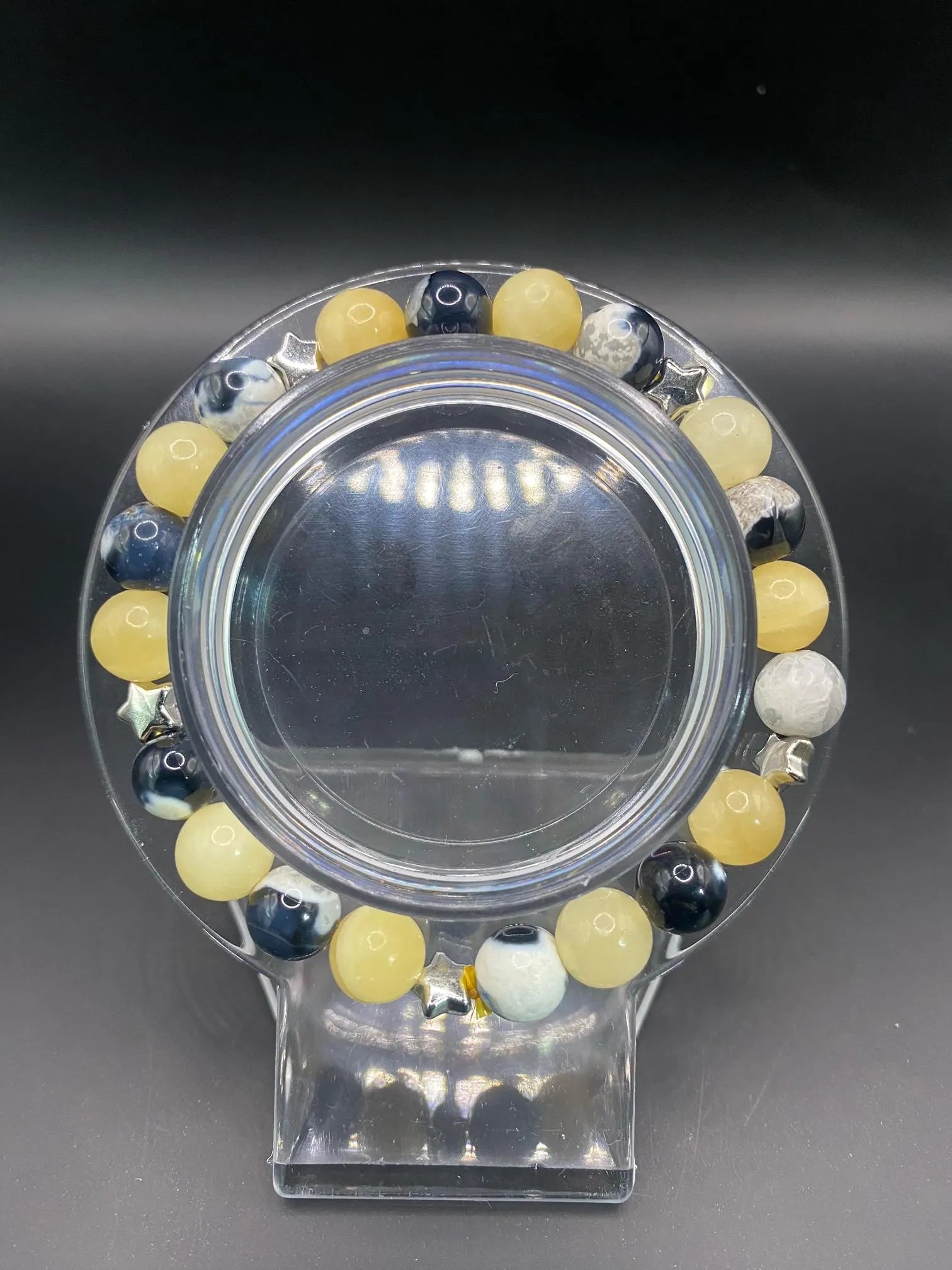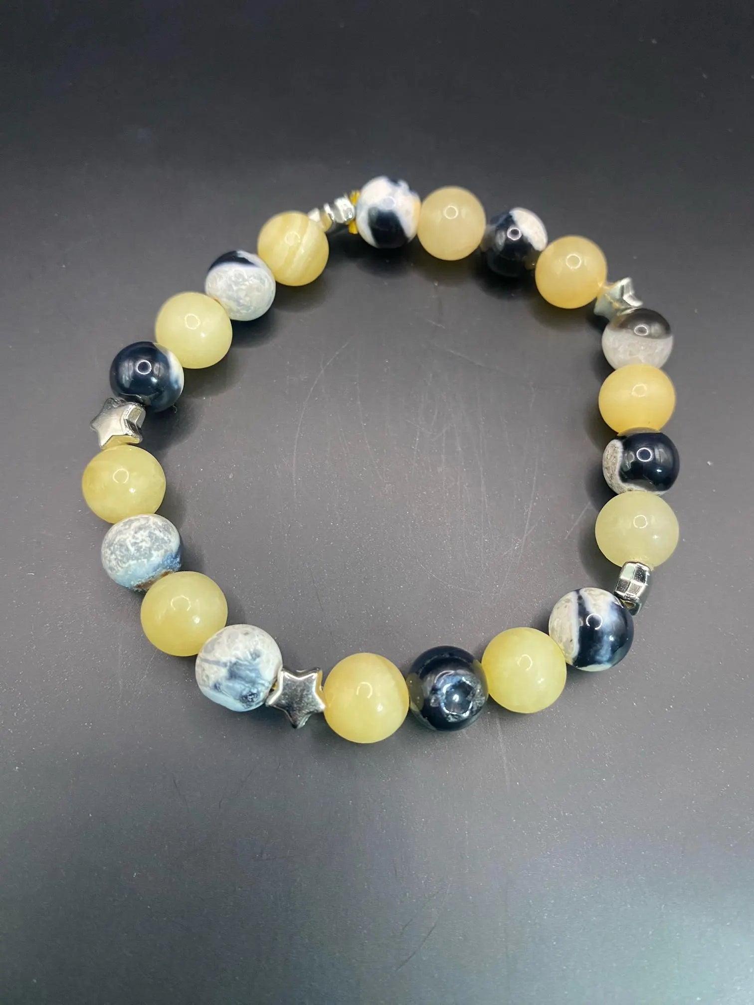 It's made with honey calcite and orca agate with silver colored round and star shaped spacers <3