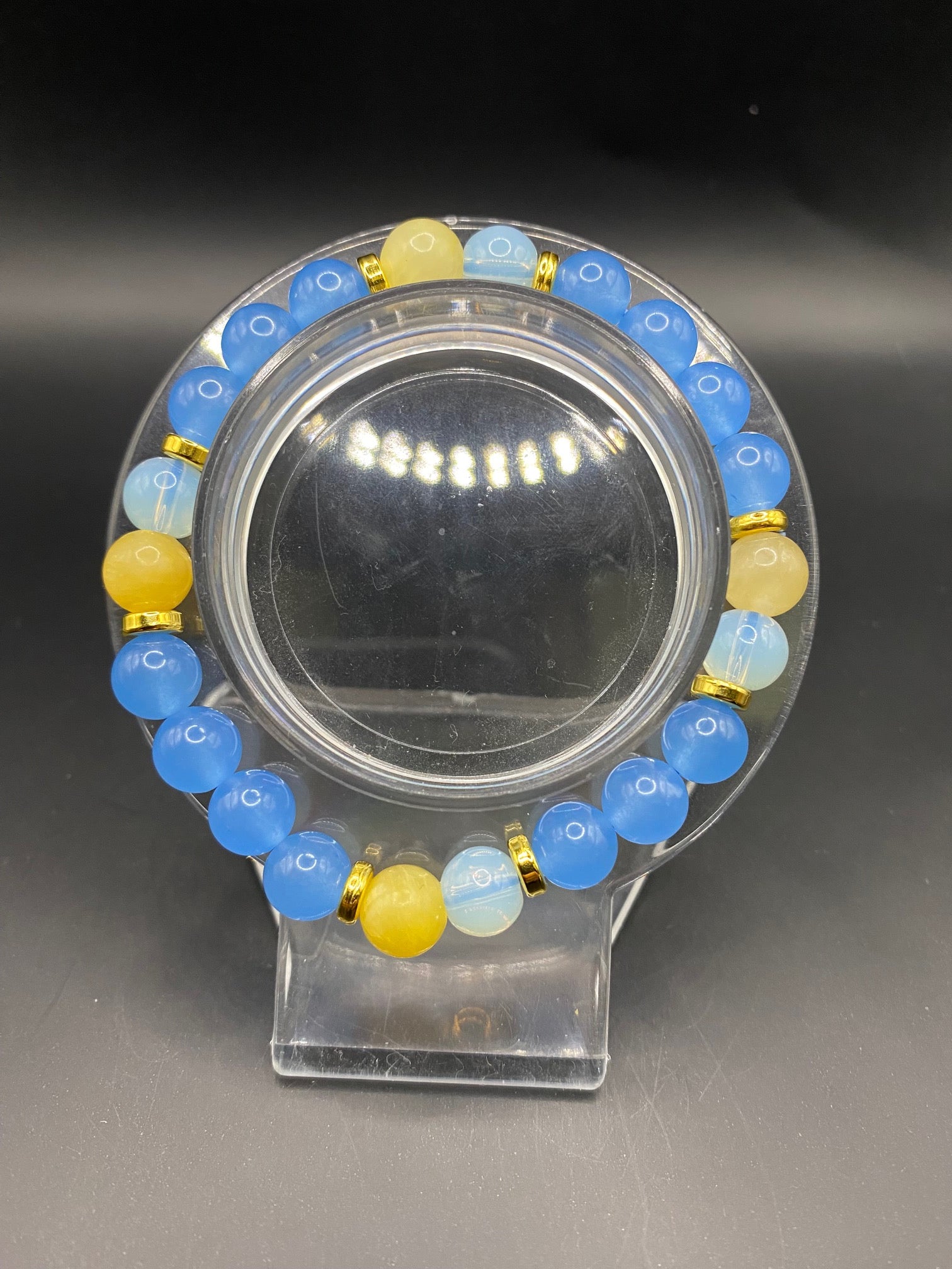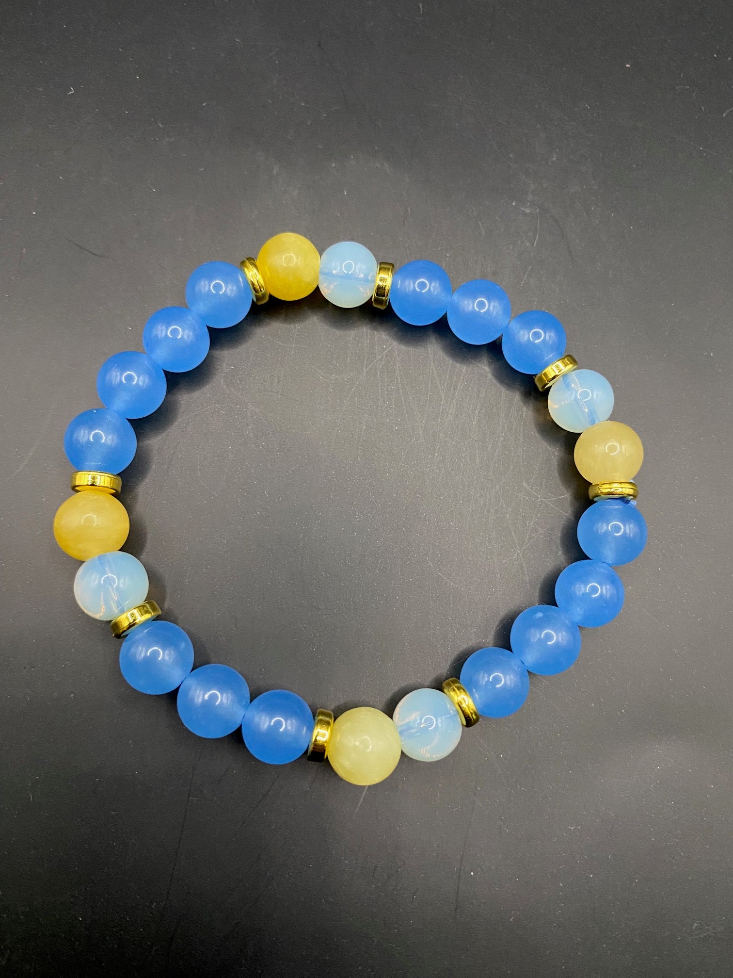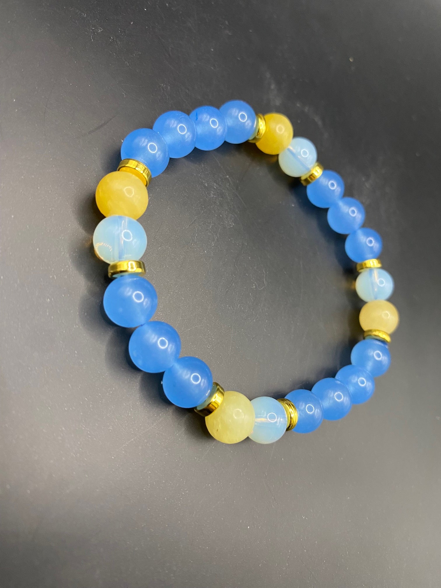 It's made with opalite, honey calcite and blue chalcedony beads with gold colored spacers <3