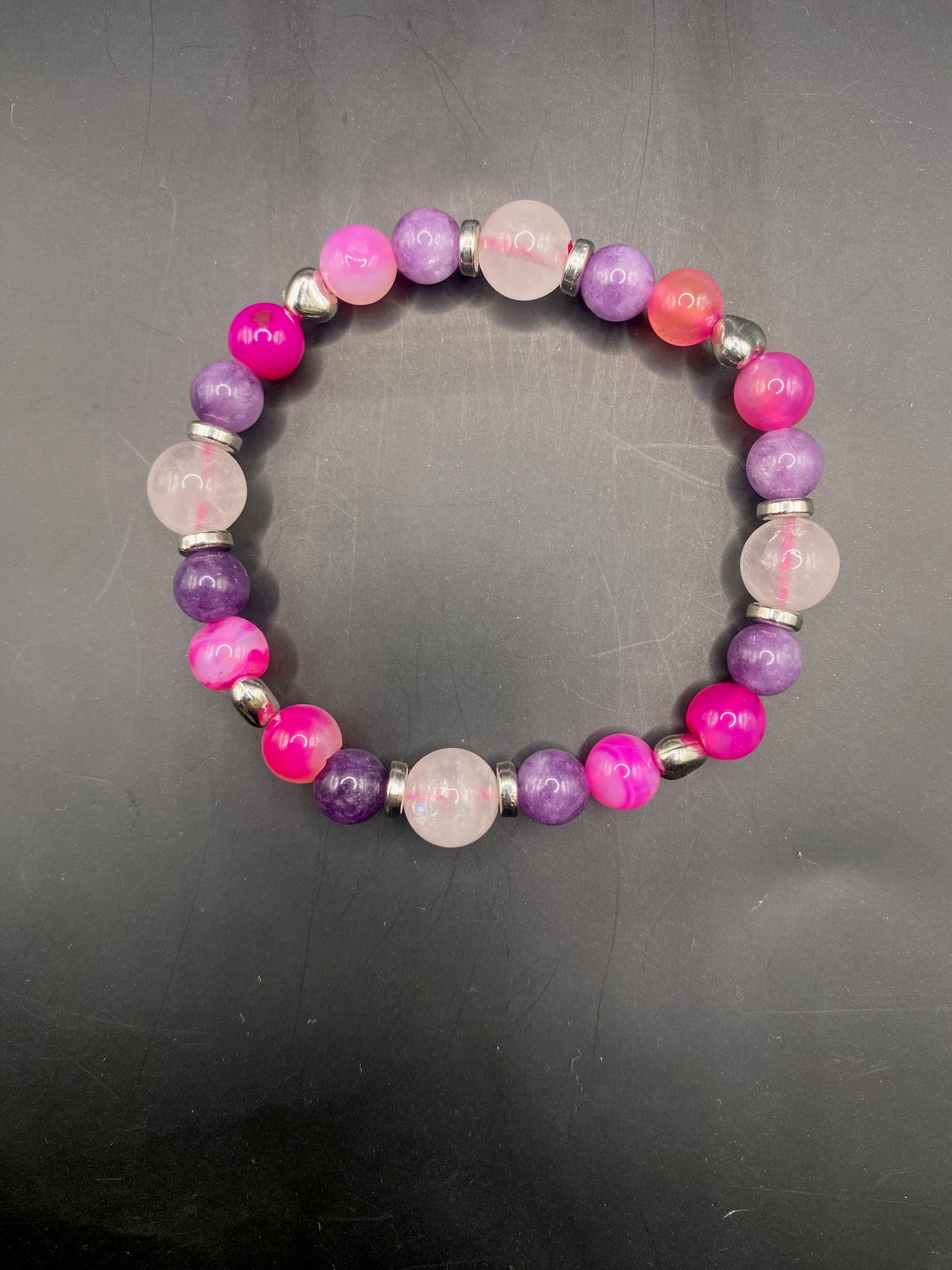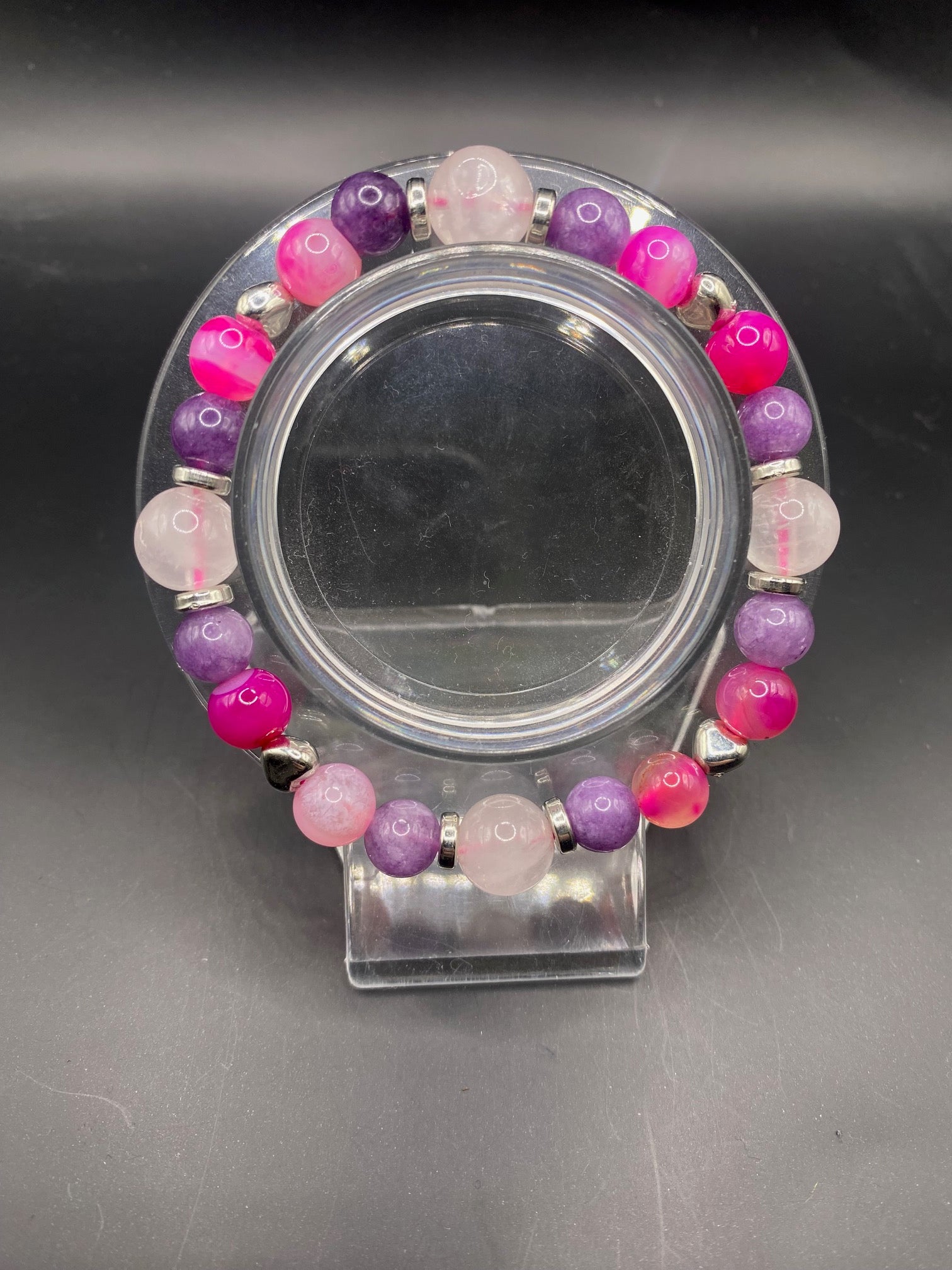 This piece is made using dyed agate, rose quartz and amethyst beads with silver heart shaped spacers <3