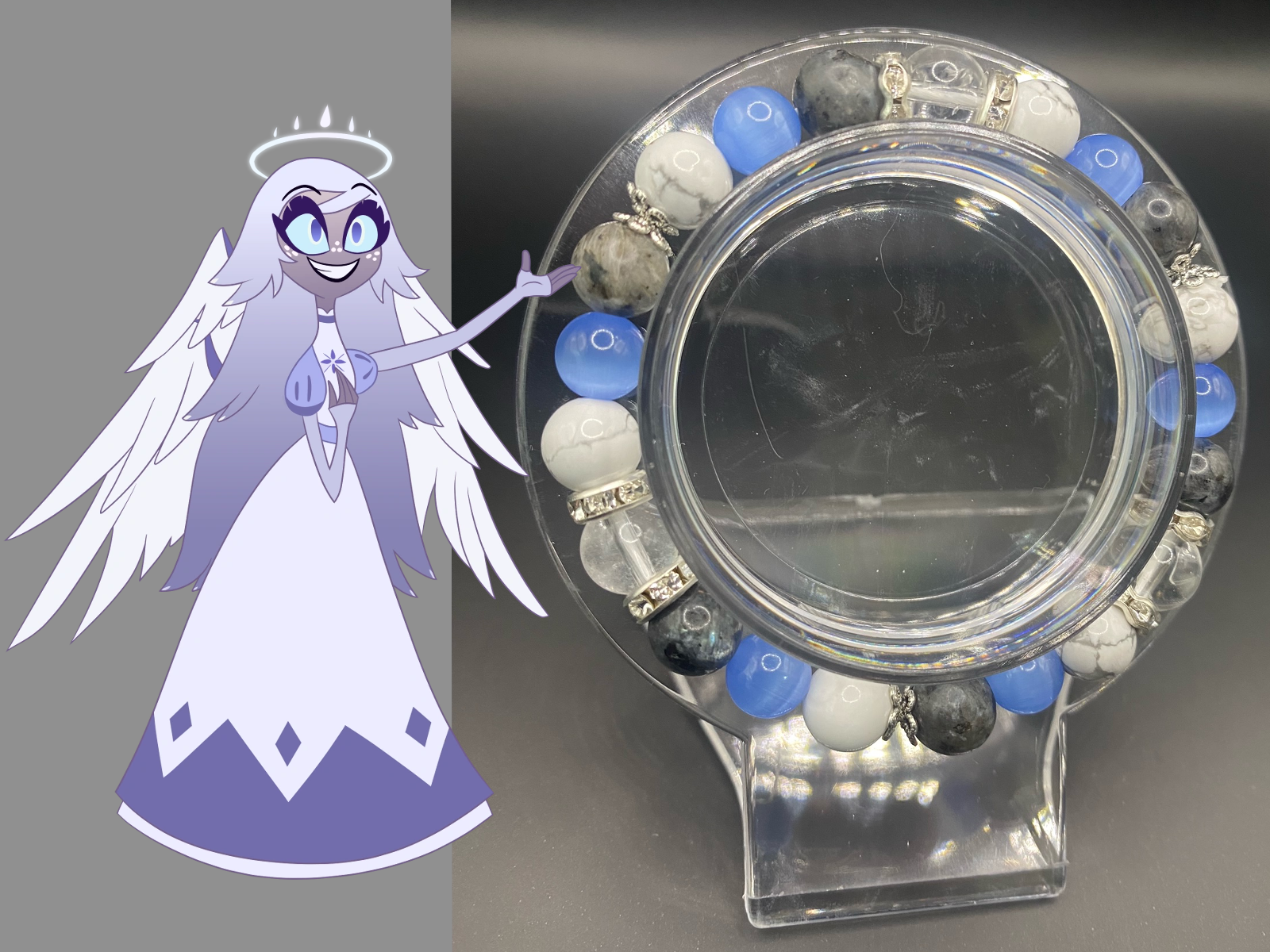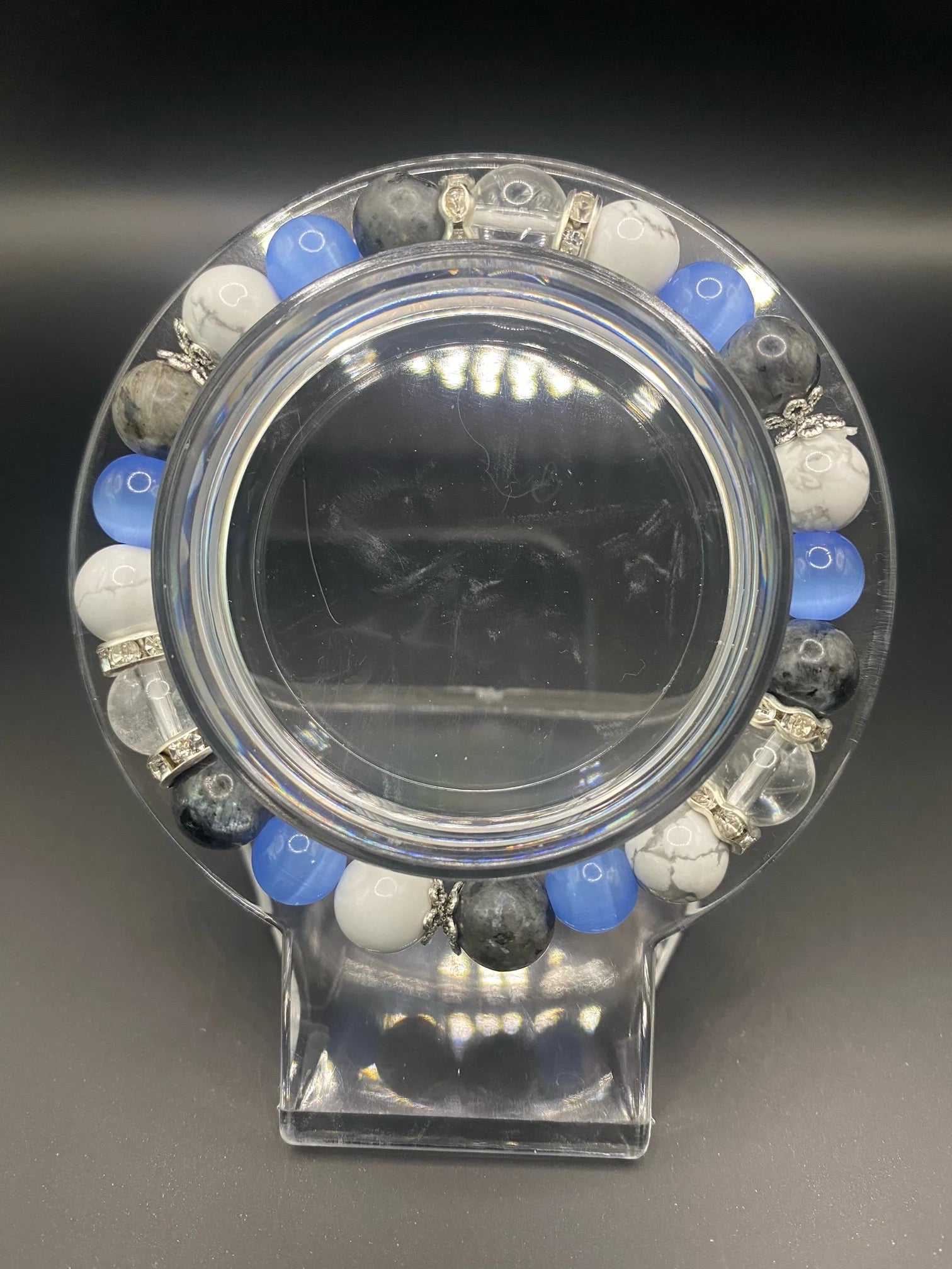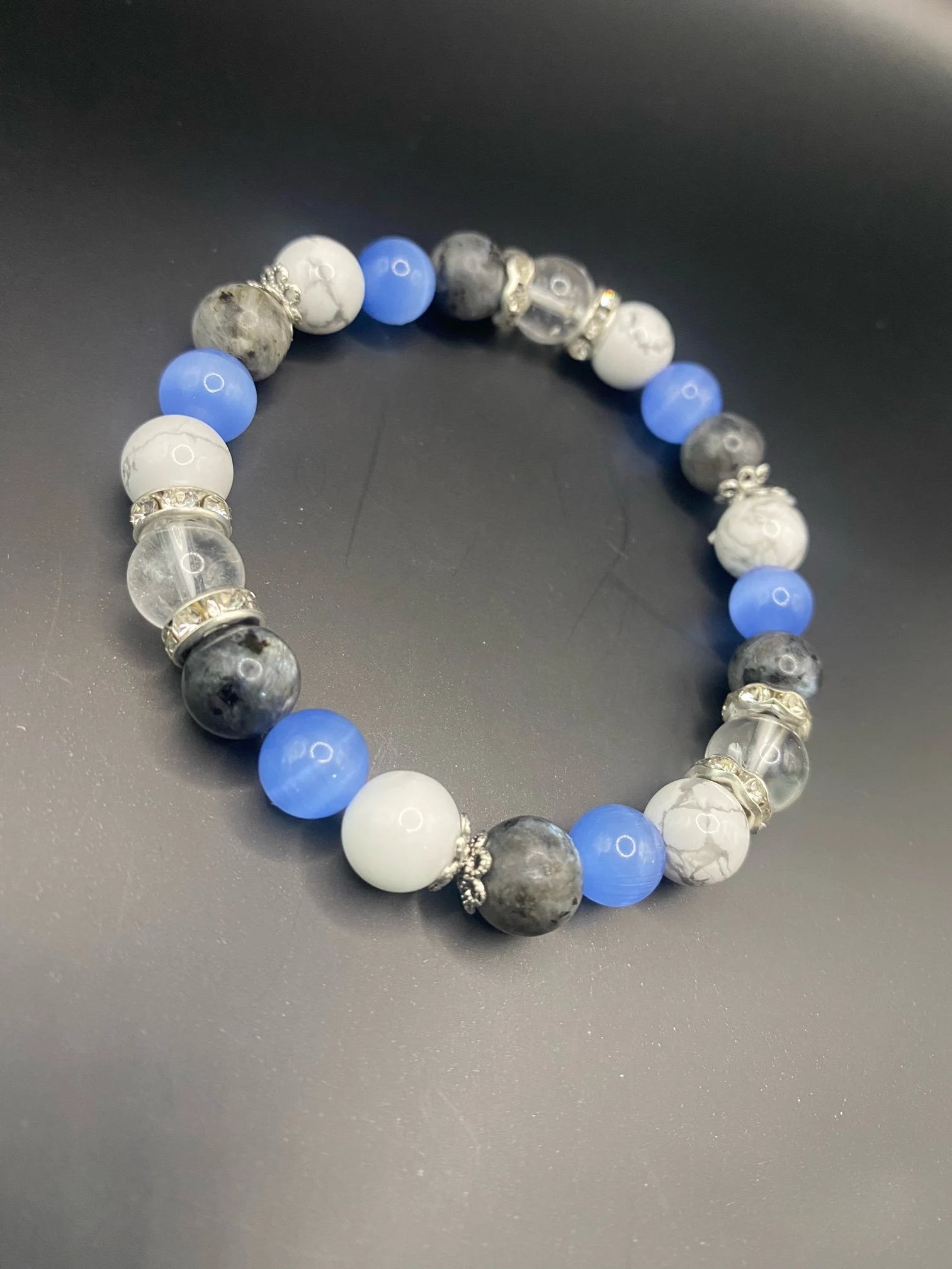 It's made with howlite, blue cat eye, clear quartz and larvikite stone beads with silver colored spacers <3