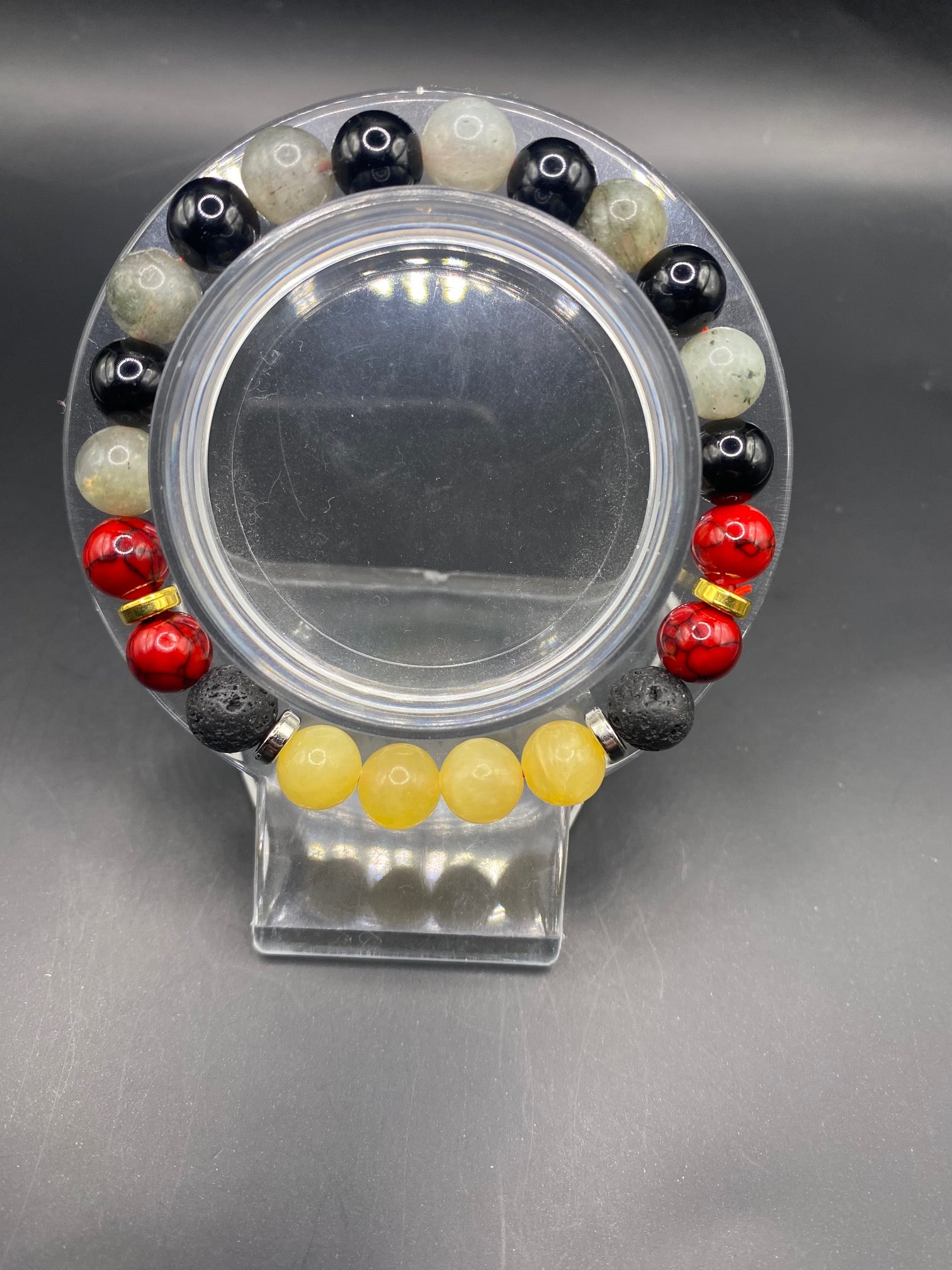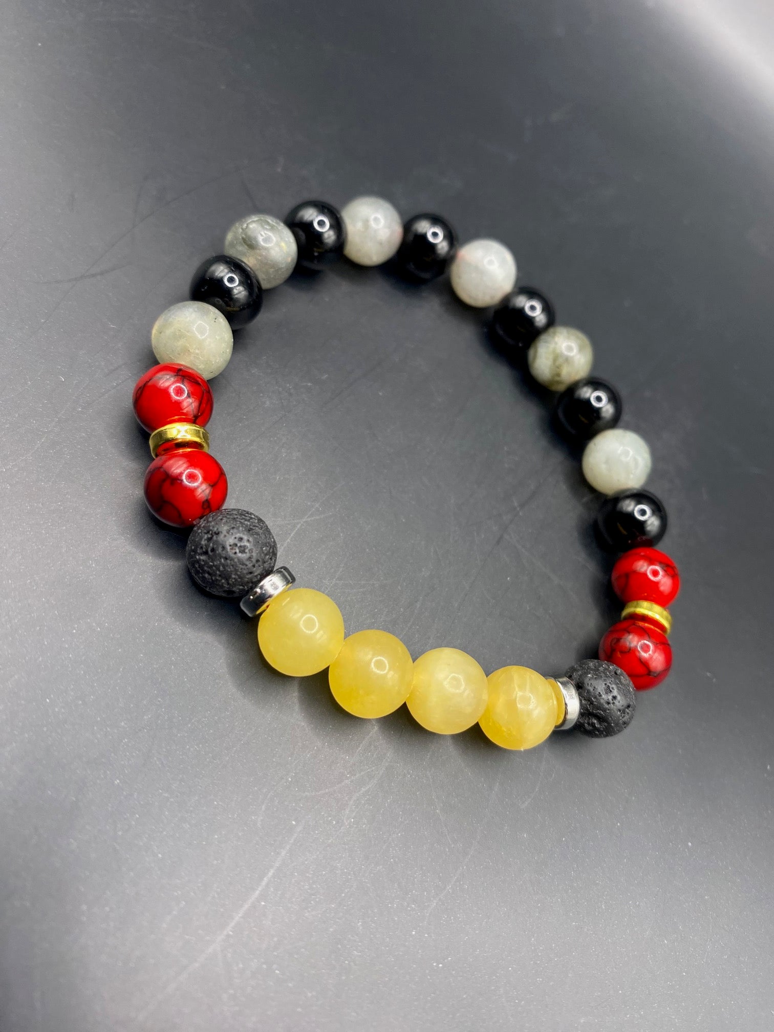 It's made with honey calcite, lava rock, red quartz (dyed), obsidian and labradorite stone beads with gold and silver colored spacers <3