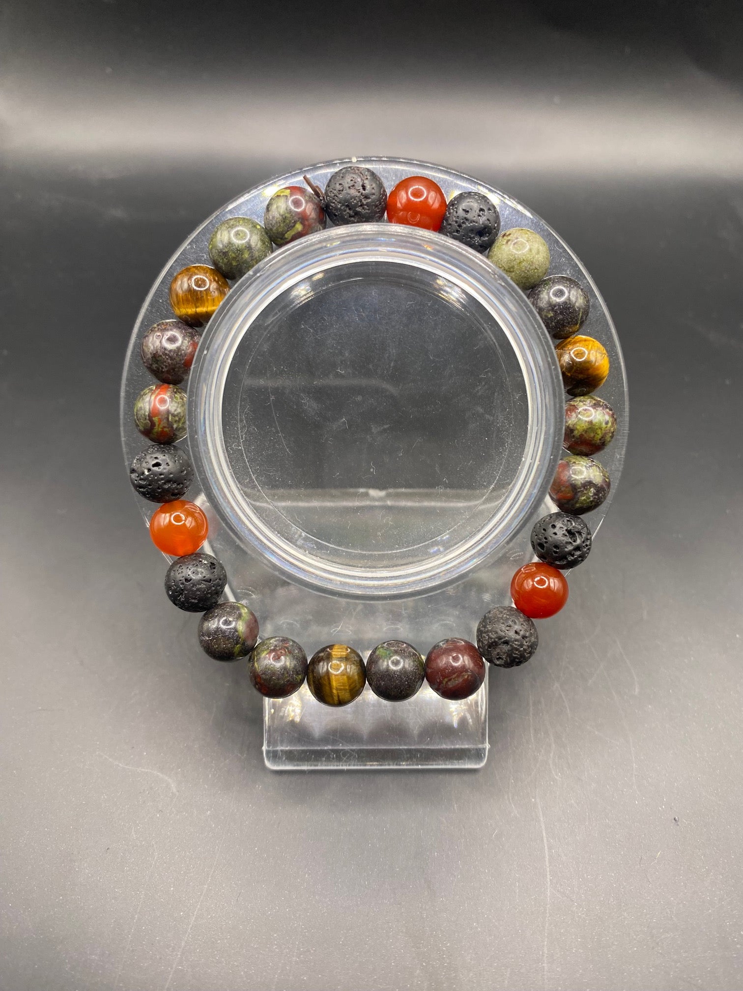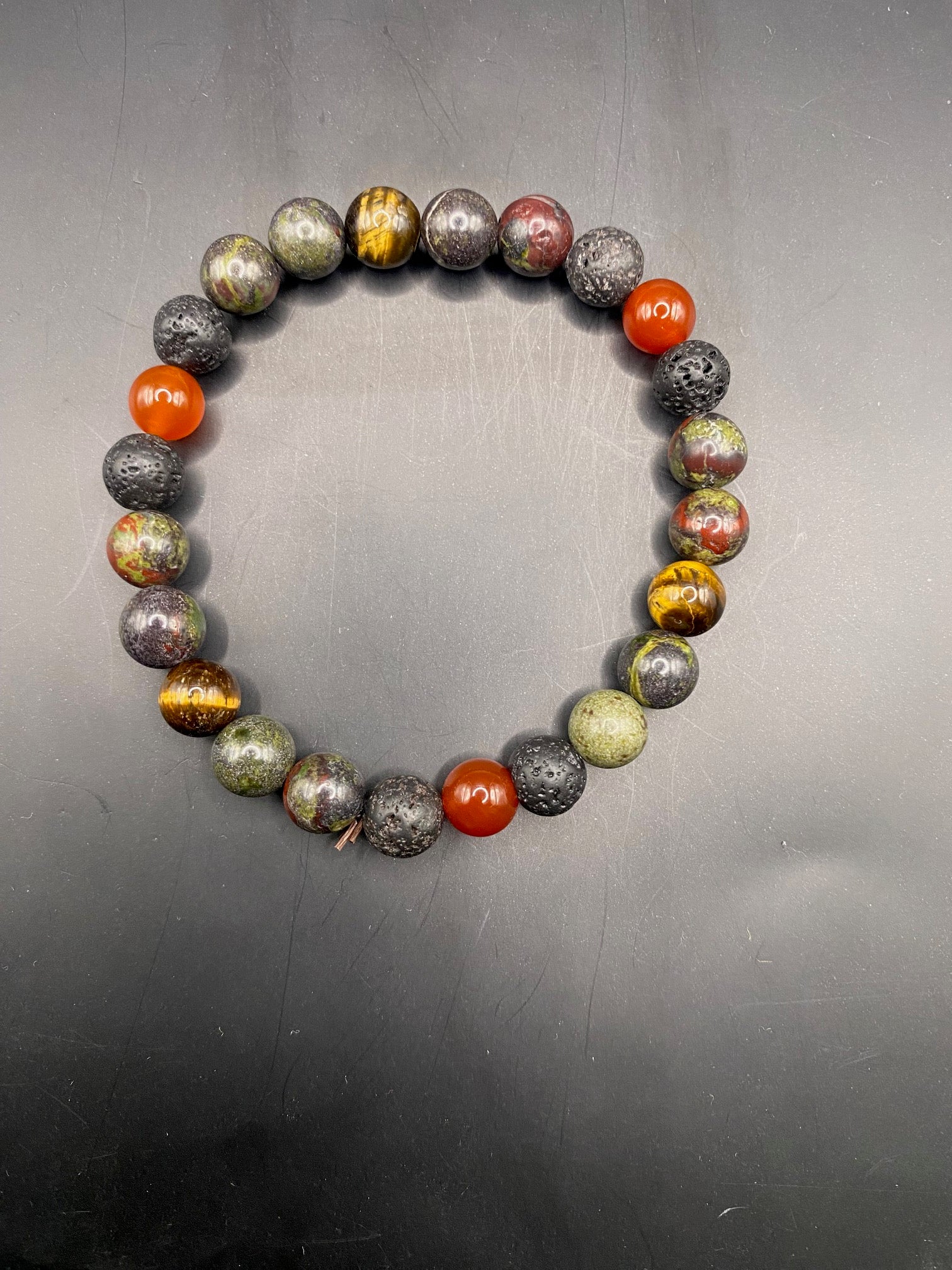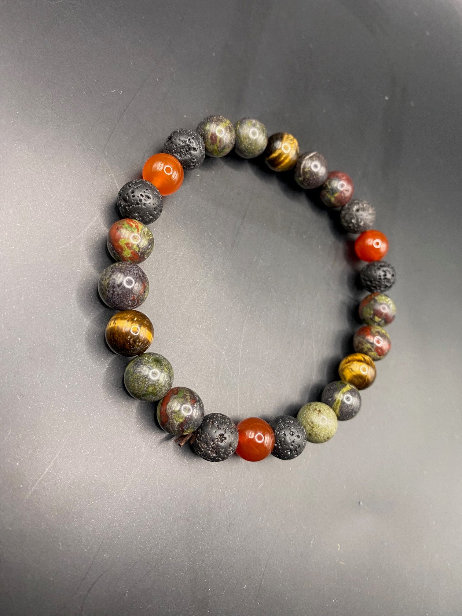 This piece is made using yellow tigers eye, carnelian, lava rock and African blood stone <3