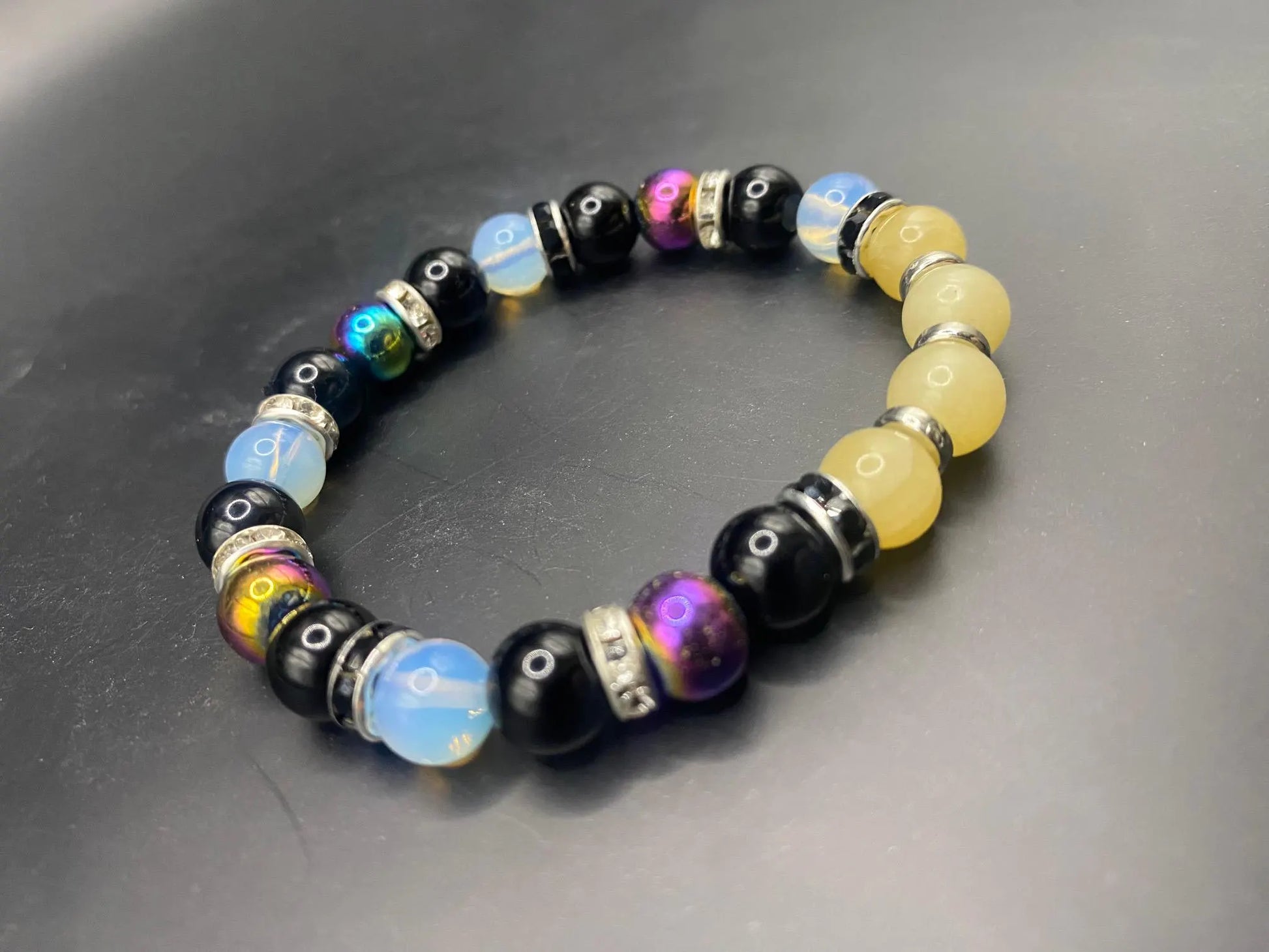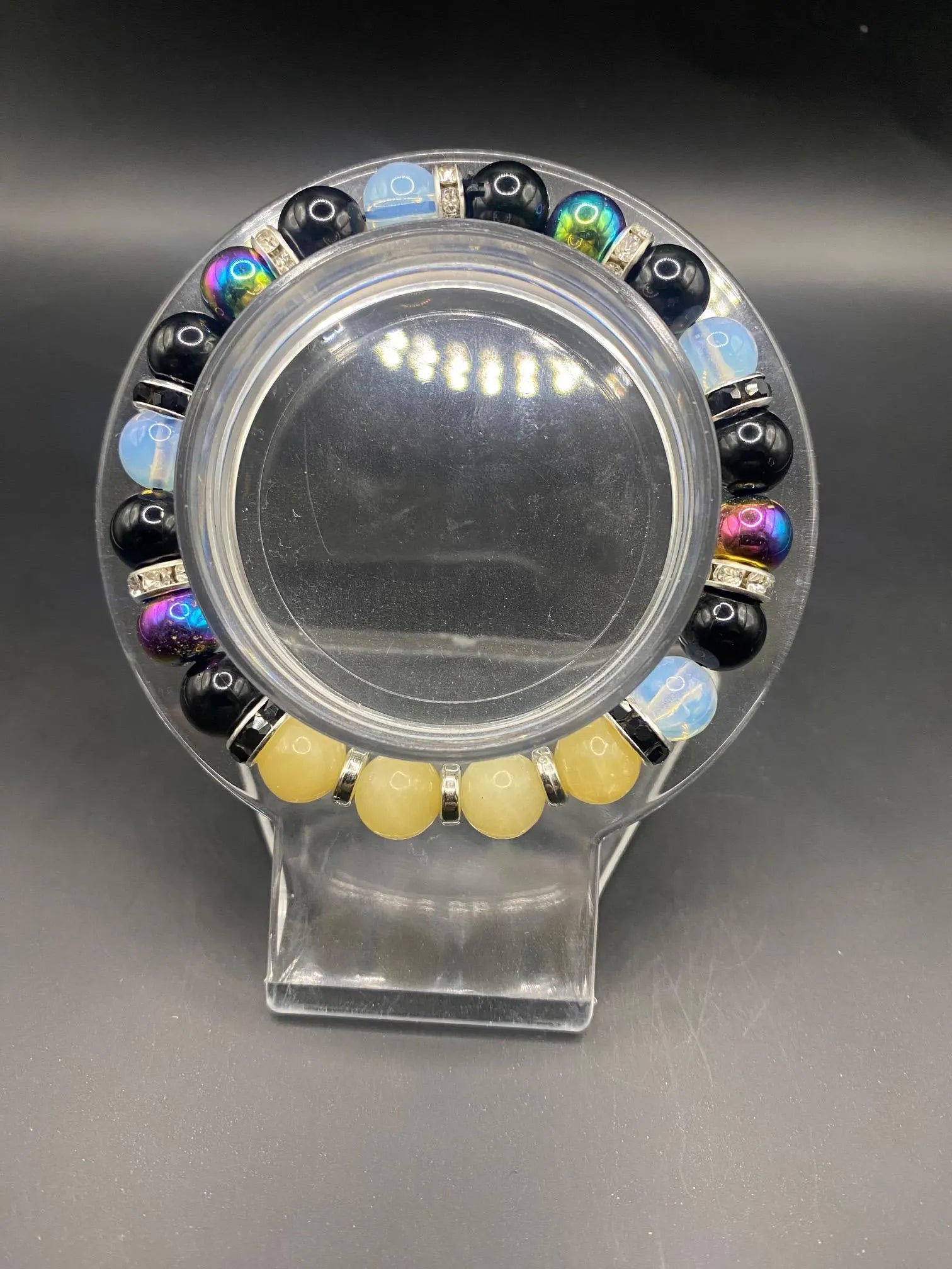 It's made with aura hematite, opalite, obsidian and honey calcite beads with silver spacers <3