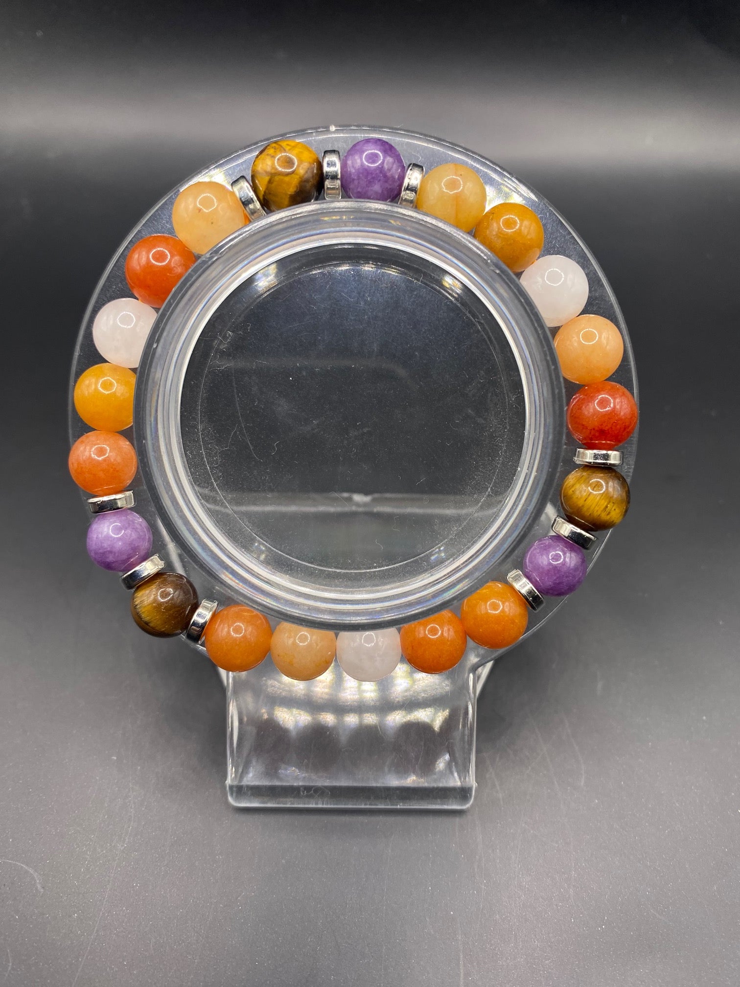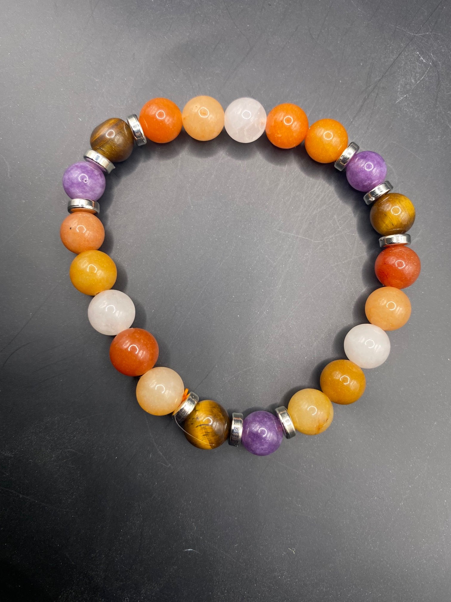 It's made with white jade, tigers eye, amethyst and red aventurine stone beads with silver colored spacers <3