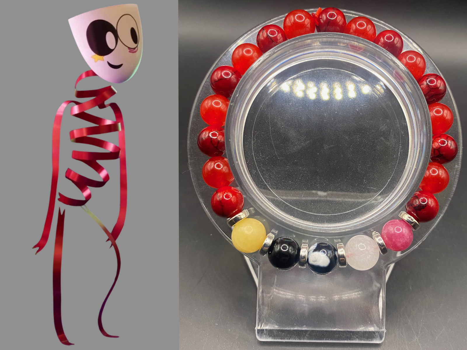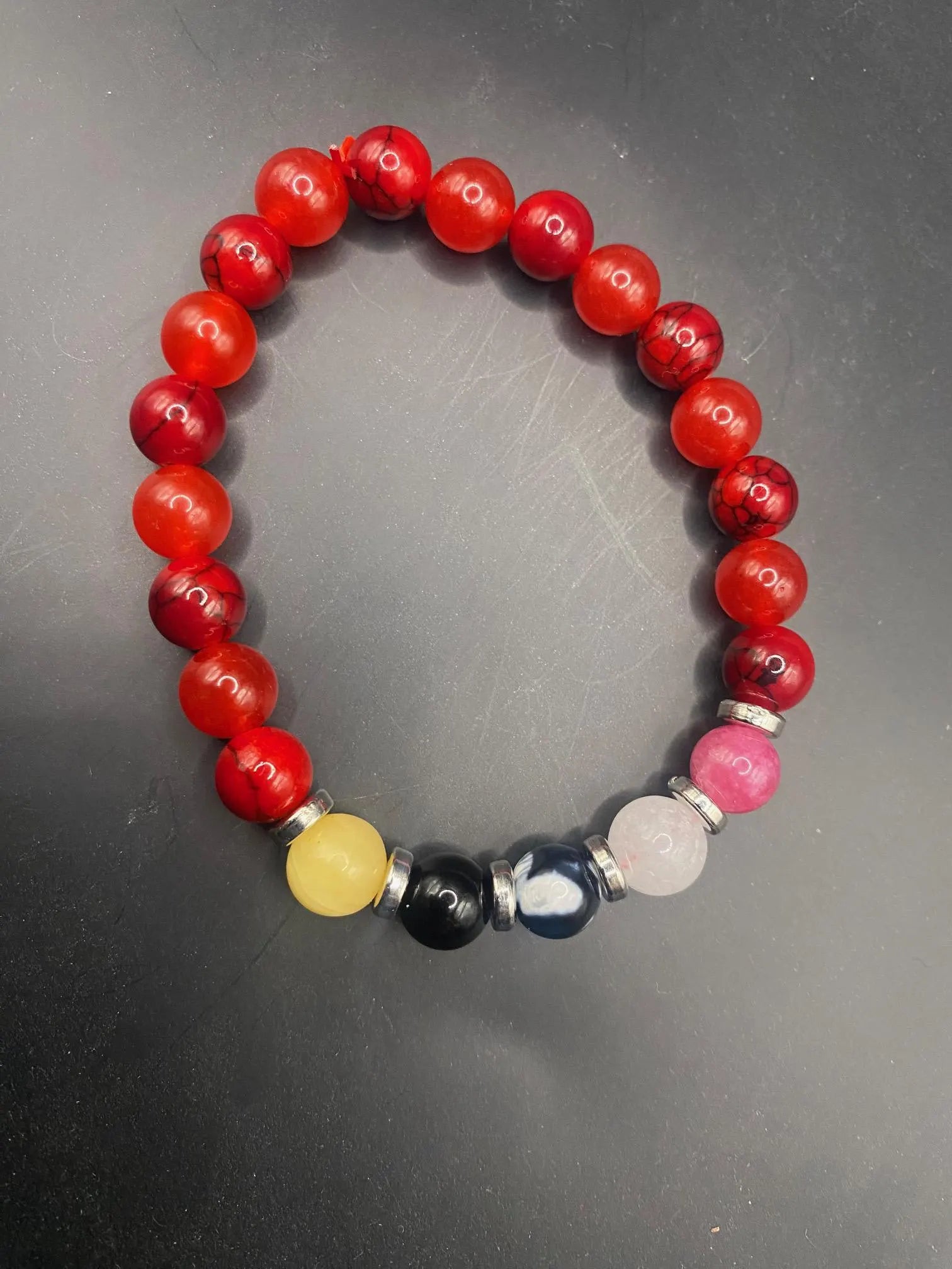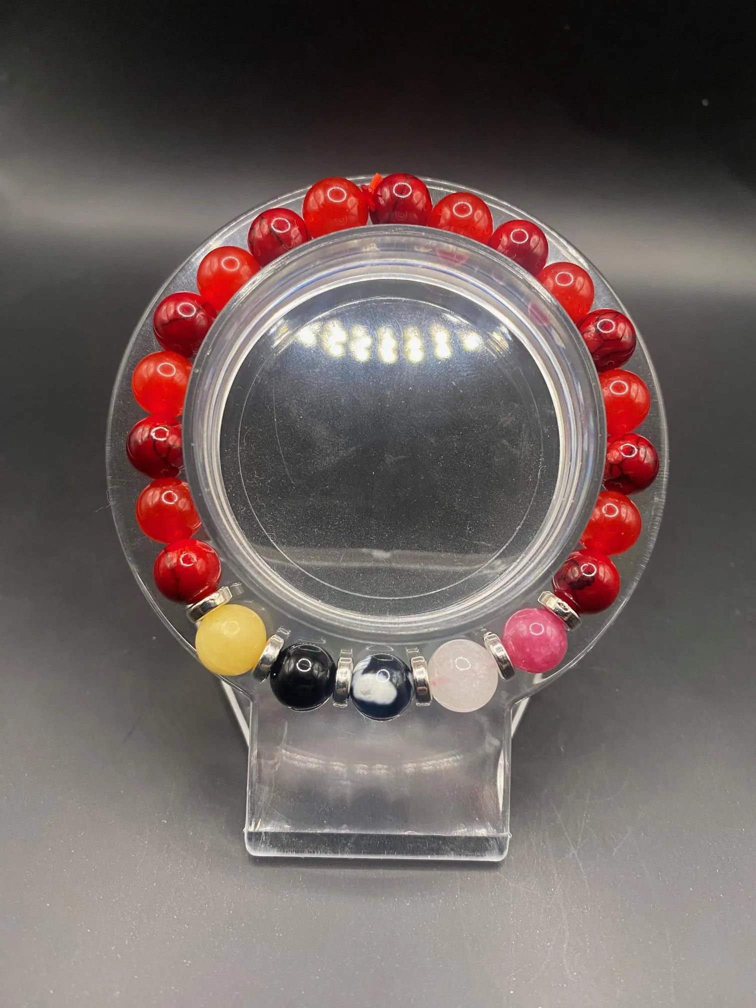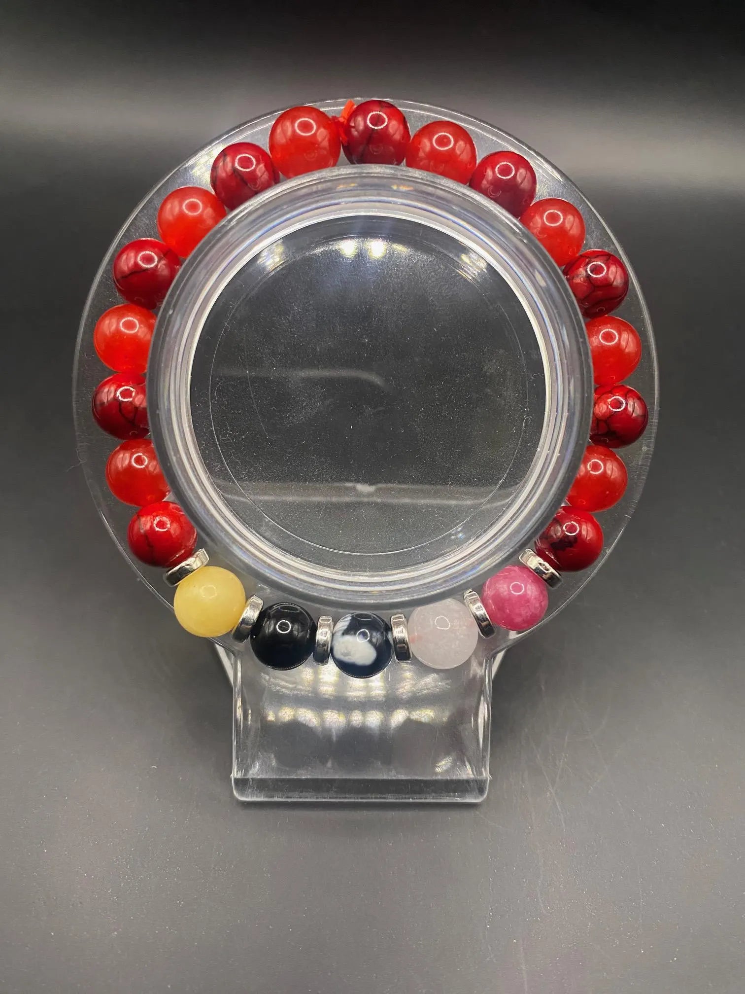 It's made with red quartz, red coral jade, honey calcite, orca agate, white jade and pink chalcedony beads with silver spacers <3