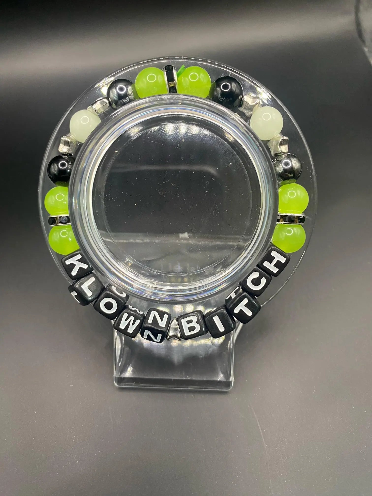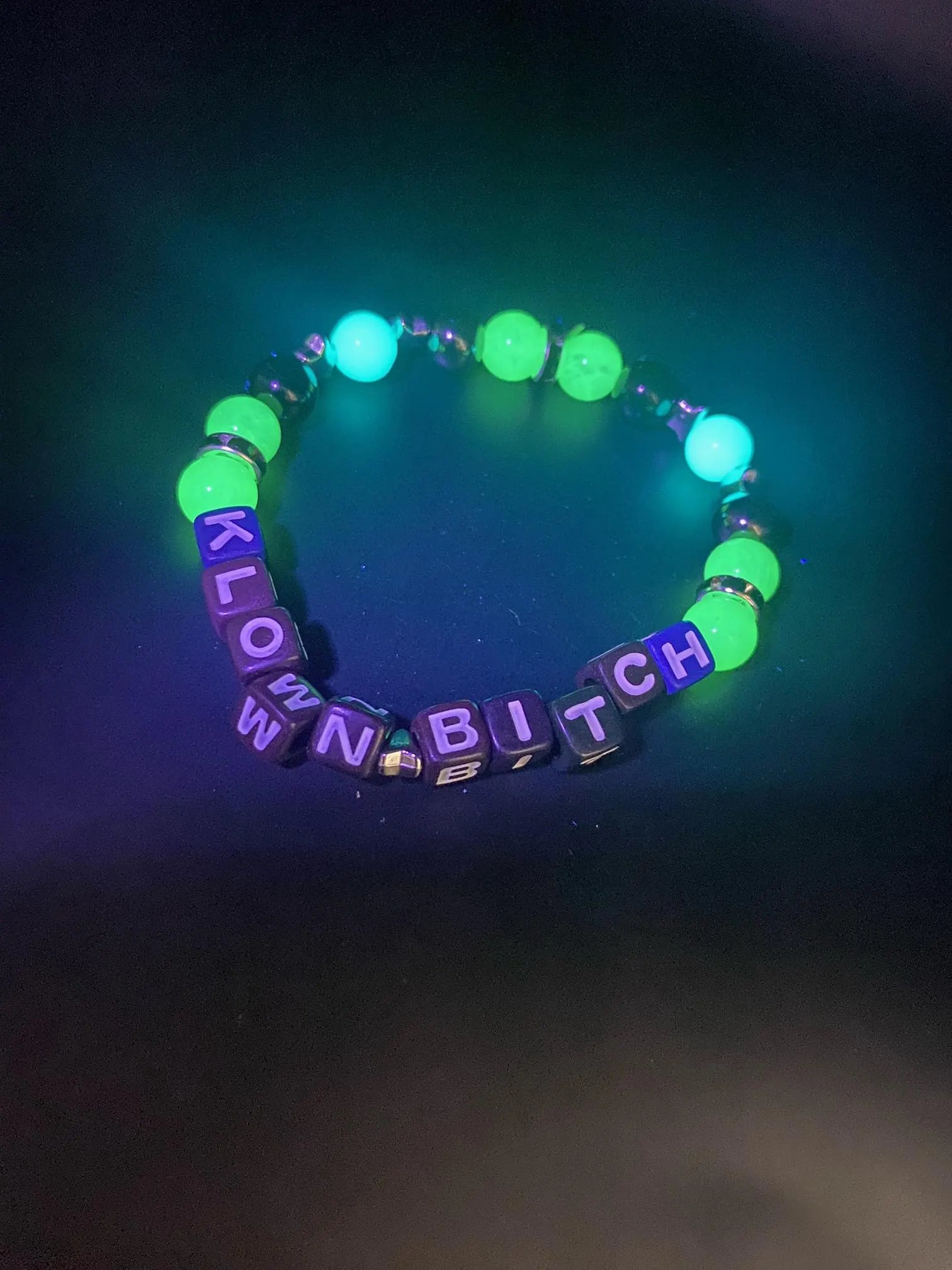 It's made with hematite, apple chalcedony, obsidian and luminous stone (glows under UV!) with plastic letter beads and silver colored spacers <3