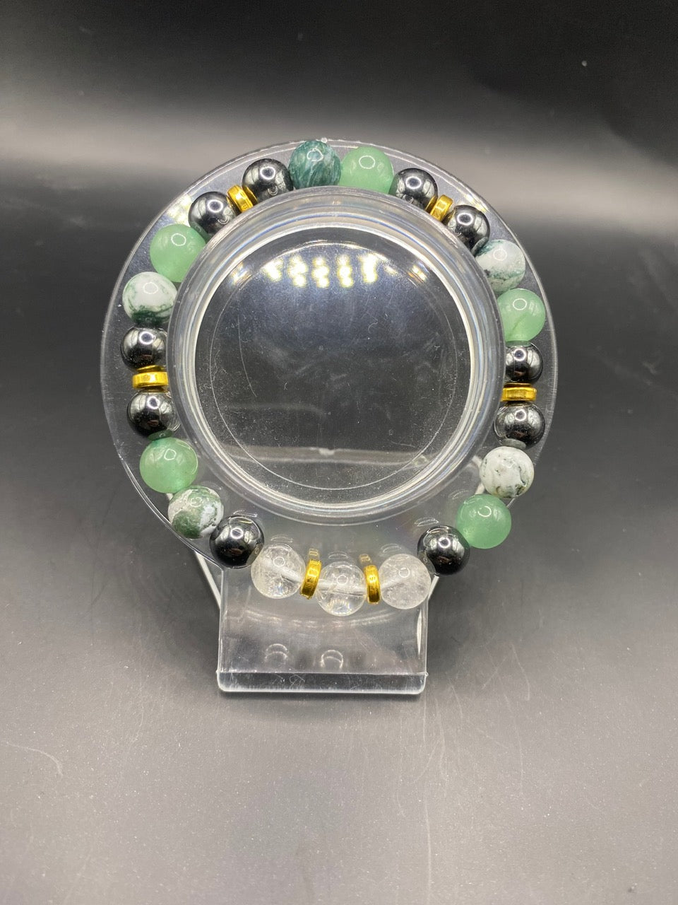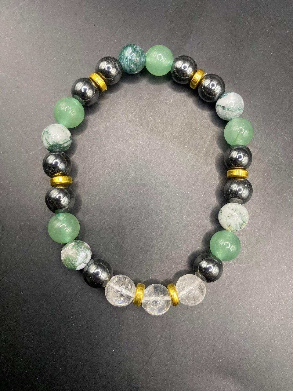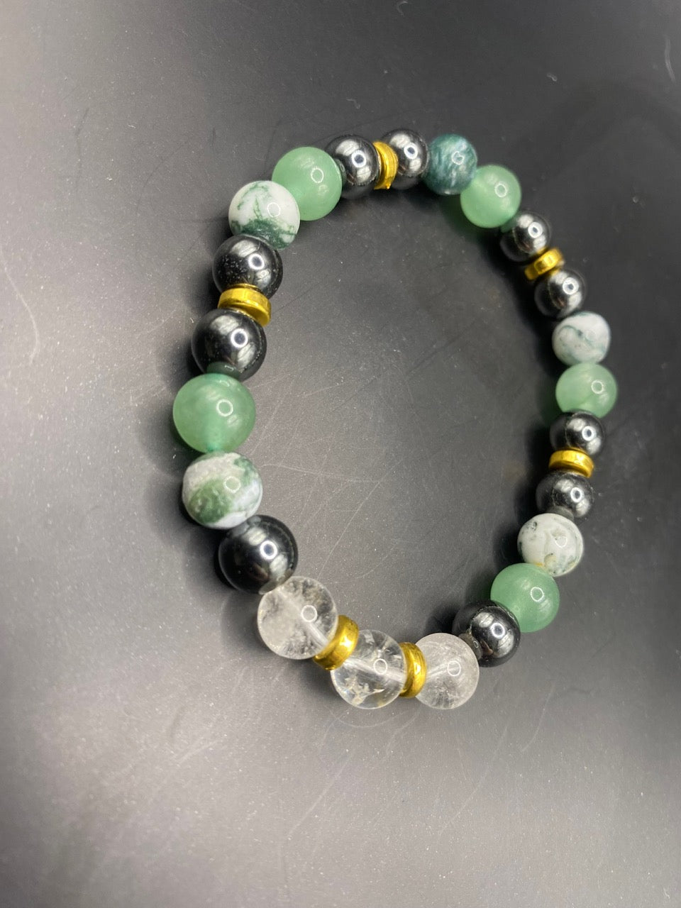 This piece is made using clear quartz, tree agate, green aventurine and hematite beads with gold spacers <3