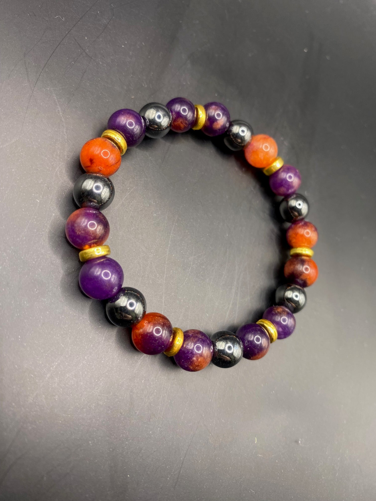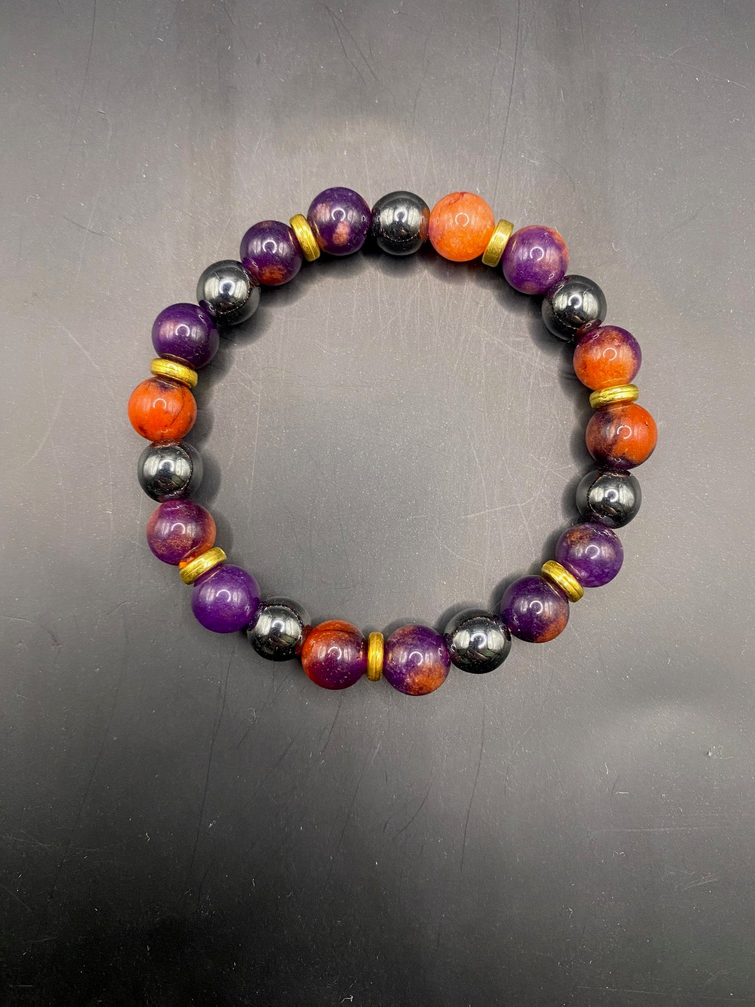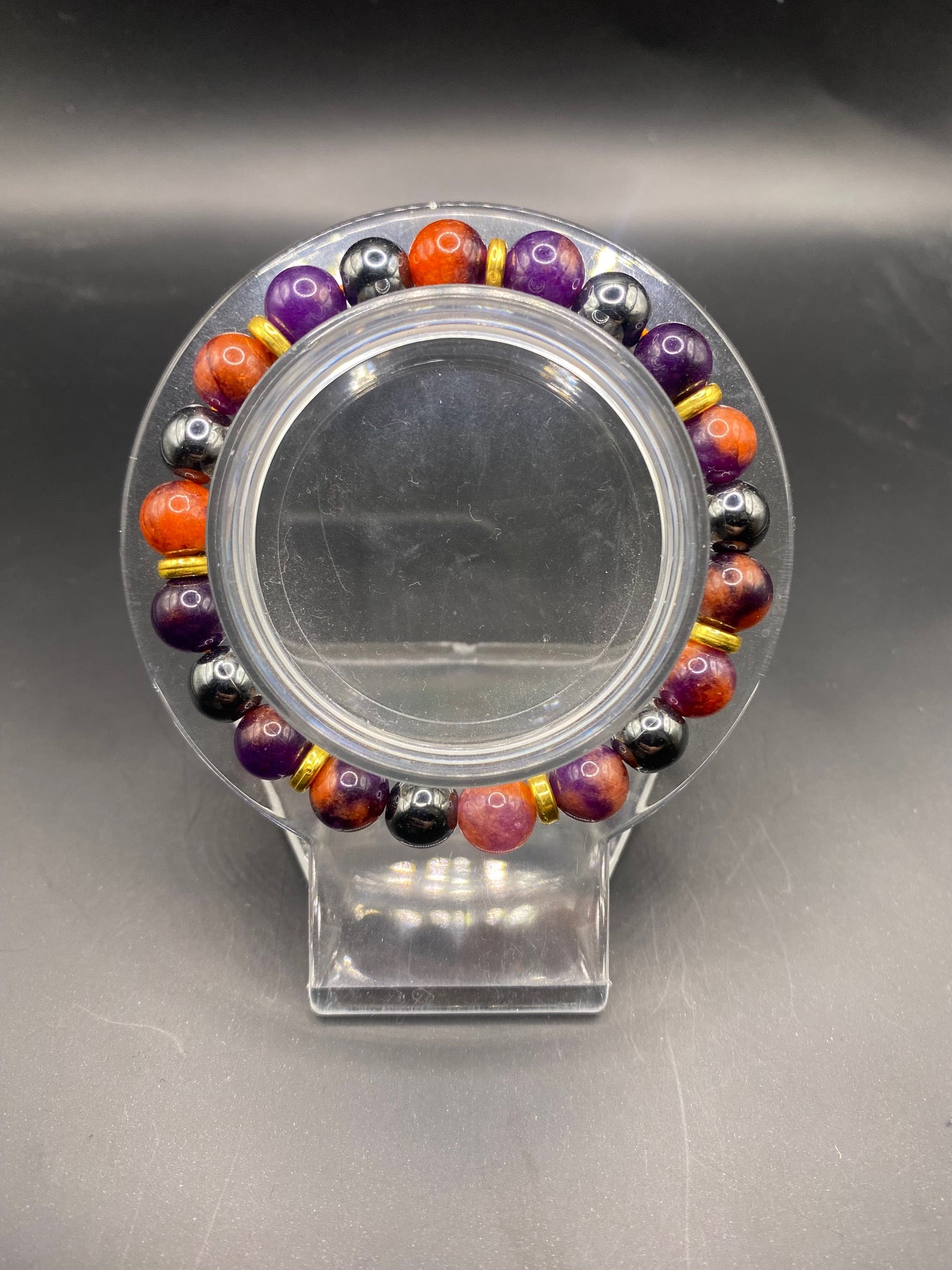 This piece is made using dyed jasper and hematite with gold spacers <3