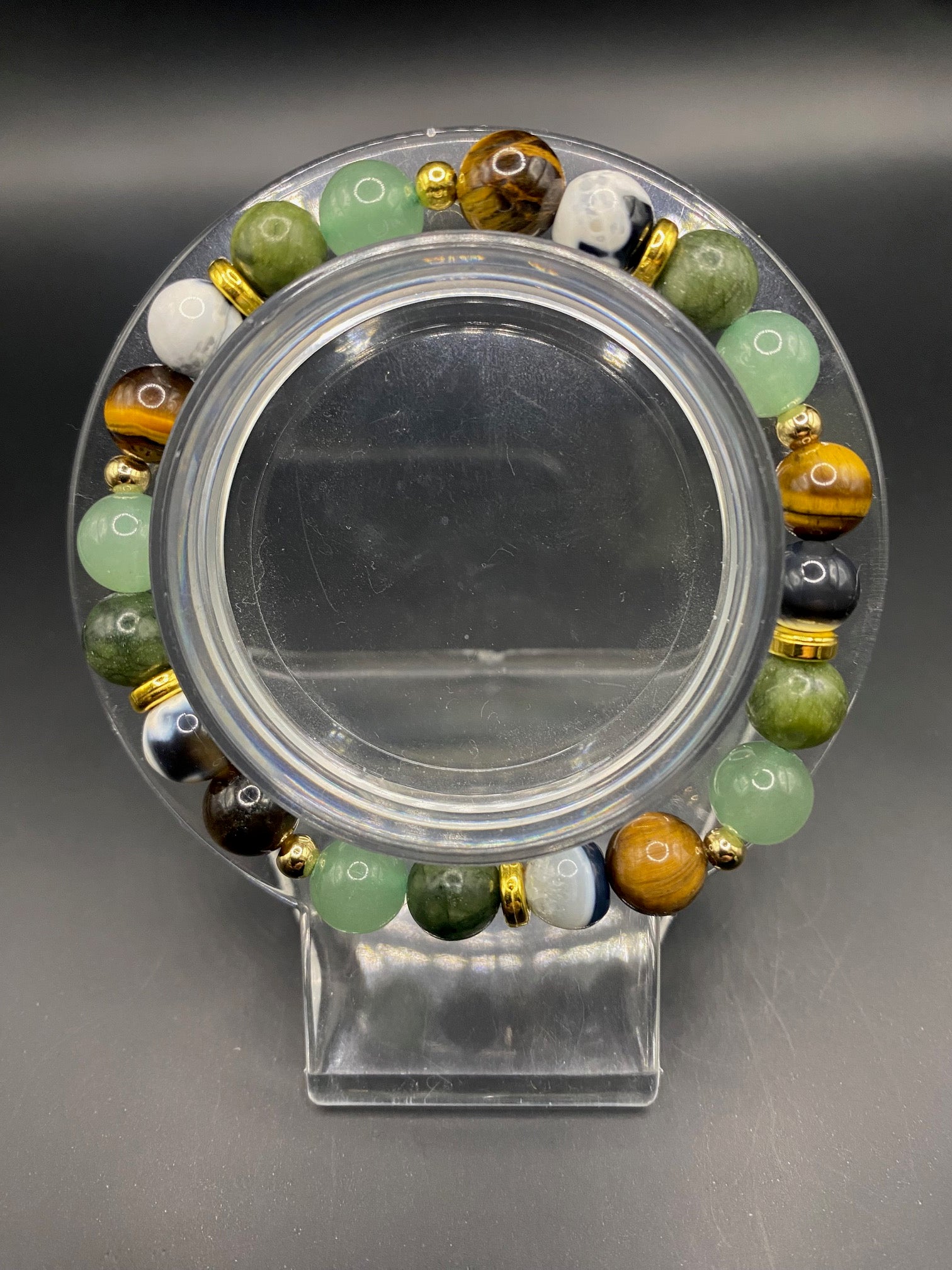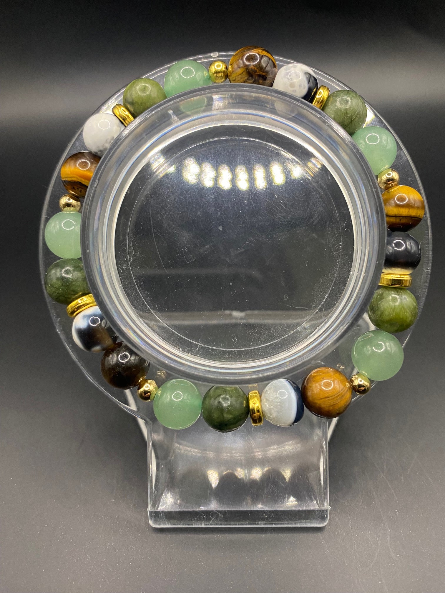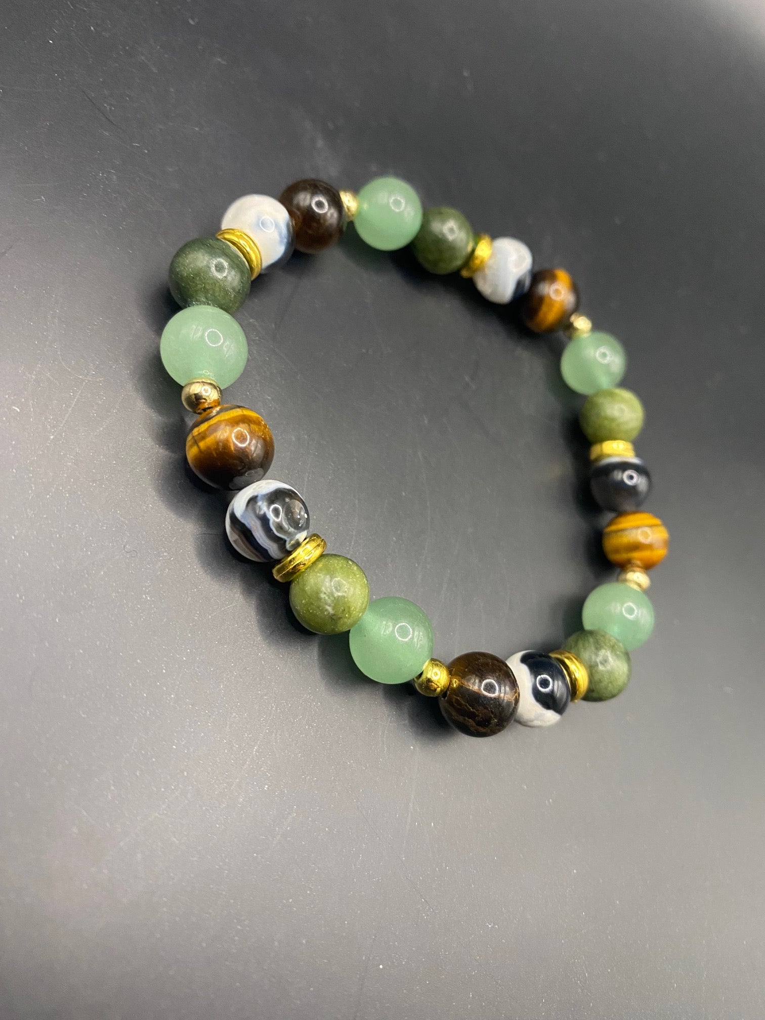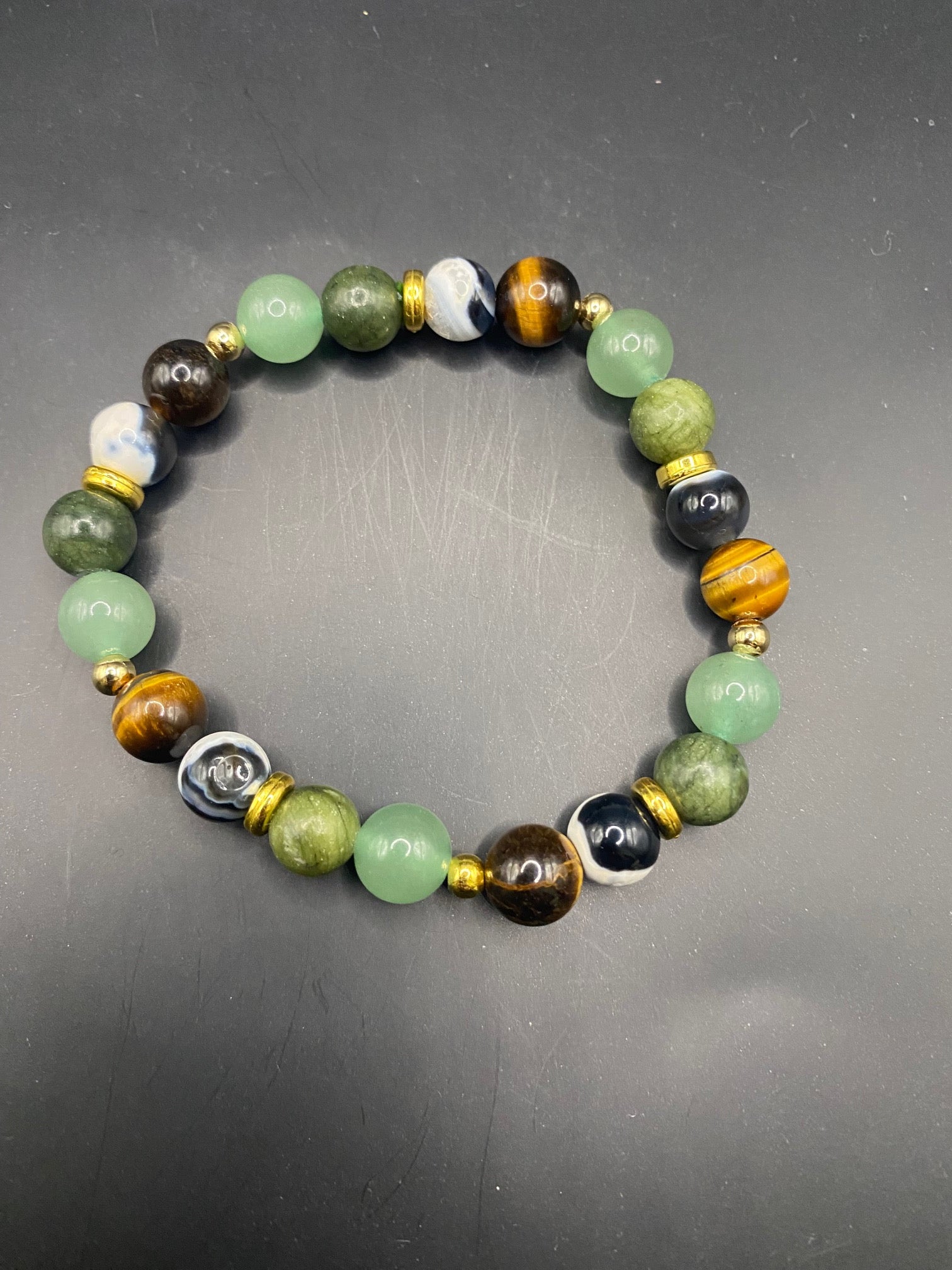It's made with green aventurine, tigers eye, jade and orca agate bead with gold colored spacers <3