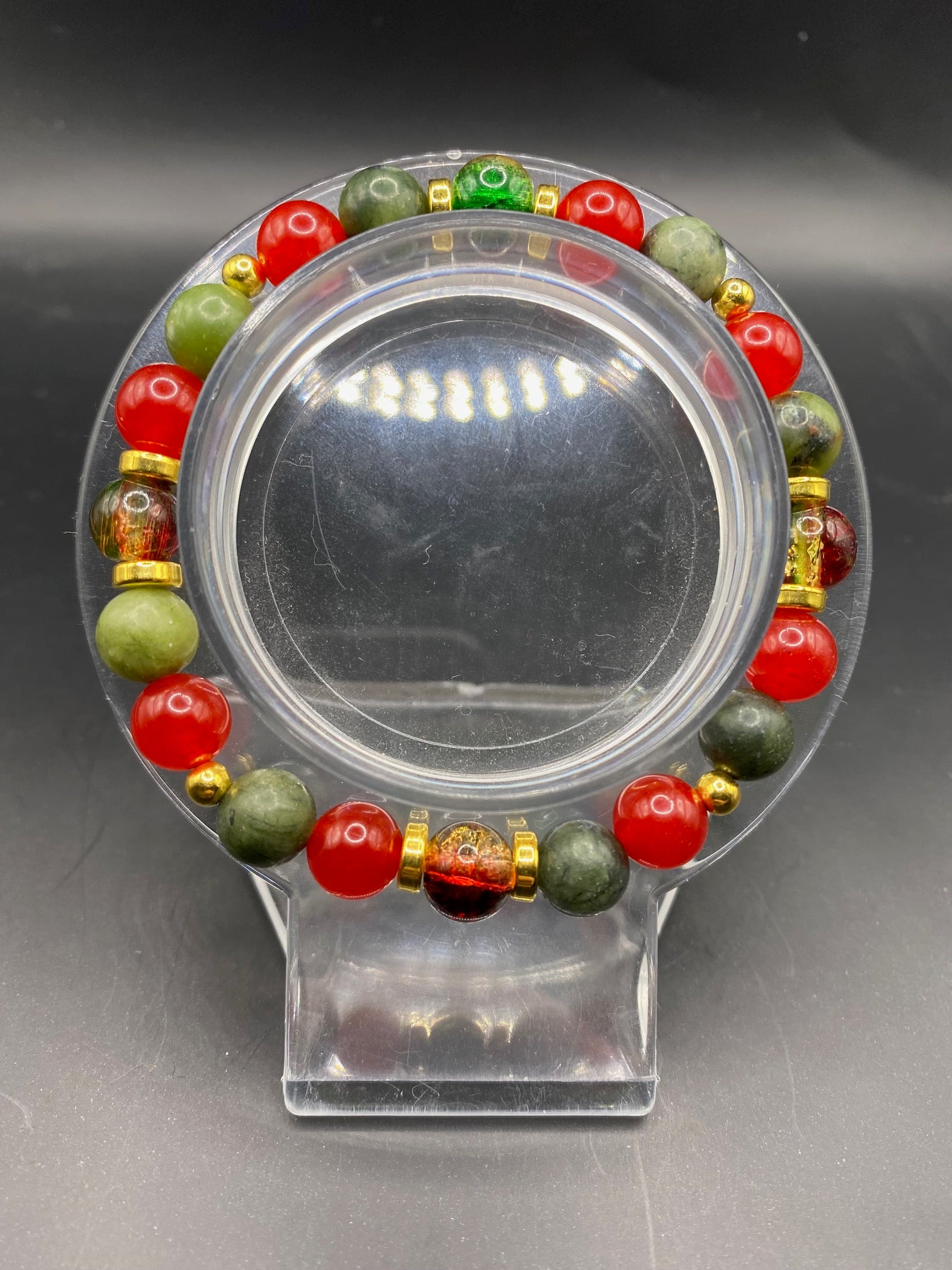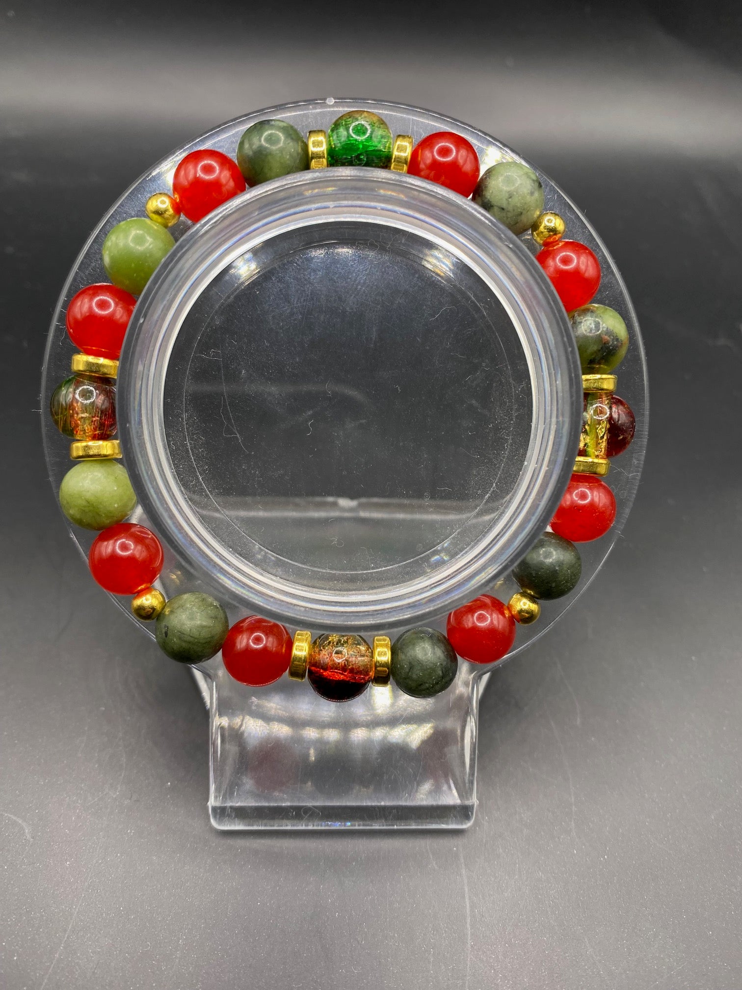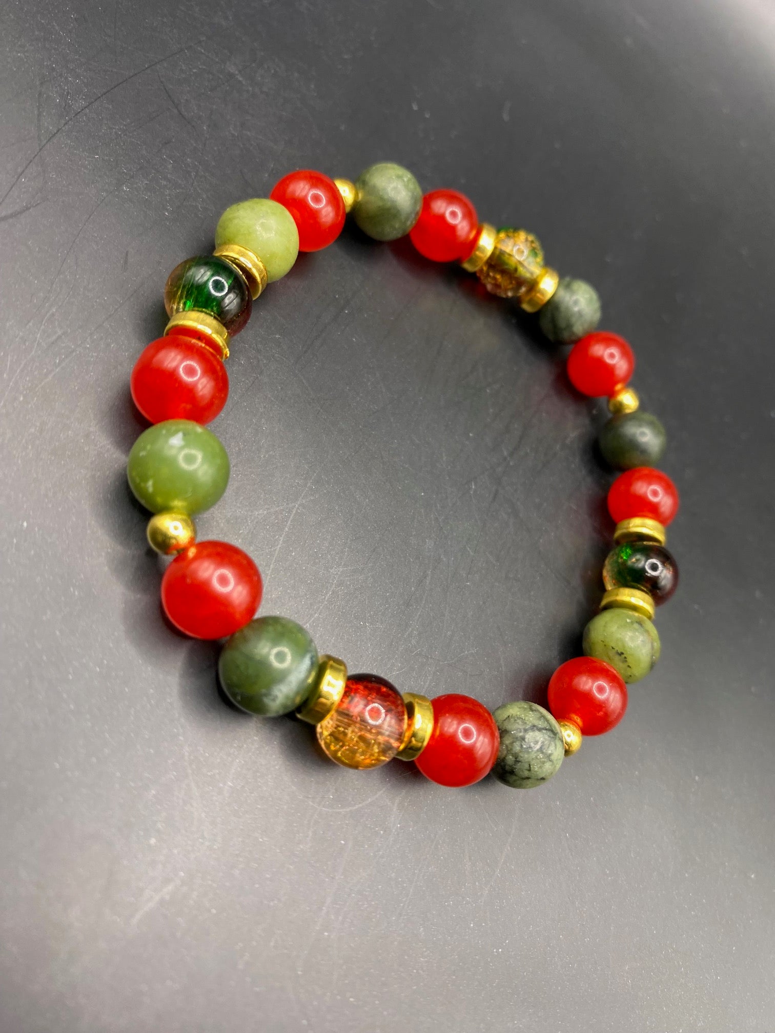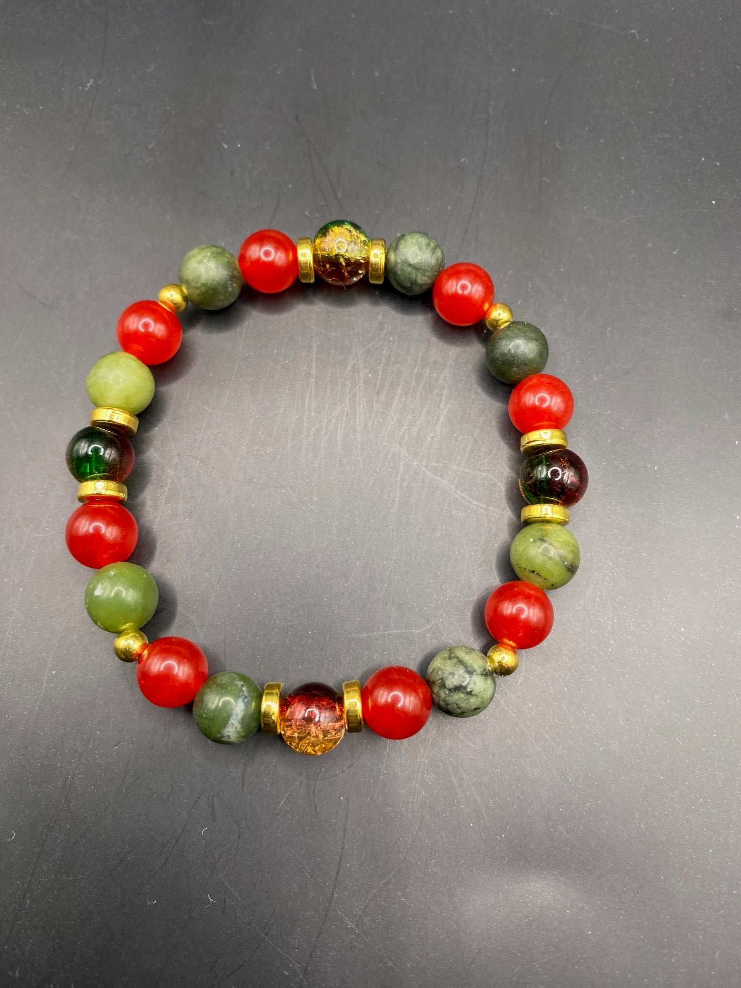 This piece is made using glass beads as well as southern jade and red coral jade stone beads with gold colored spacers <3