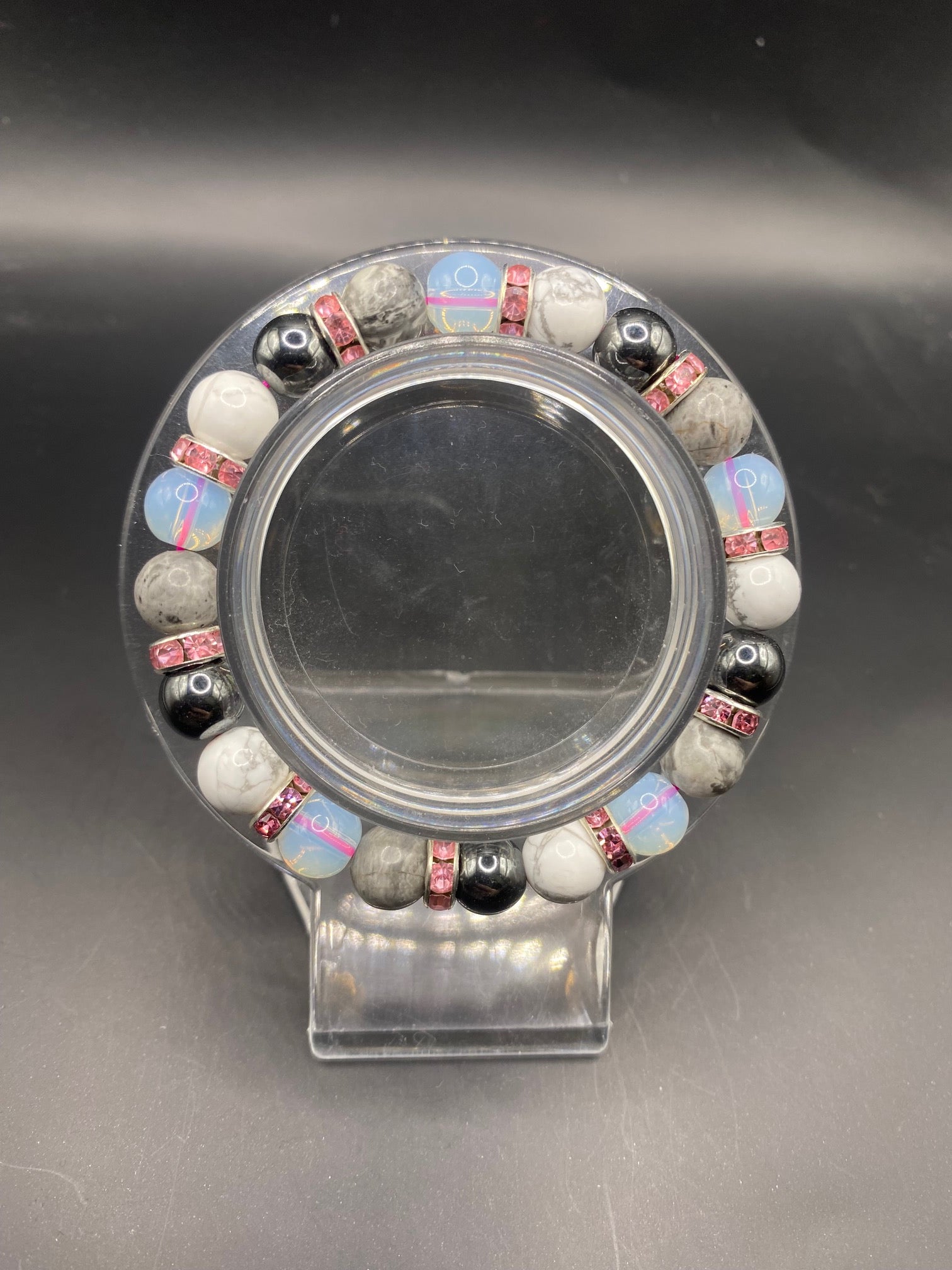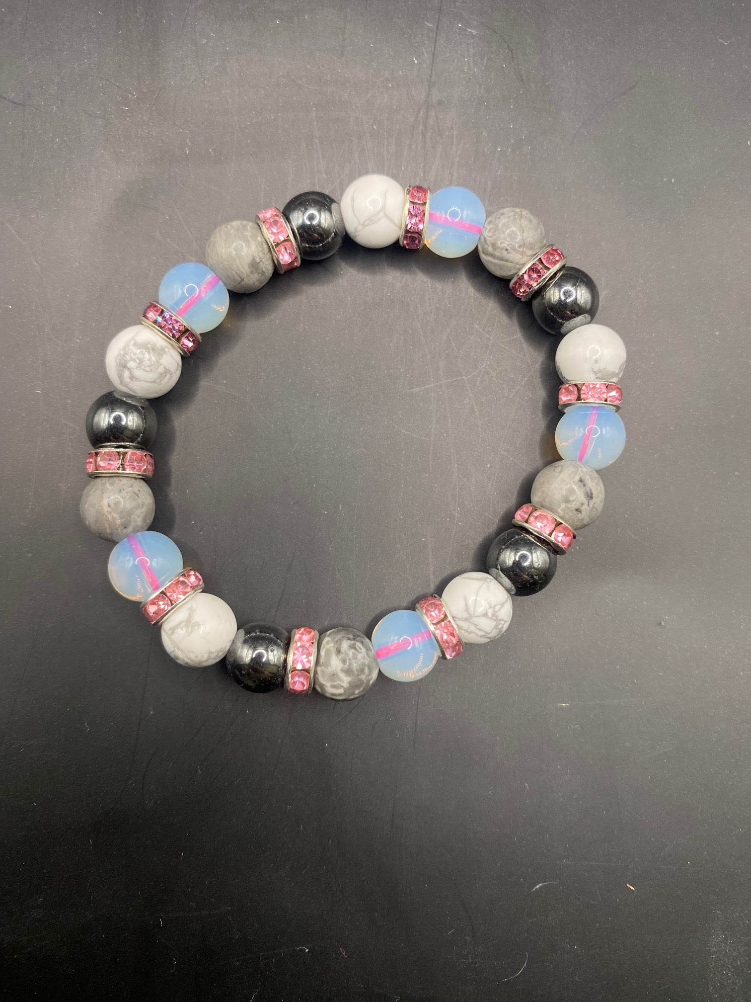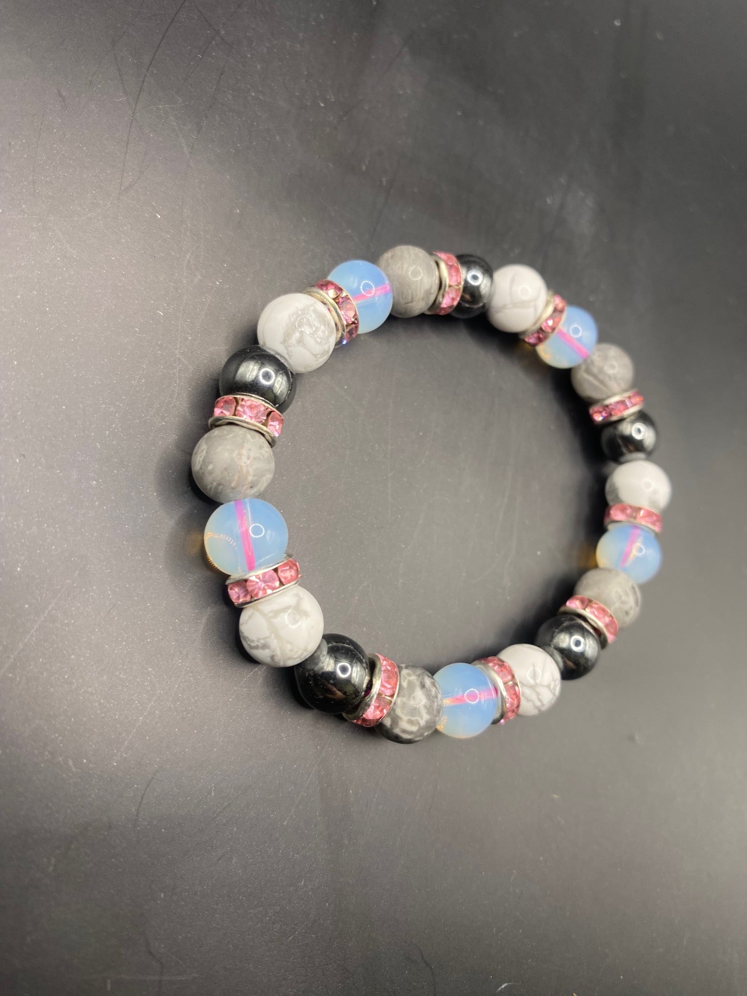This piece is made using opalite, howlite, hematite and Picasso stone with silver spacers <3