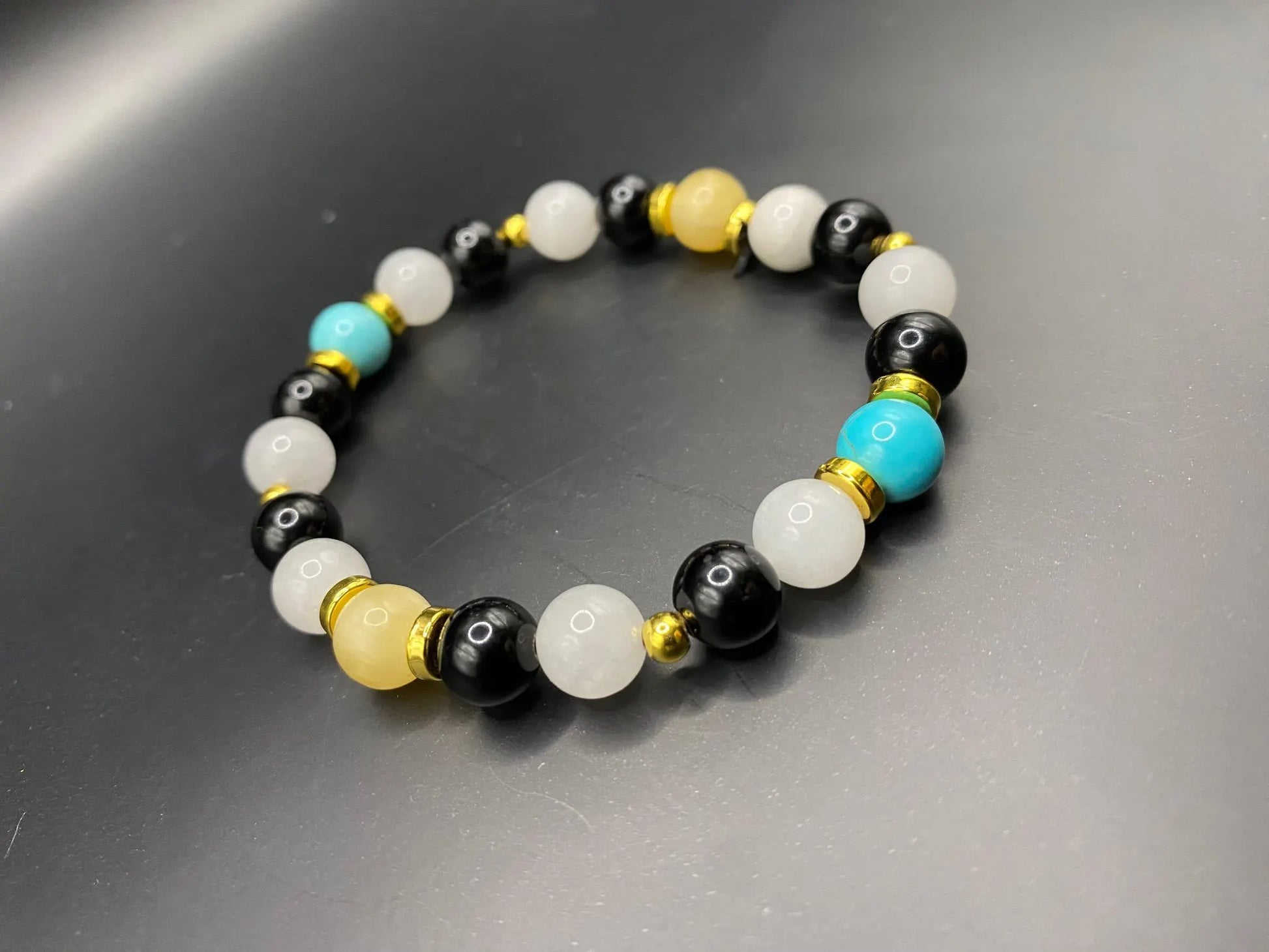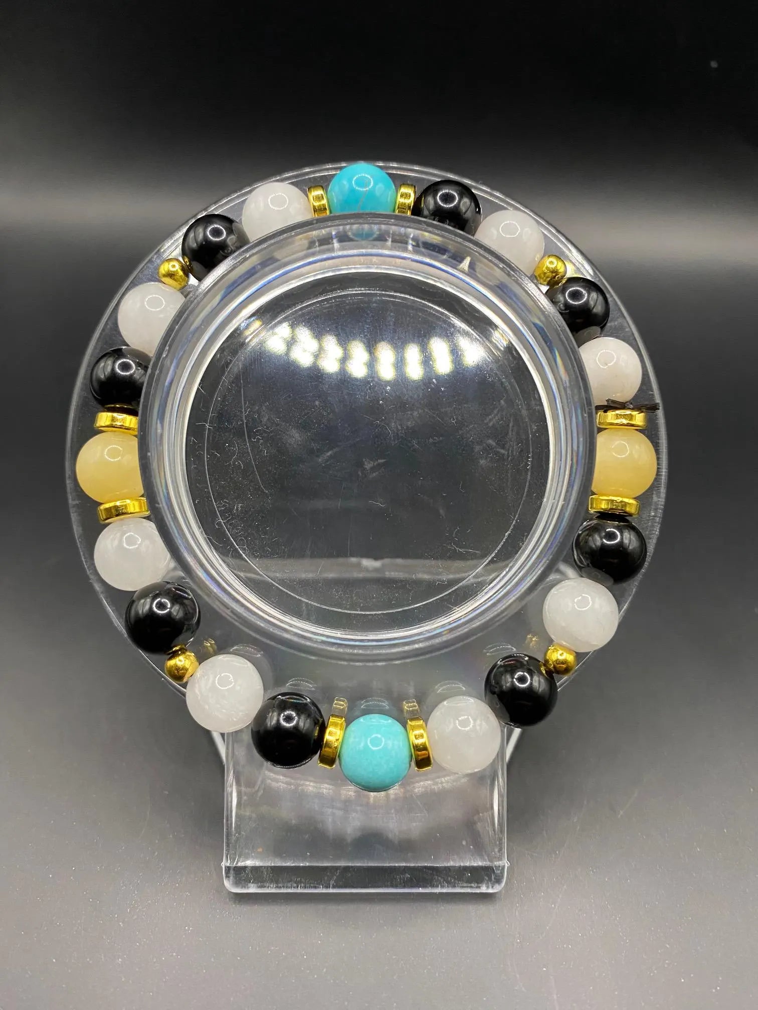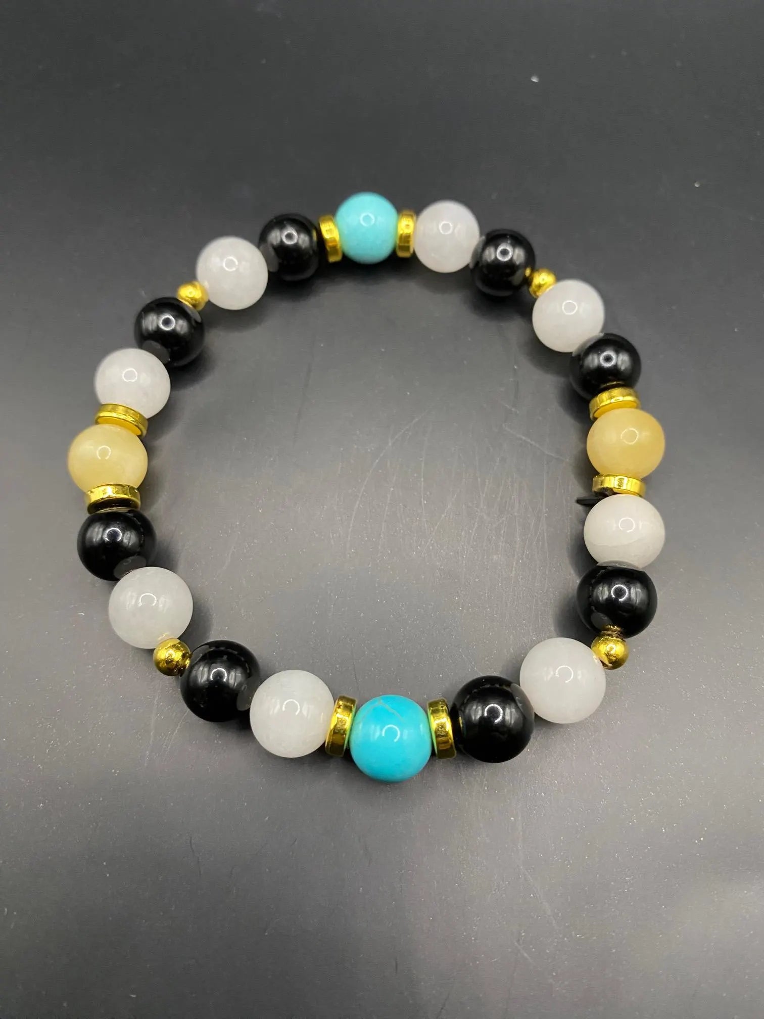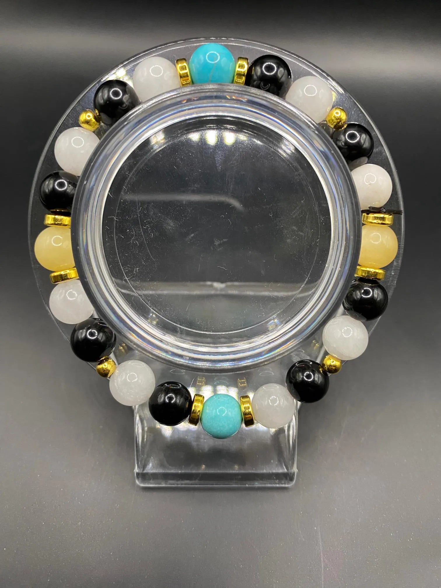 It's made with obsidian, white jade, honey calcite and blue turquoise beads with gold spacers <3