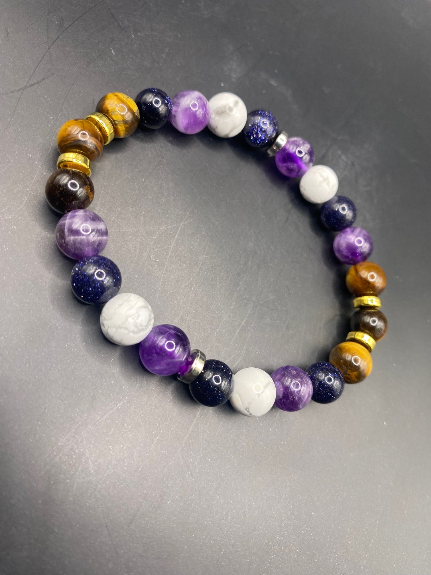 It's made with howlite, amethyst, tigers eye, blue sandstone and white jade stone beads with gold and silver colored spacers <3