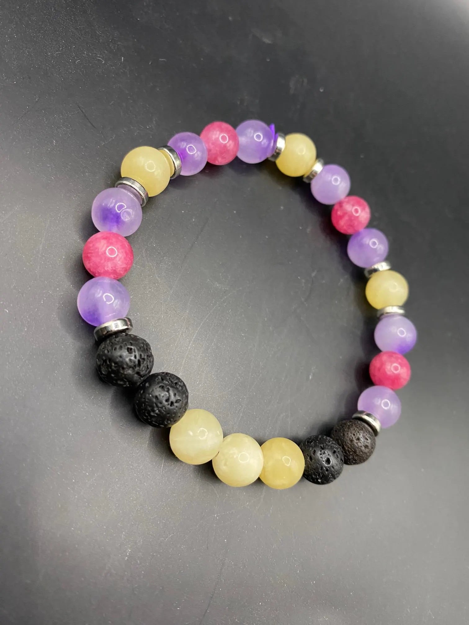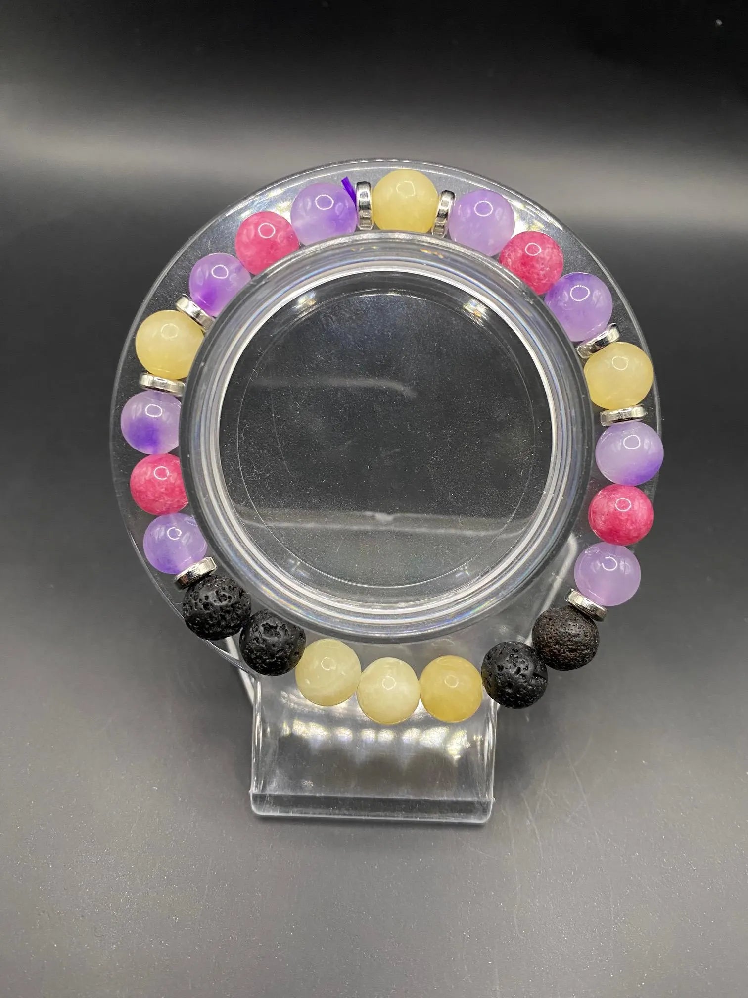 It's made with lavender chalcedony, honey calcite, lava rock and pink chalcedony beads with silver spacers <3