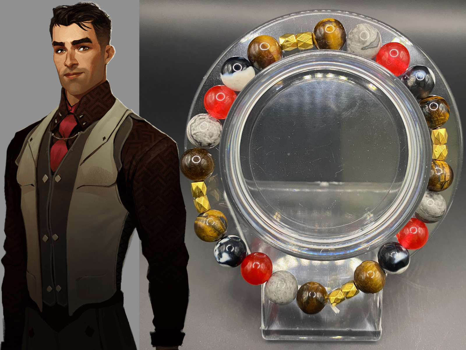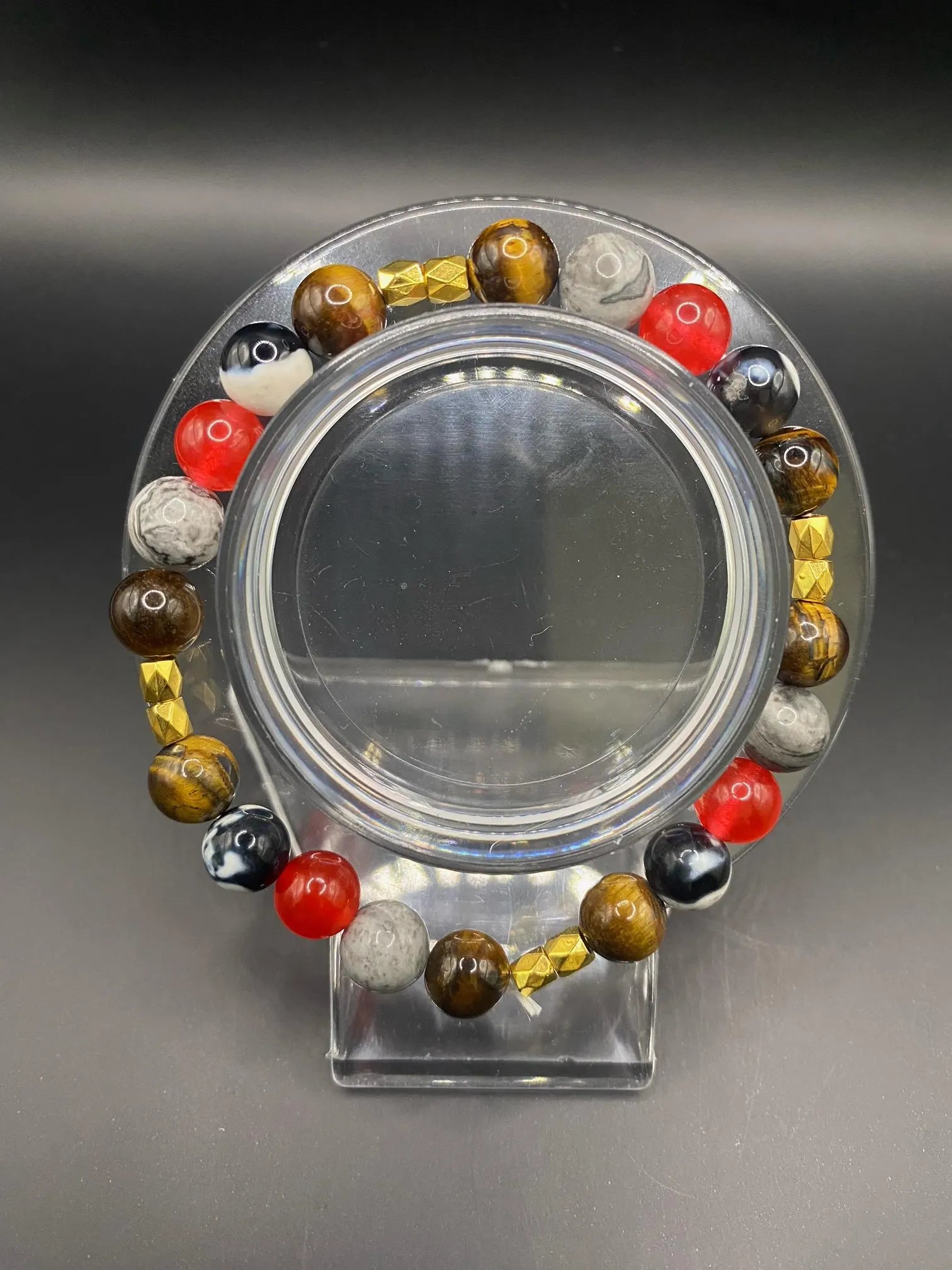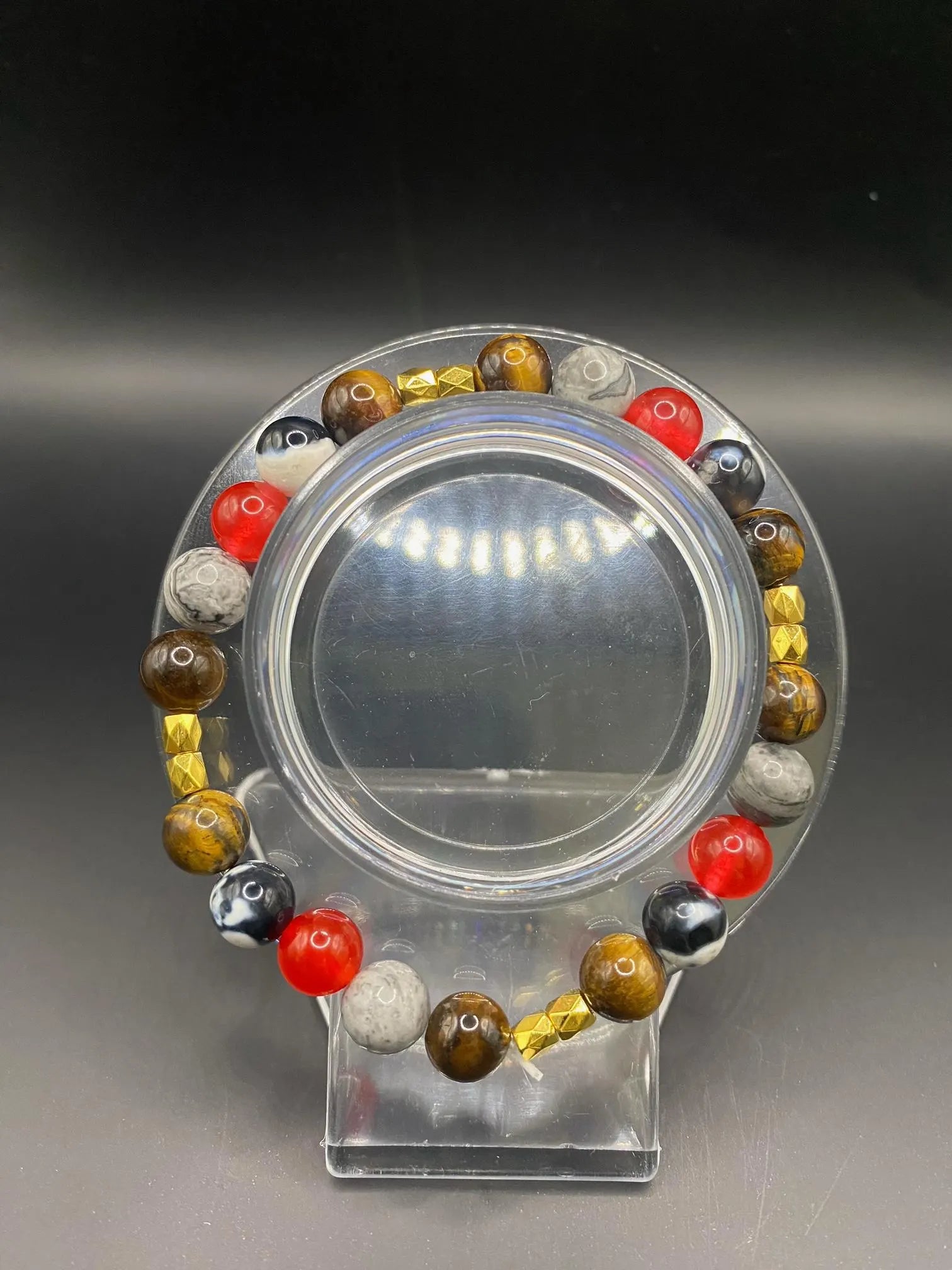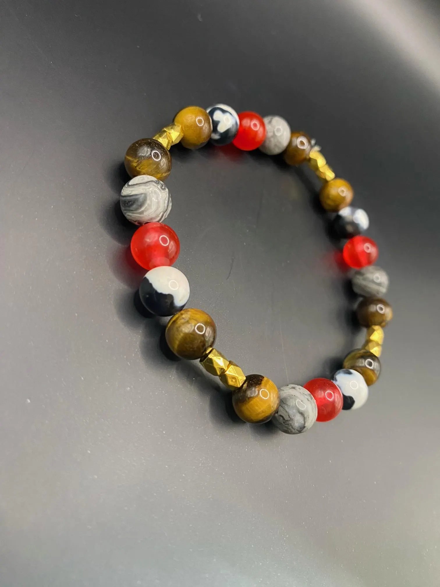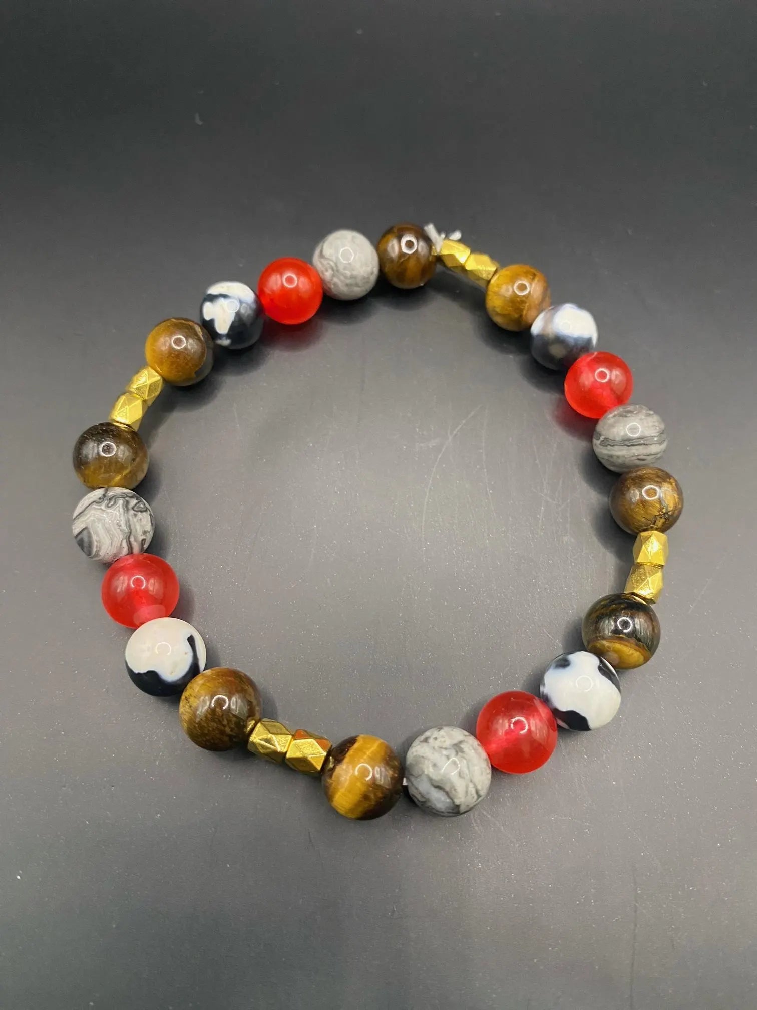 It's made with red coral jade, orca agate, Picasso stone and tigers eye beads and gold spacers <3