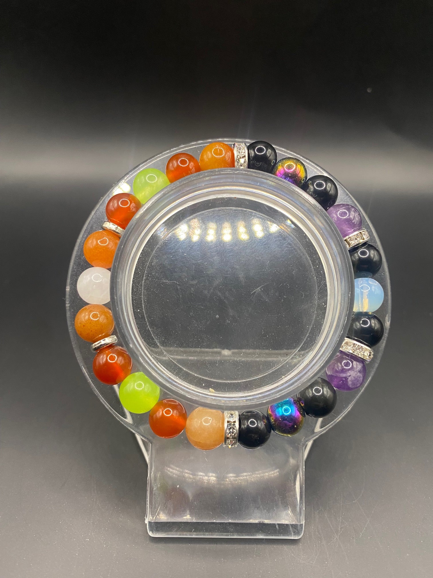 It's made with white jade, apple chalcedony, carnelian, red aventurine, opalite, obsidian and amethyst beads with silver spacers <3