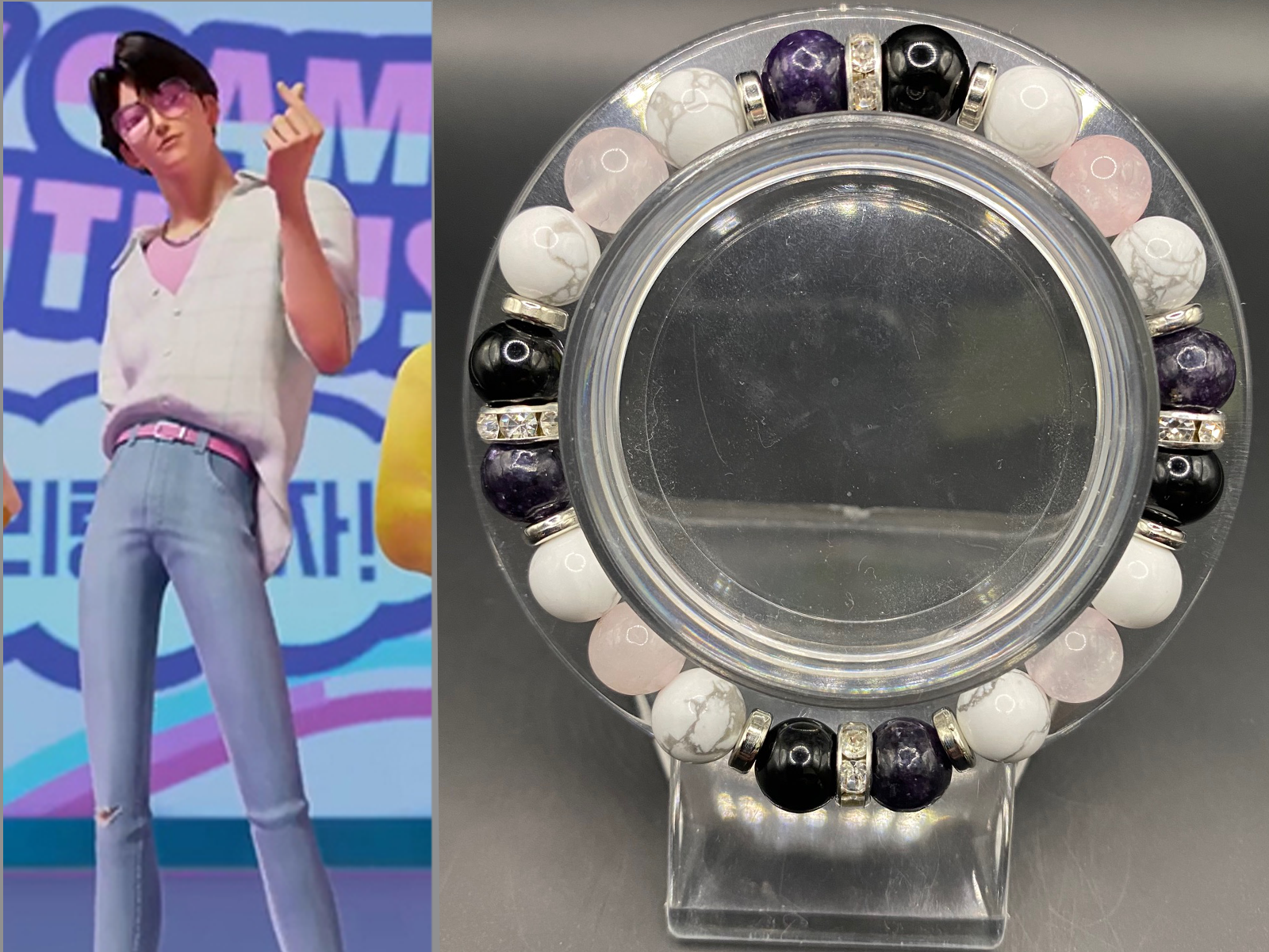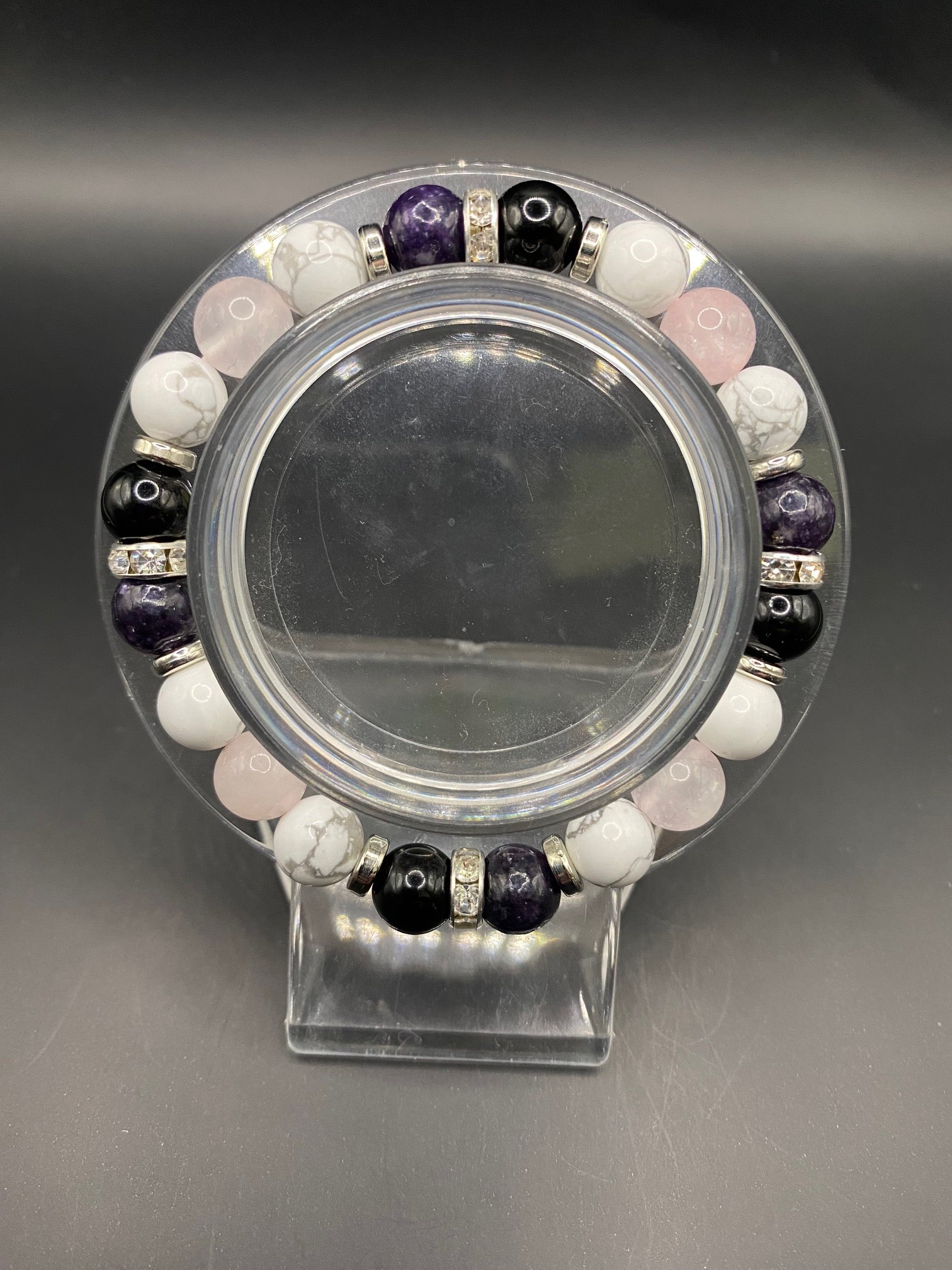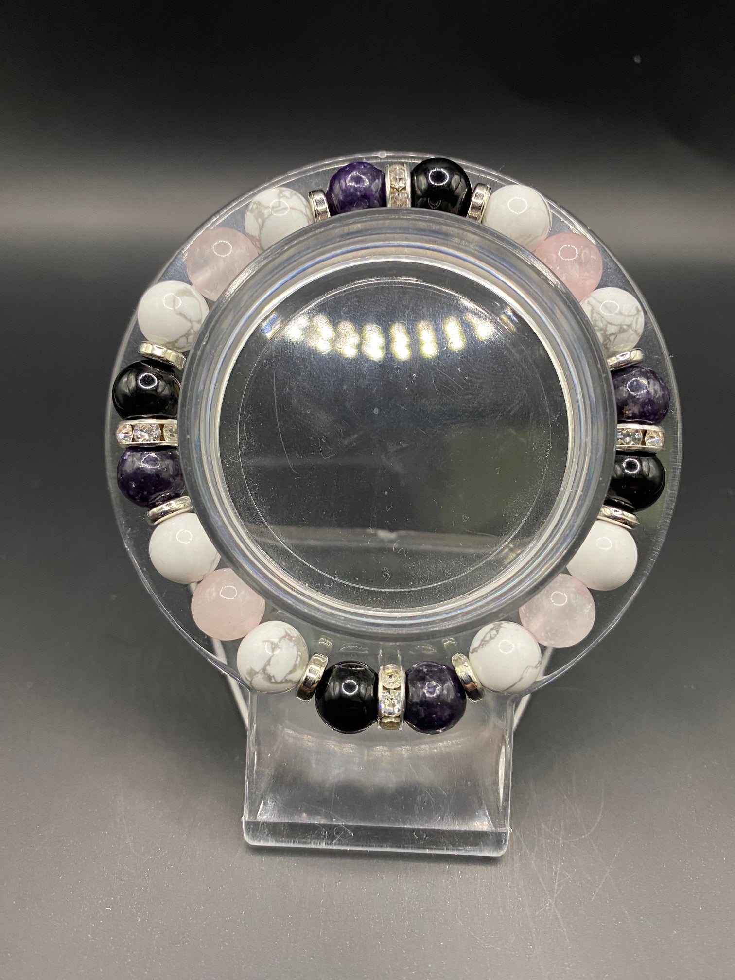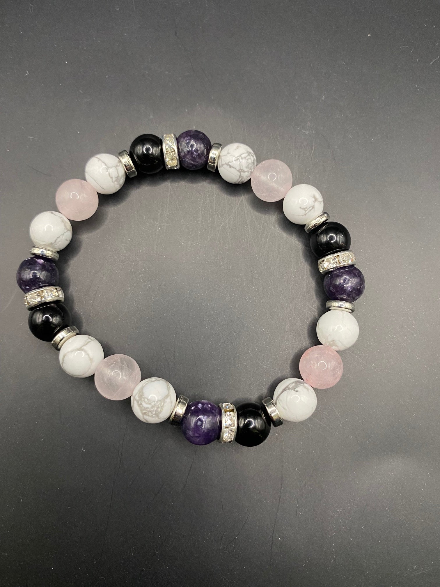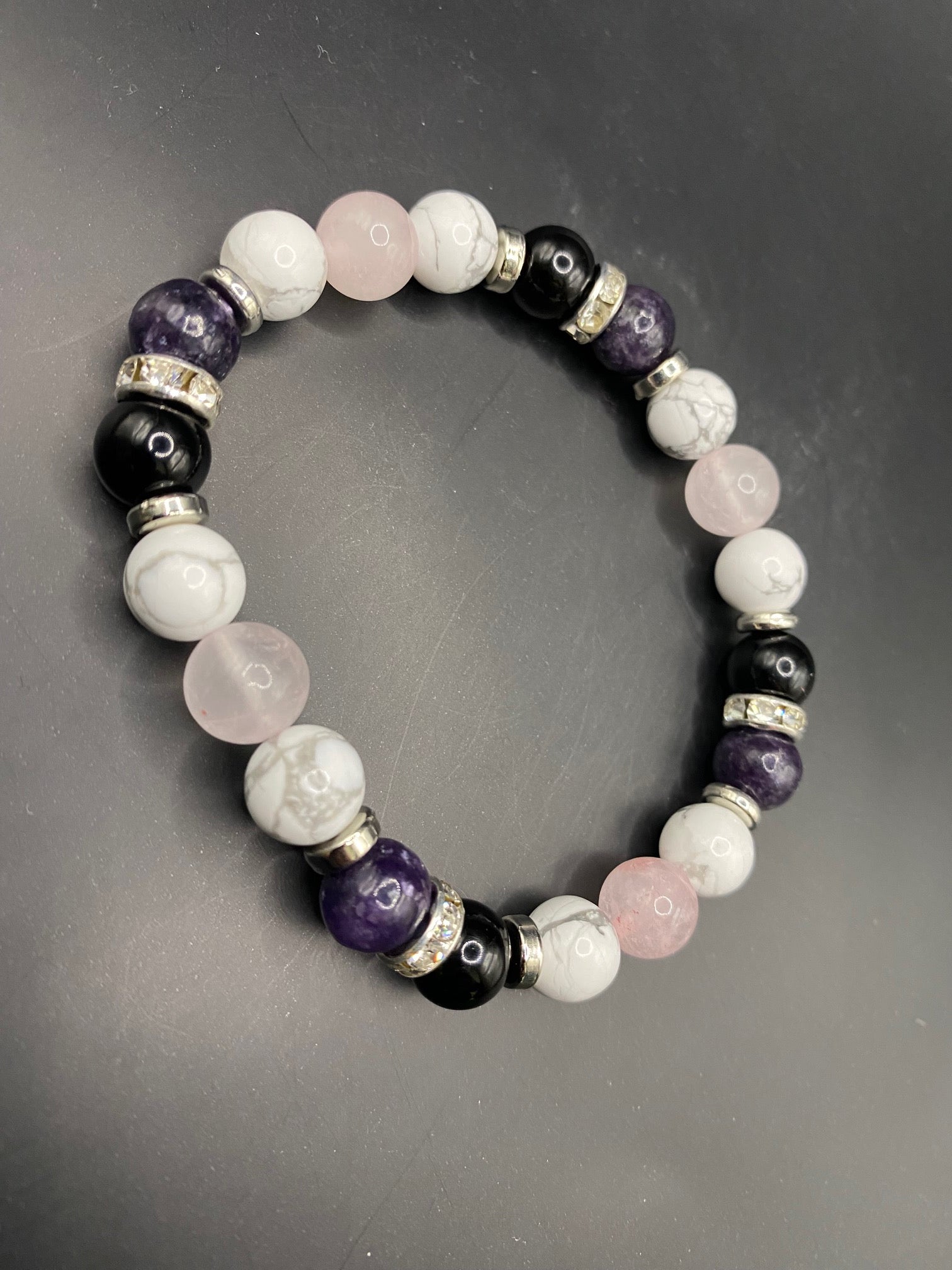 It's made with howlite, obsidian, rose quartz and high grade lepidolite beads with silver colored spacers <3