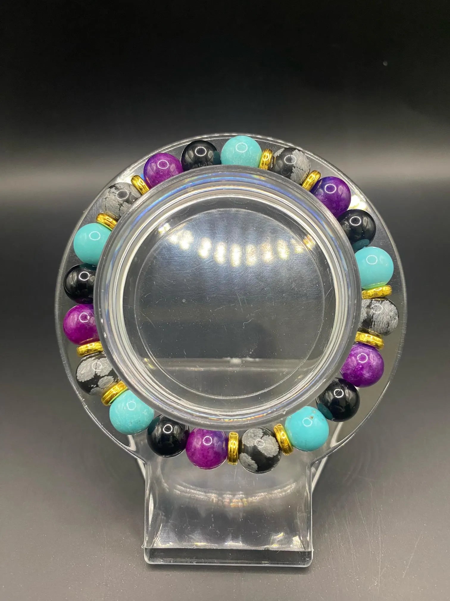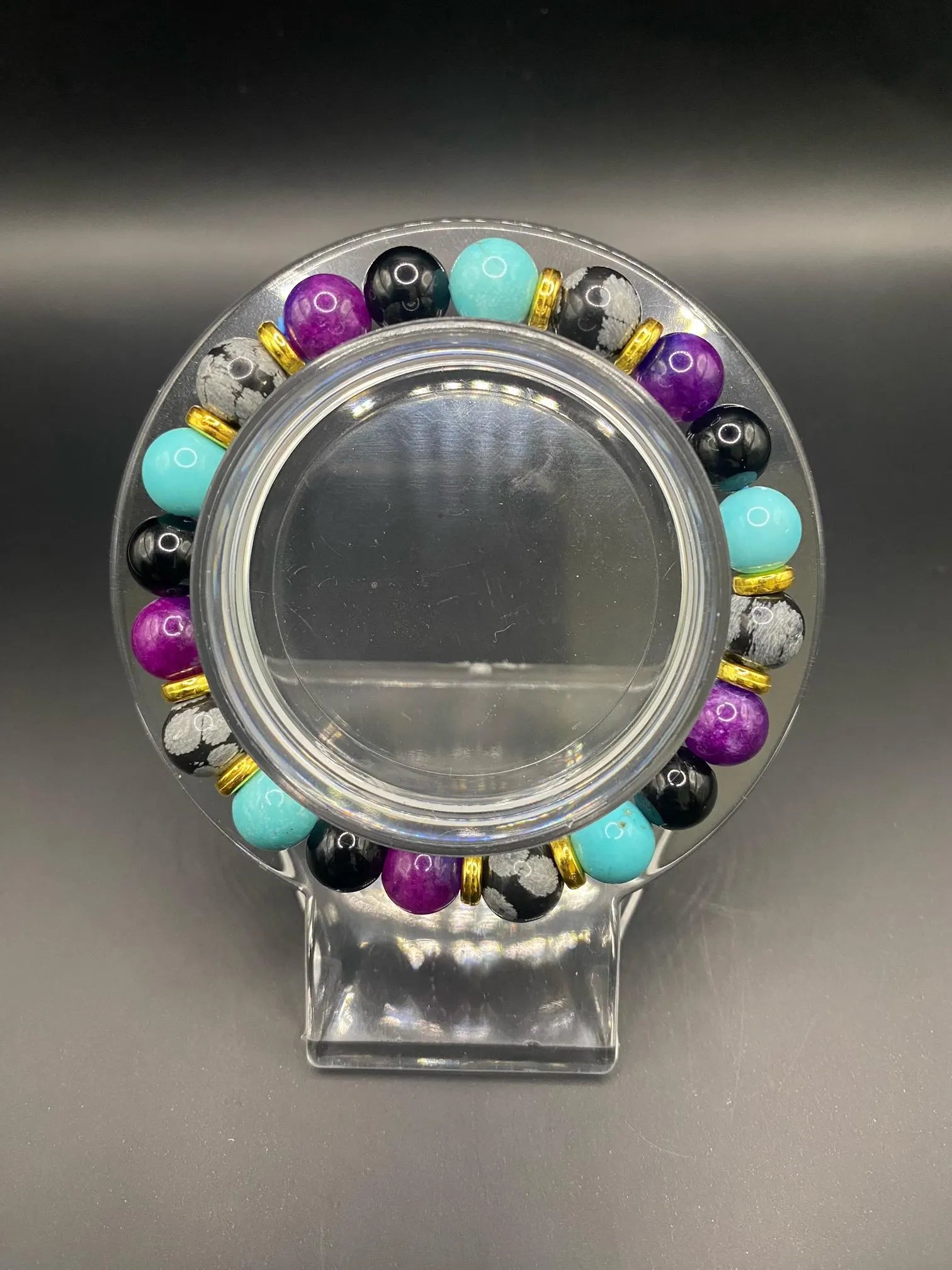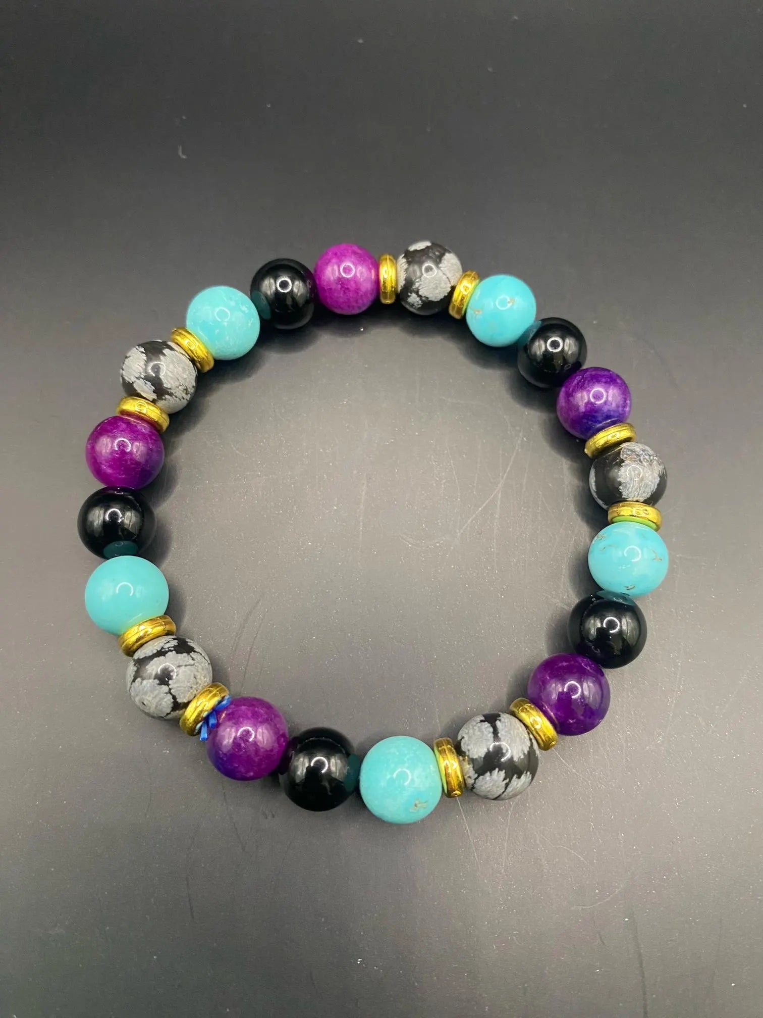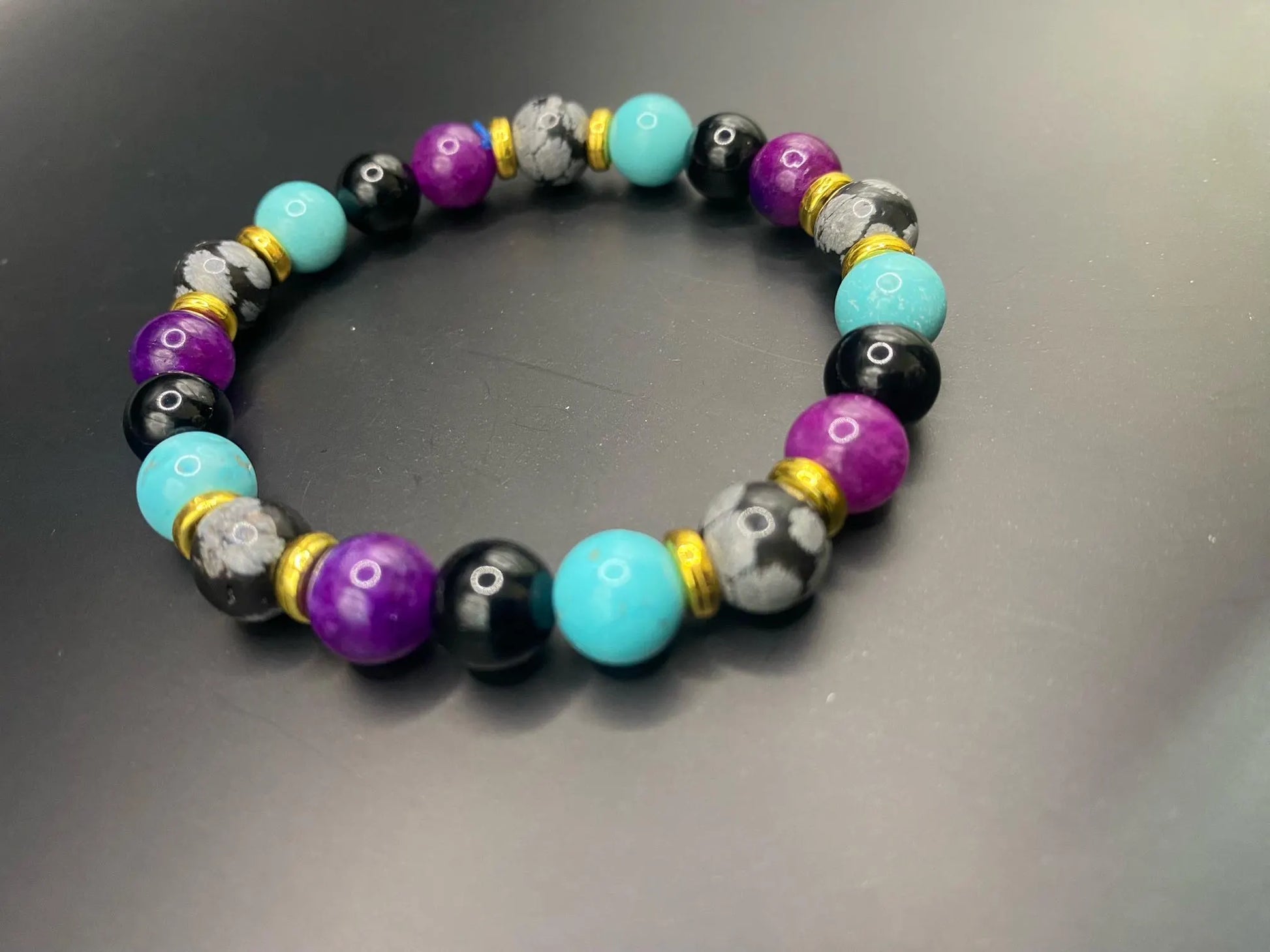 It's made with turquoise, sugalite, obsidian and snowflake obsidian beads with gold spacers <3