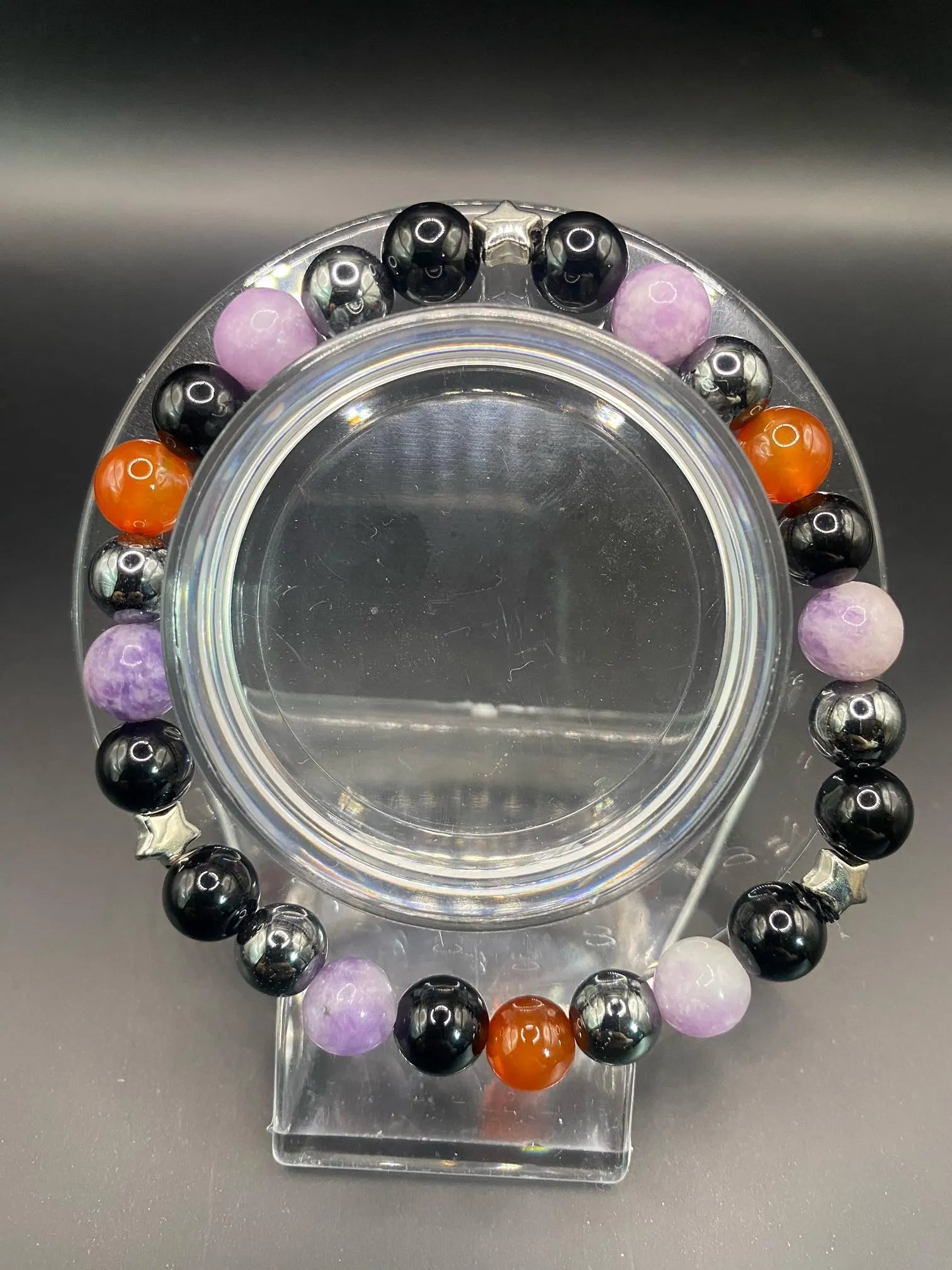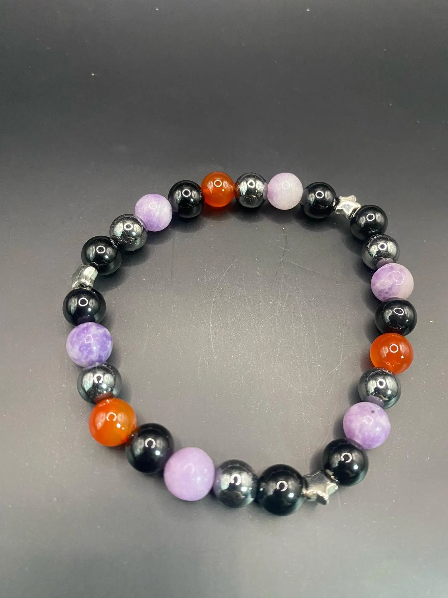 It's made with obsidian, carnelian, hematite and purple lepidolite with silver colored bead and star shaped spacers <3