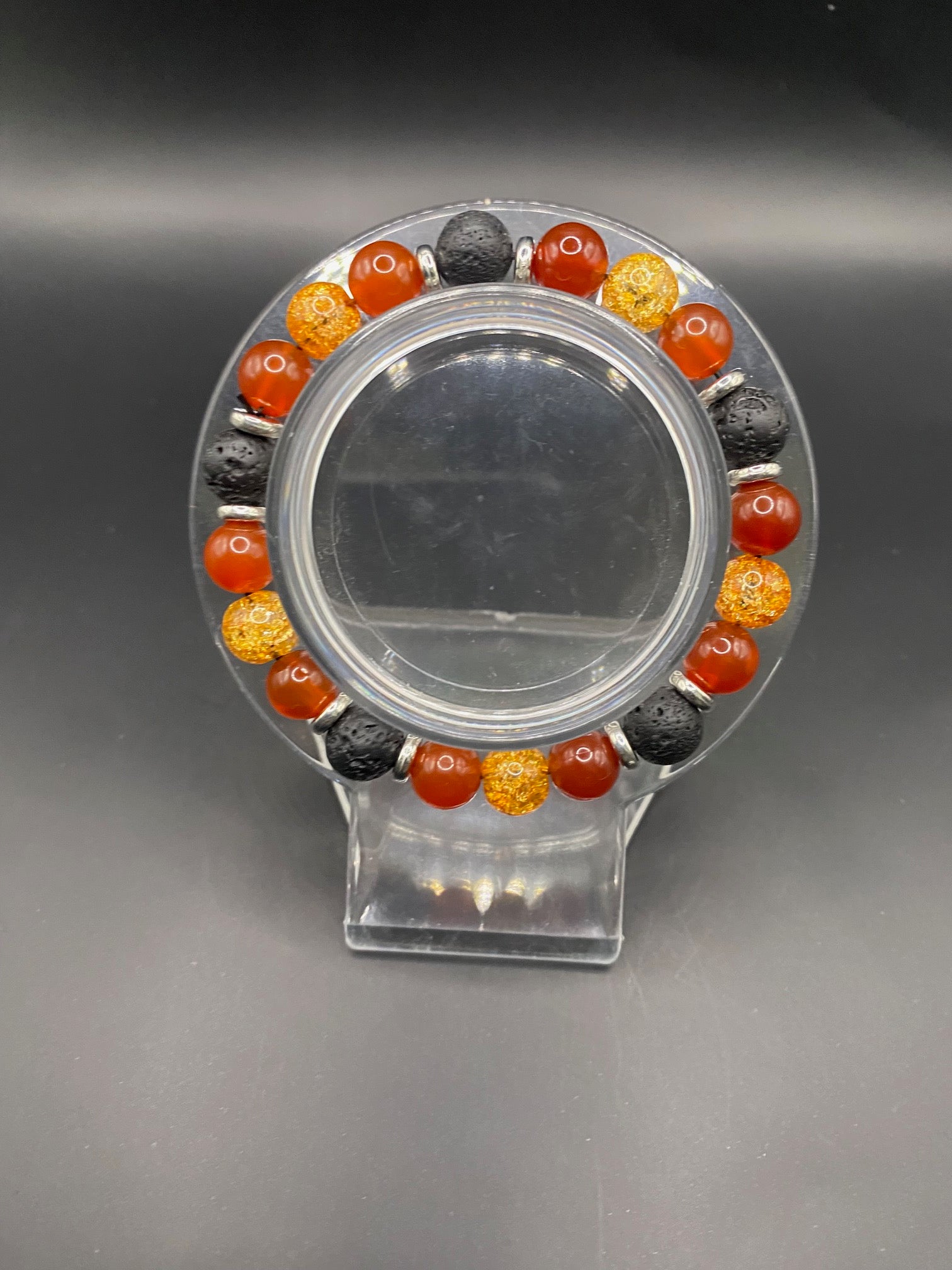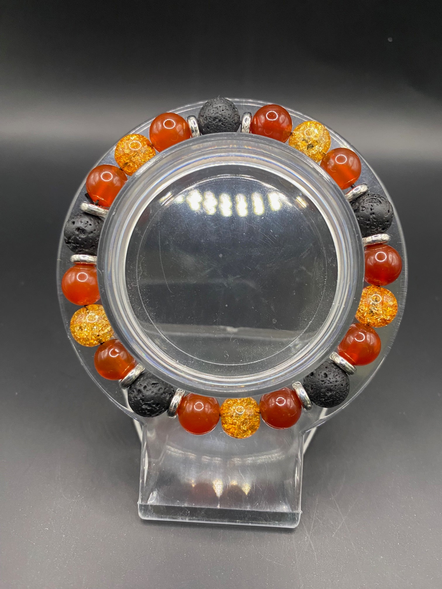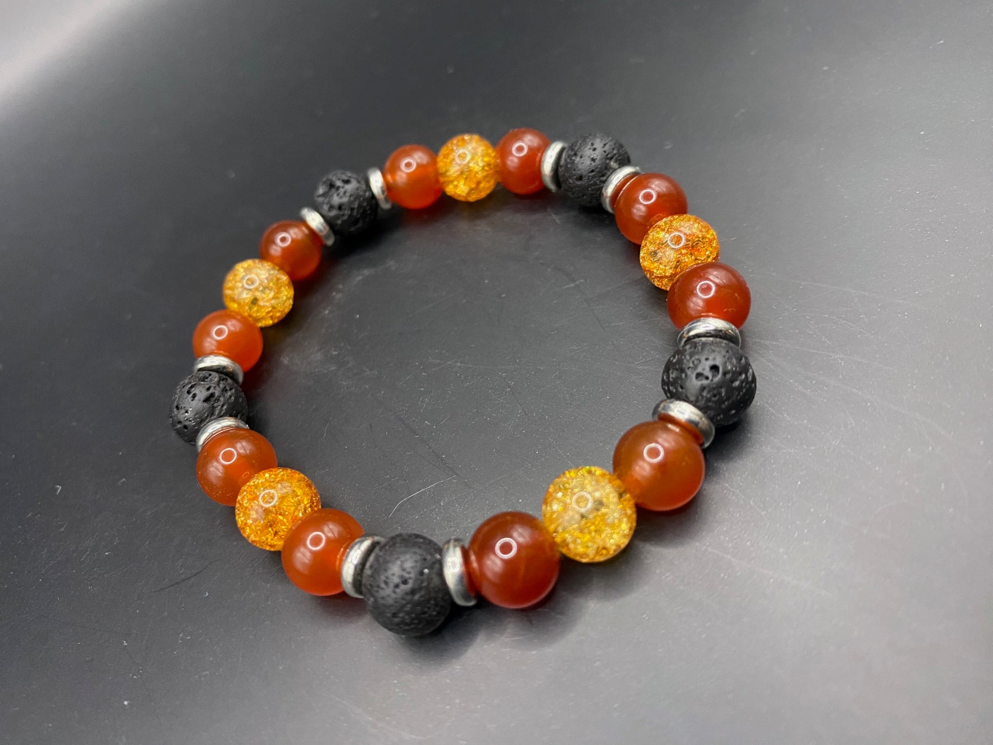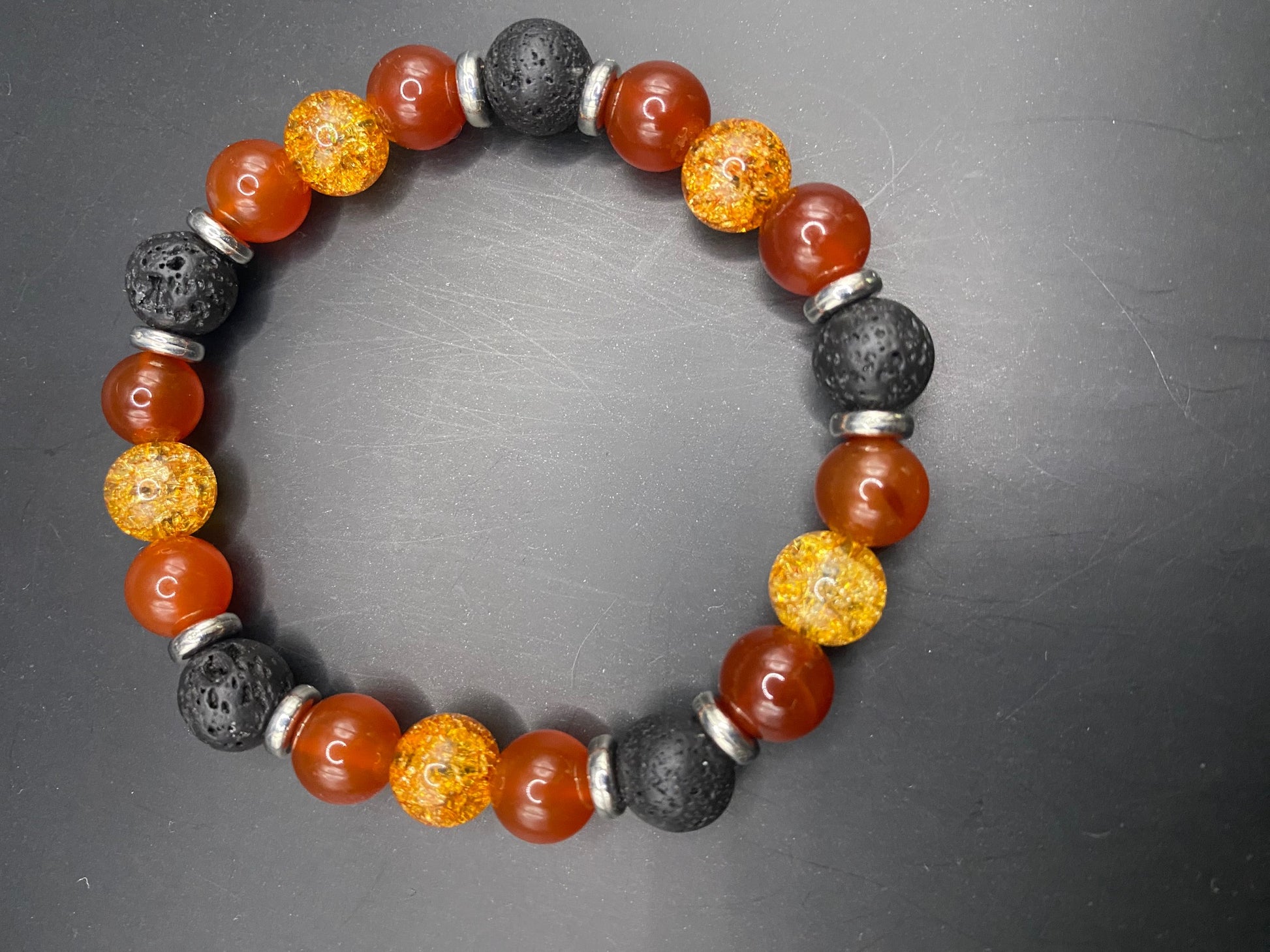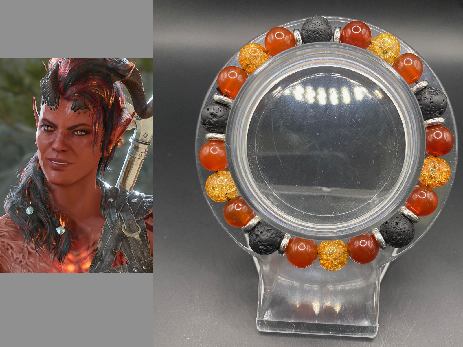 Handmade real crystal bracelet! This piece is modeled after Karlach from Baldur's Gate 3! It's made with red aventurine, red coral jade and lava stone beads with gold and silver colored spacers <3