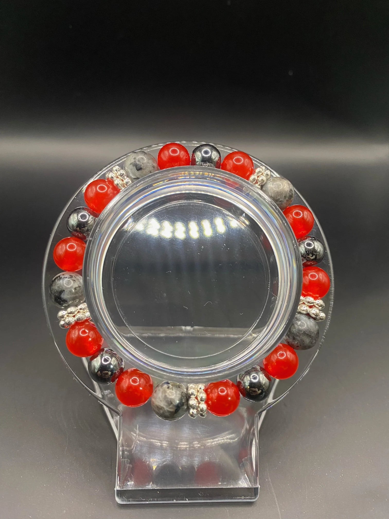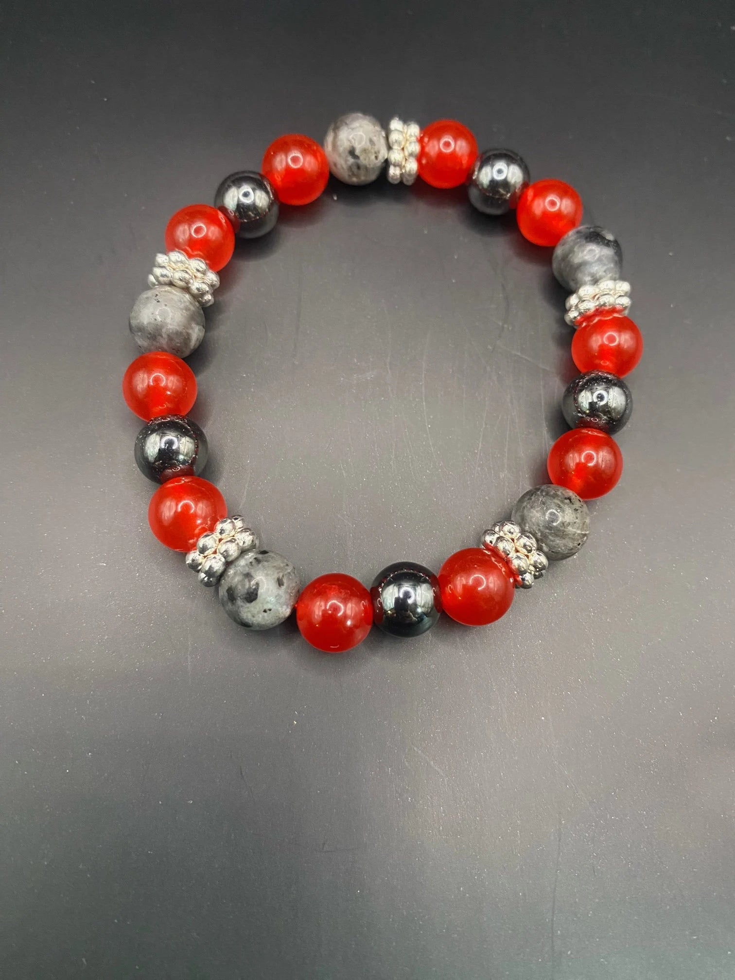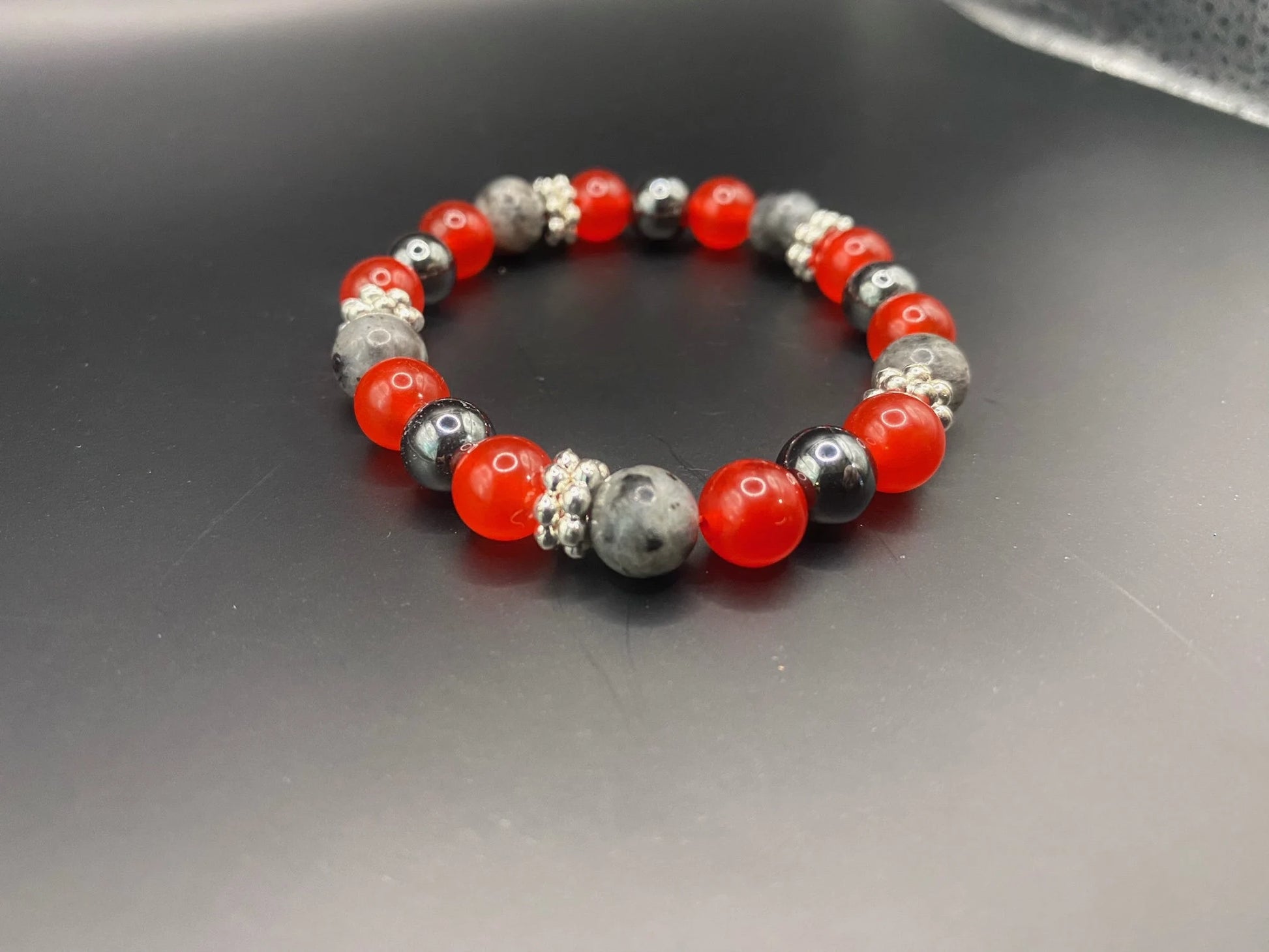 It's made with hematite, lava stone, red coral jade and larvikite with silver colored spacers <3