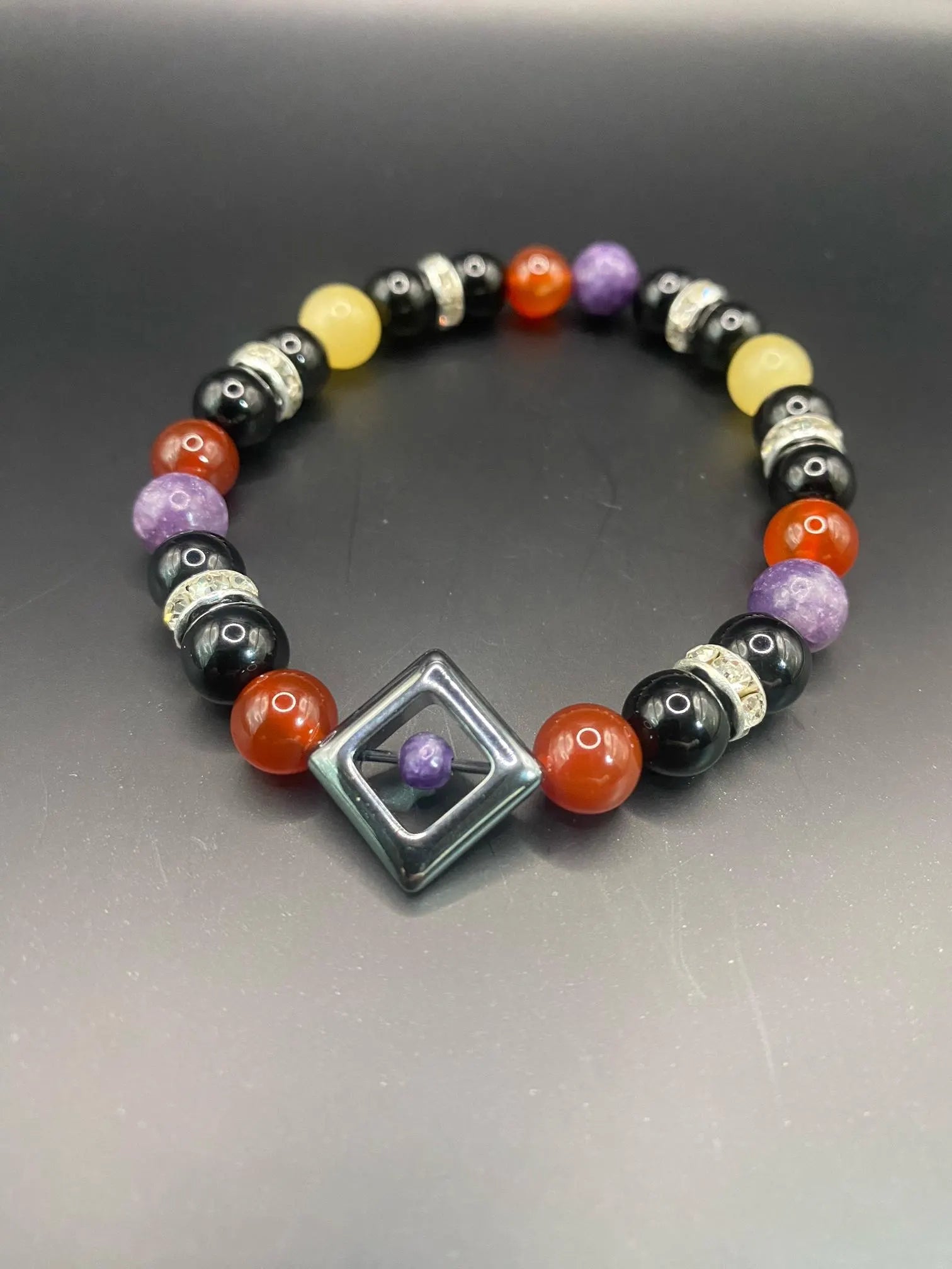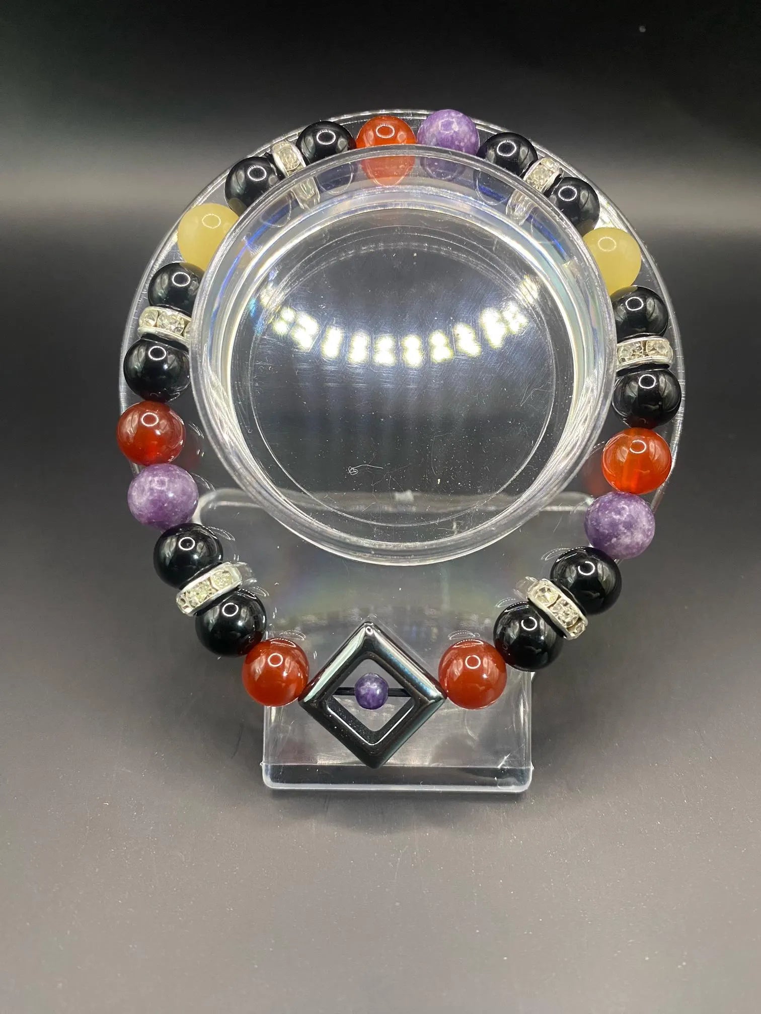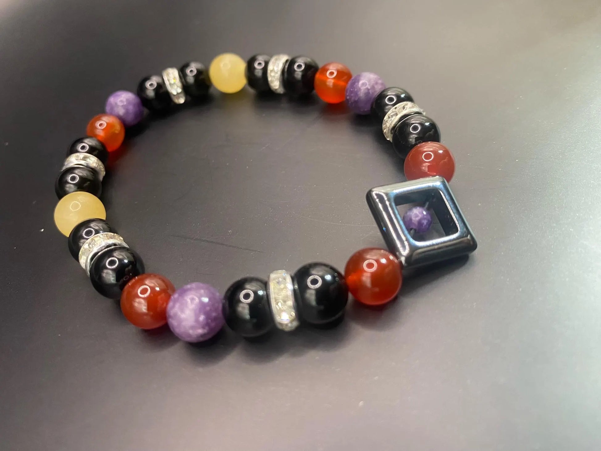 It's made with honey calcite, obsidian, carnelian and lepidolite with a shaped hematite piece as well as silver colored spacers <3