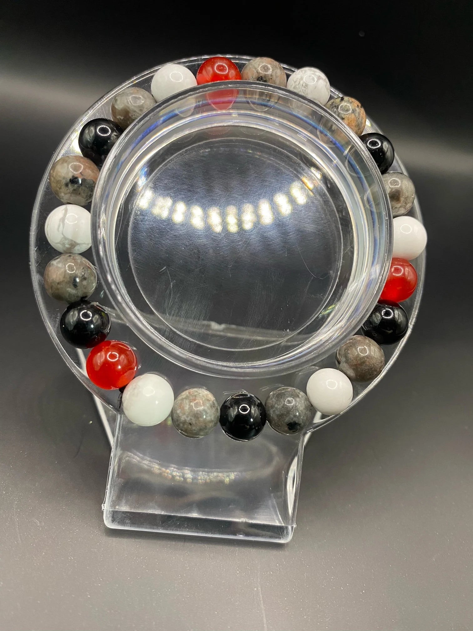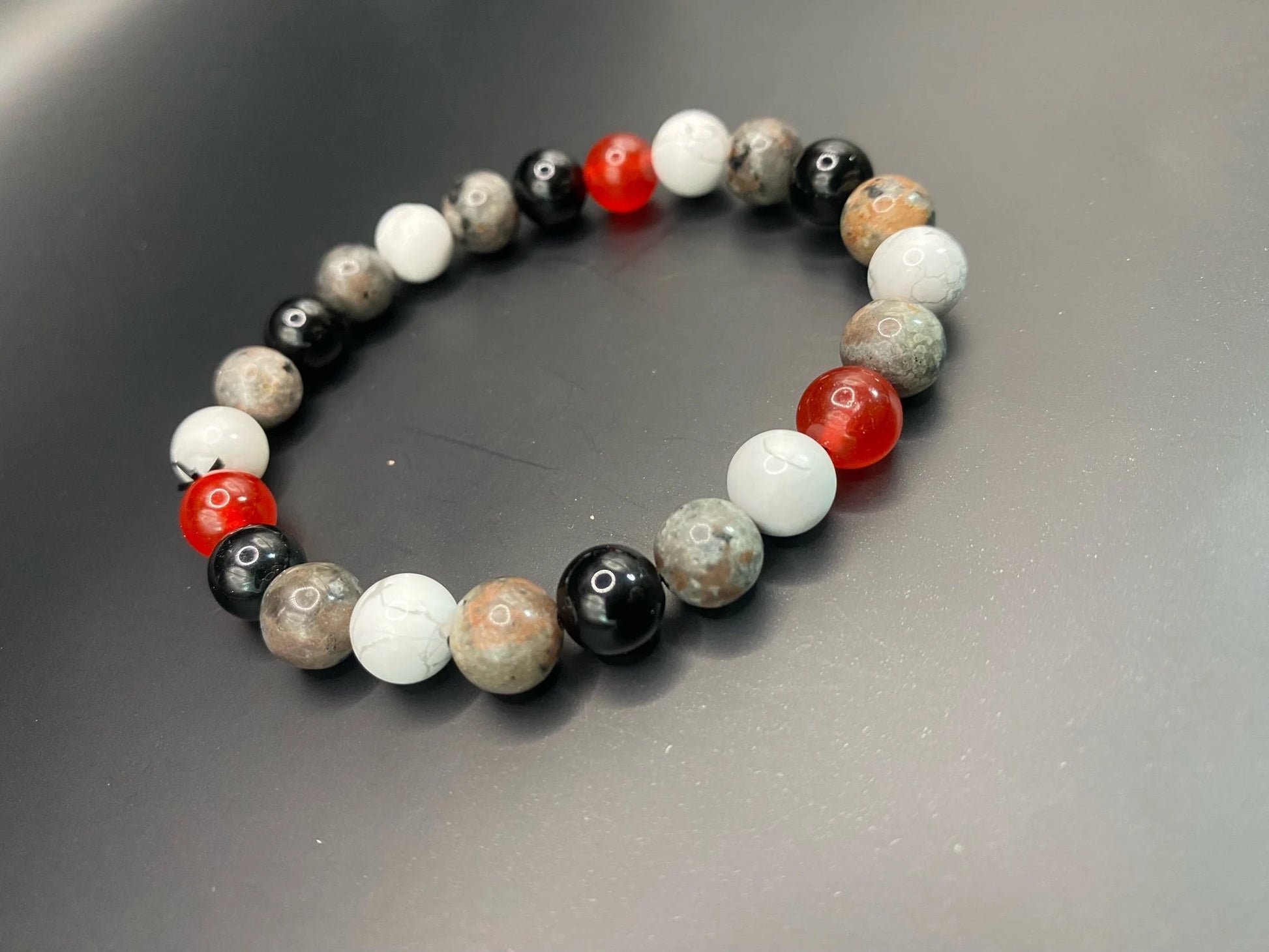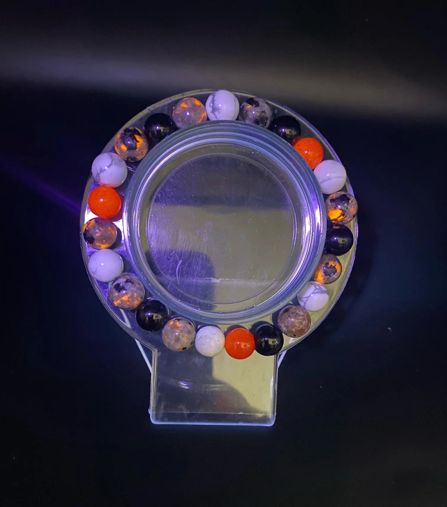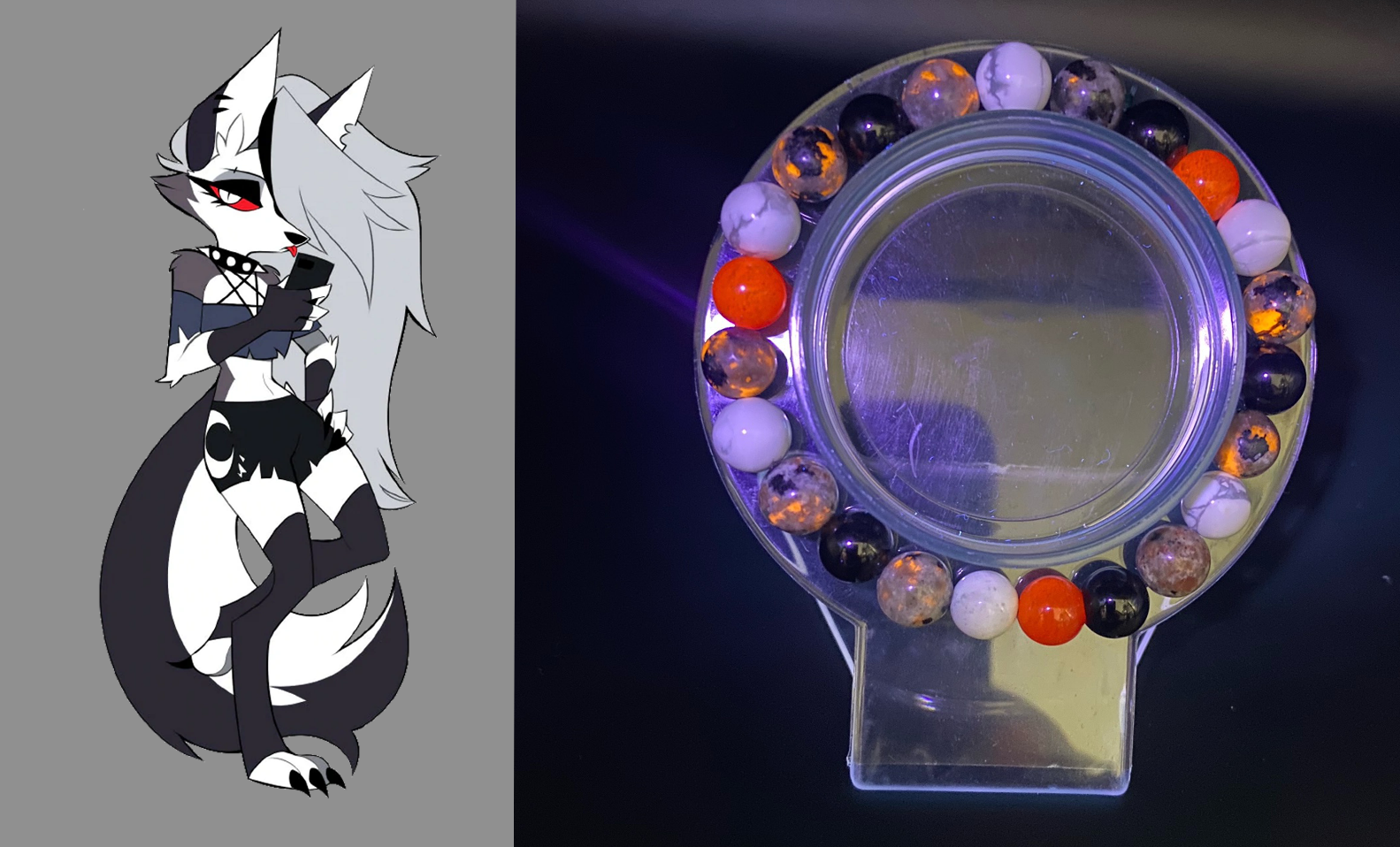 It's made with red coral, Yooperlite (UV reactive), howlite and obsidian <3