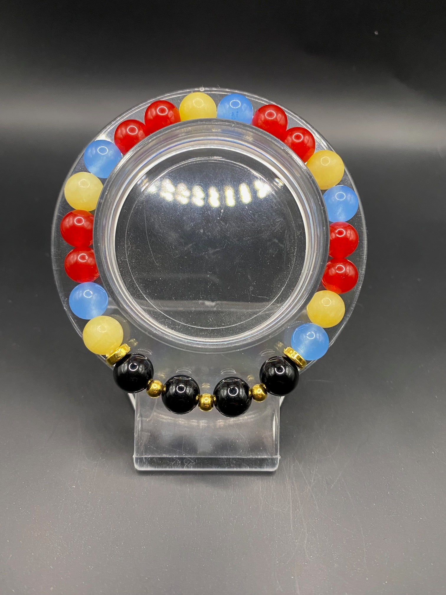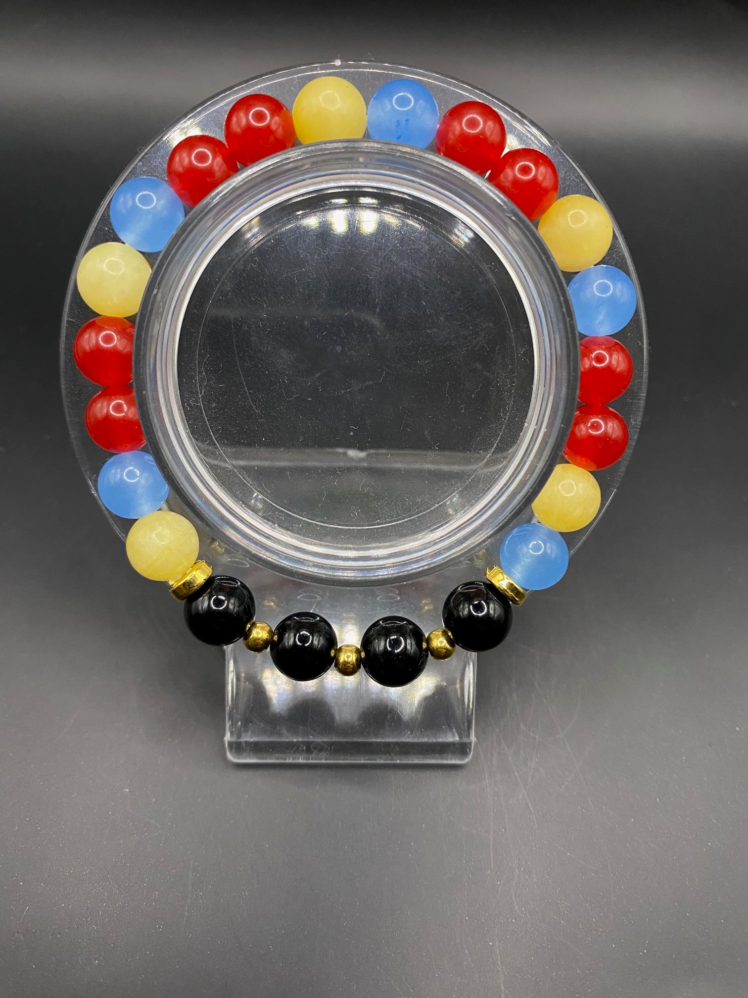 It's made with obsidian, red coral jade, clue chalcedony and honey calcite beads with gold colored spacers <3