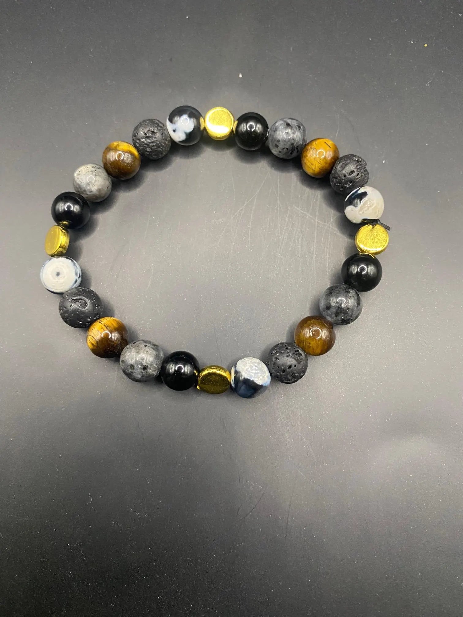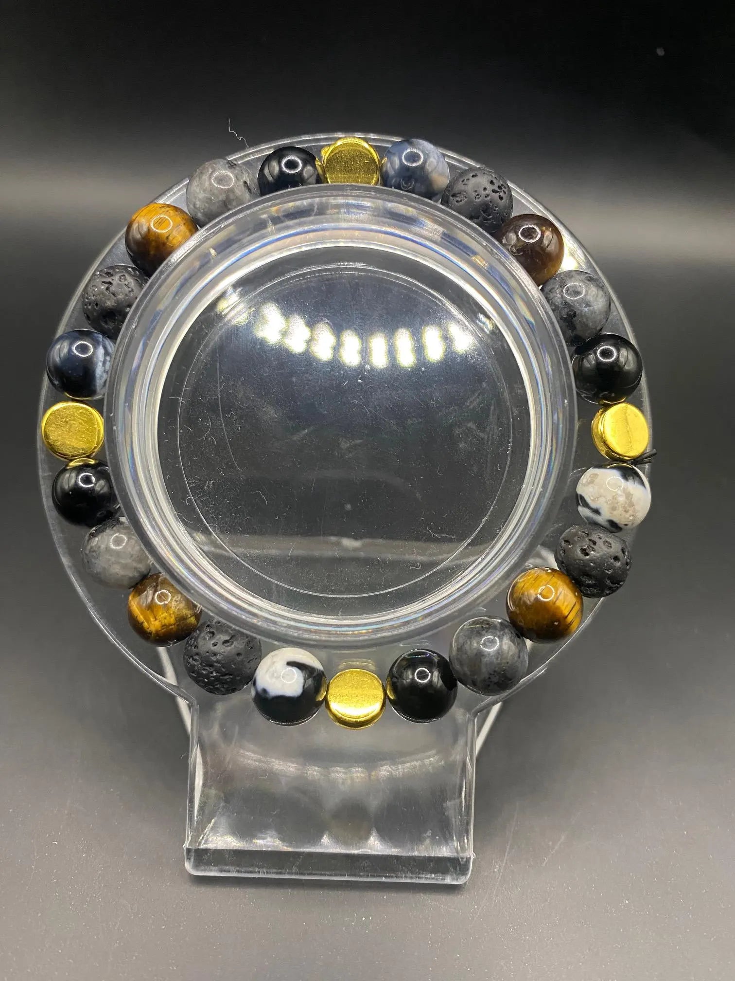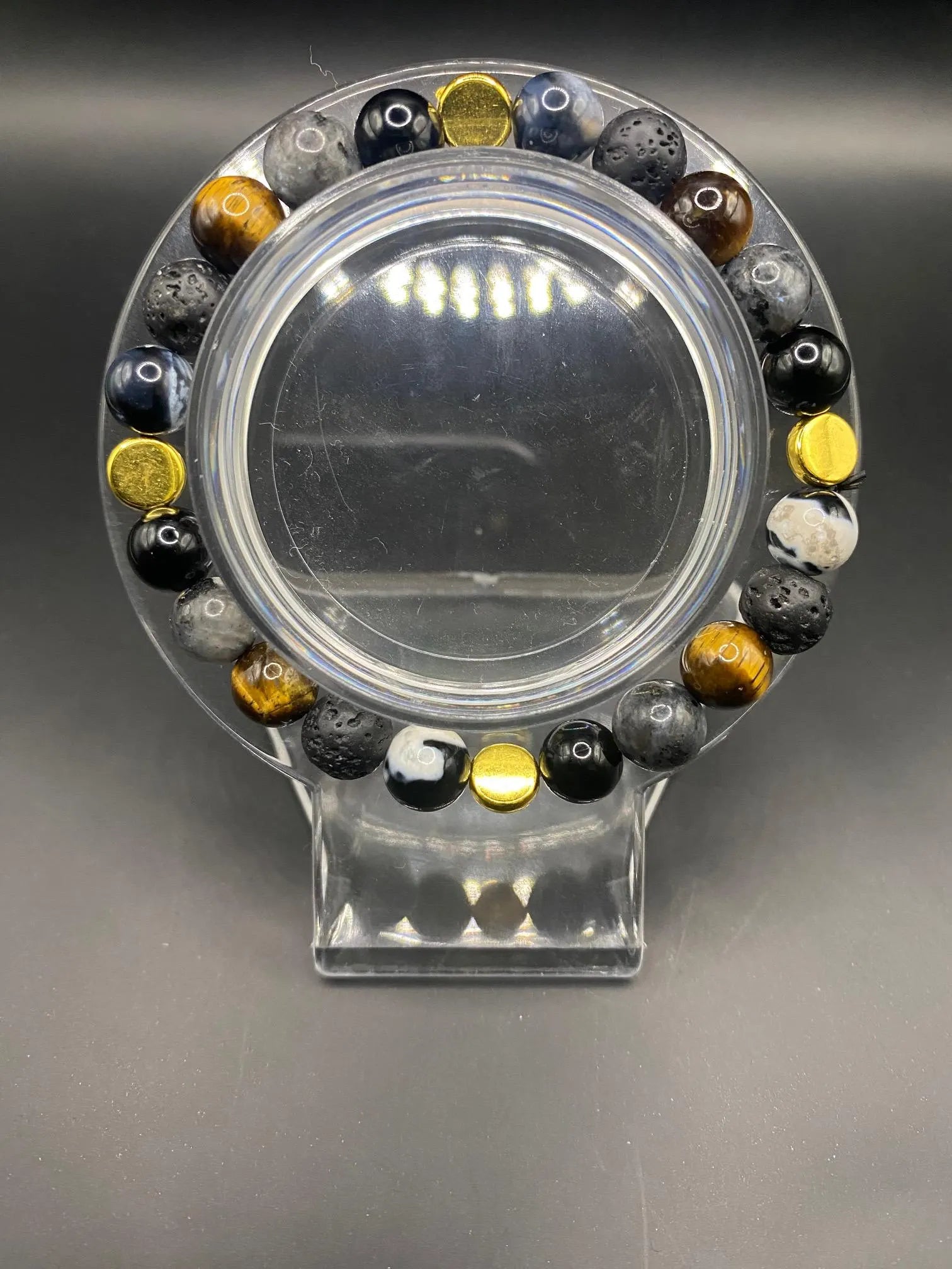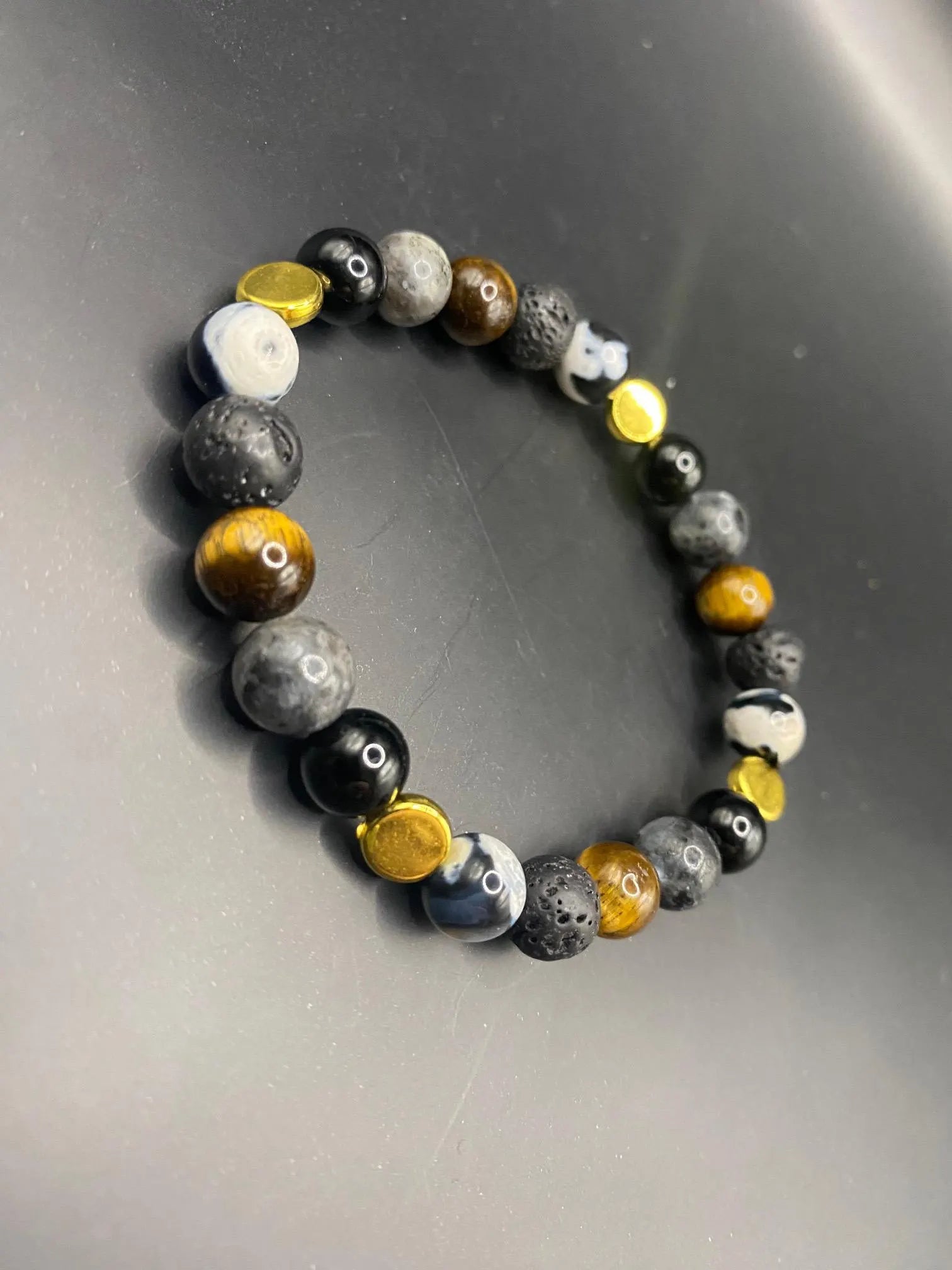It's made with lava rock, orca agate, larvikite, obsidian and tigers eye stones with gold spacers <3
