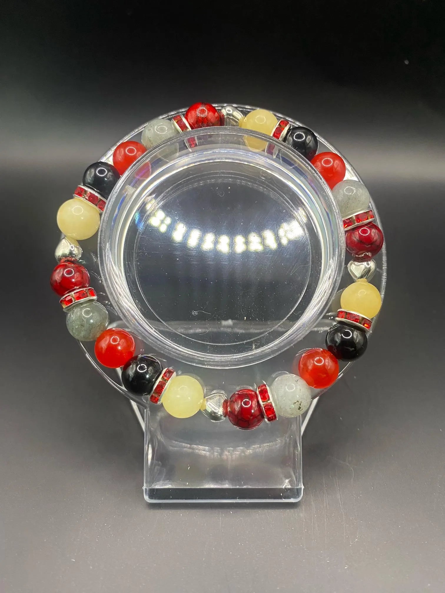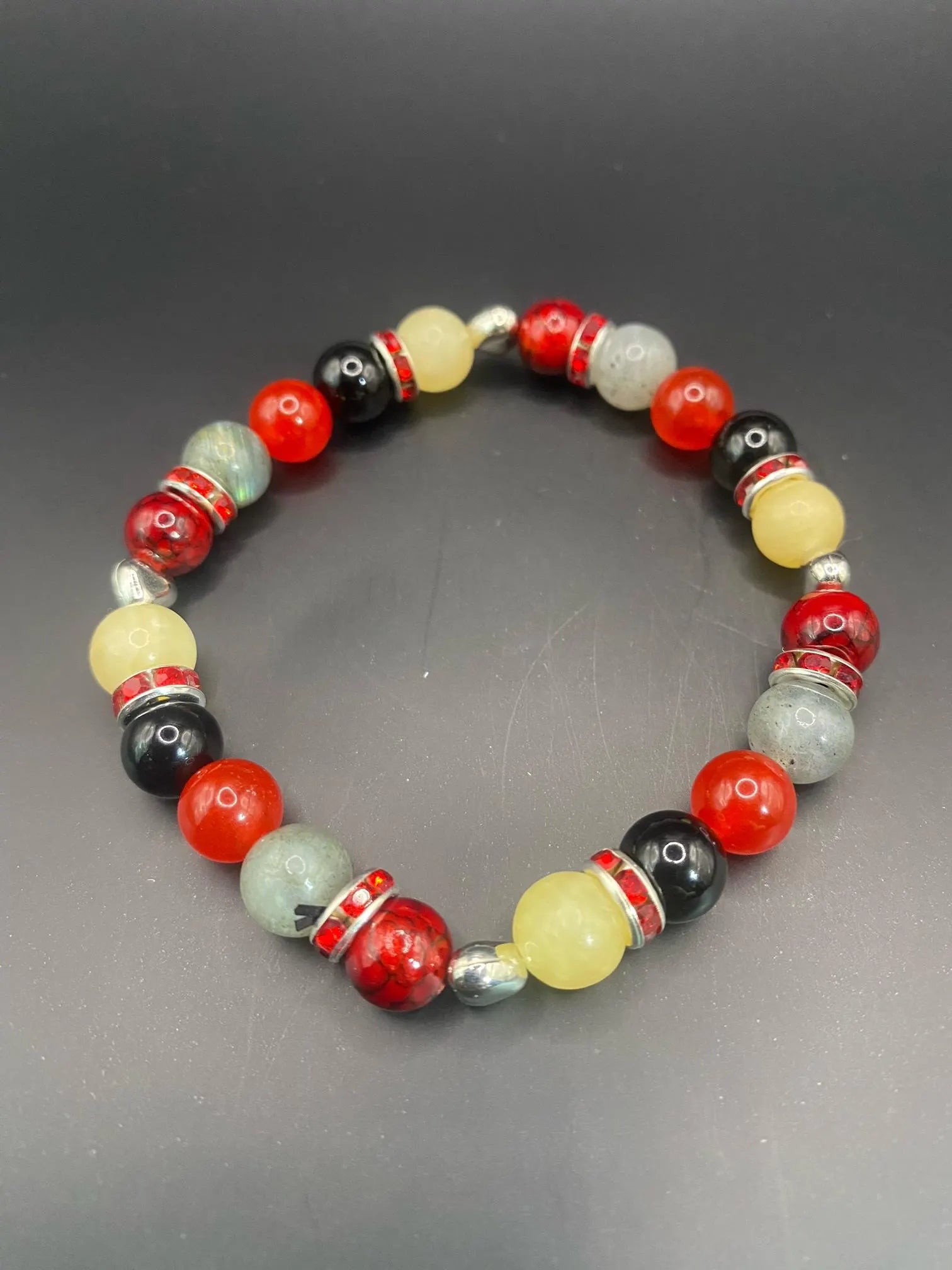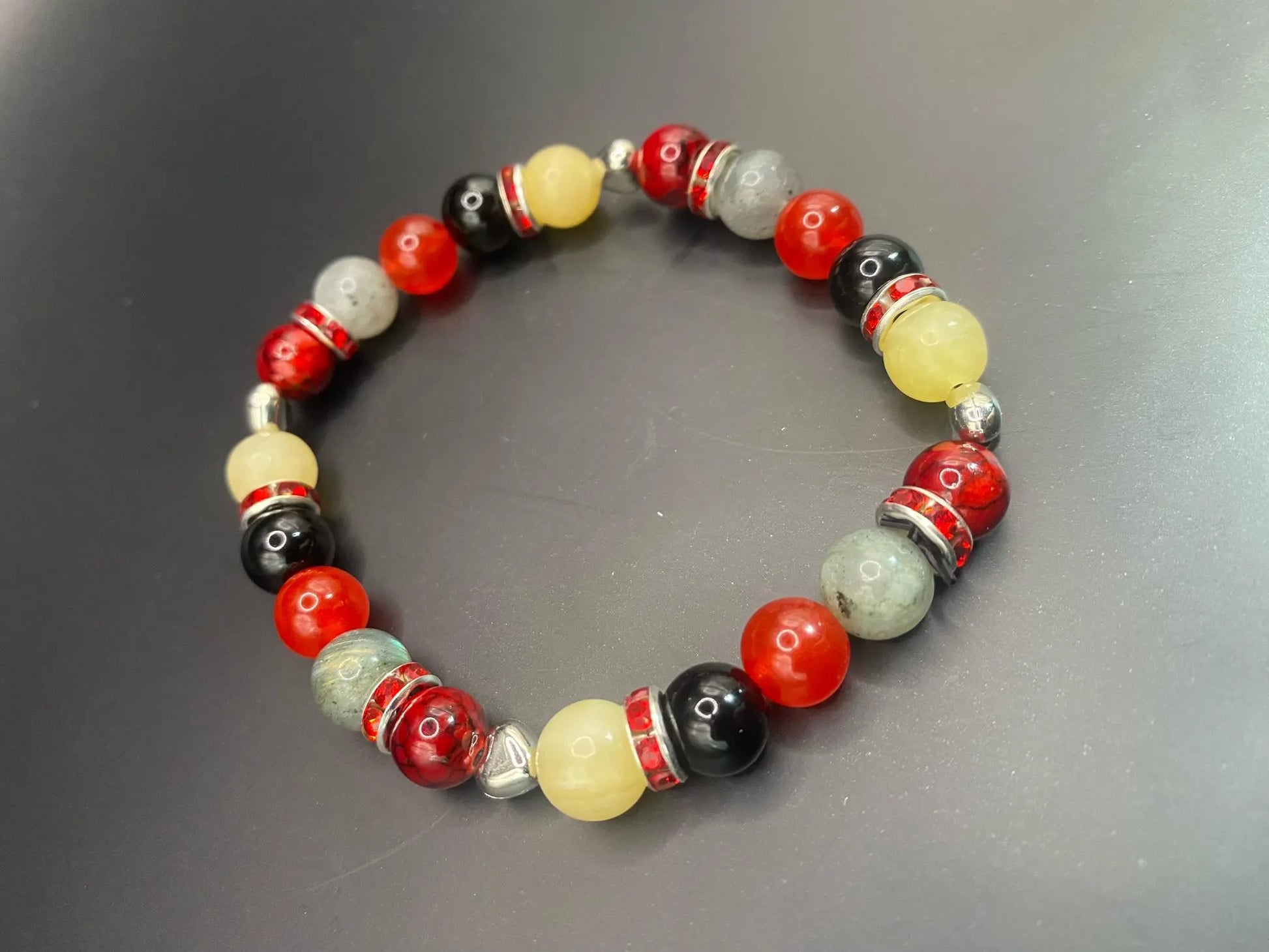 It's made with honey calcite, red quartz (dyed), laborite and red coral jade stone beads with silver colored spacers <3